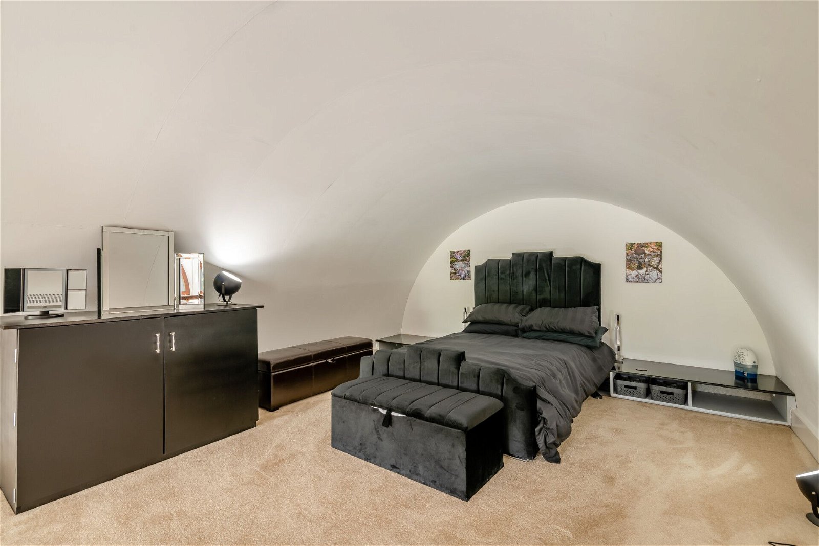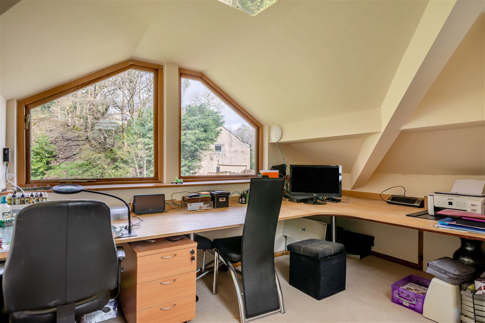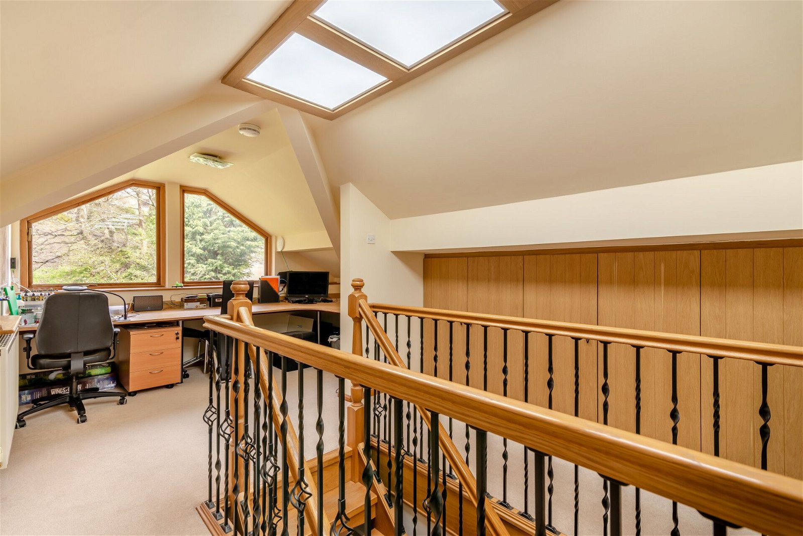 To the first floor there is a study area. The study is known as ‘The flight deck’, with large windows to maximise the elevated view across the grounds extending towards ‘The Portal’ annex. The study is fitted with a bespoke desk and offers a wonderful work from home space. There is a fantastic amount of storage space with built in cupboards and a full head height boot room.