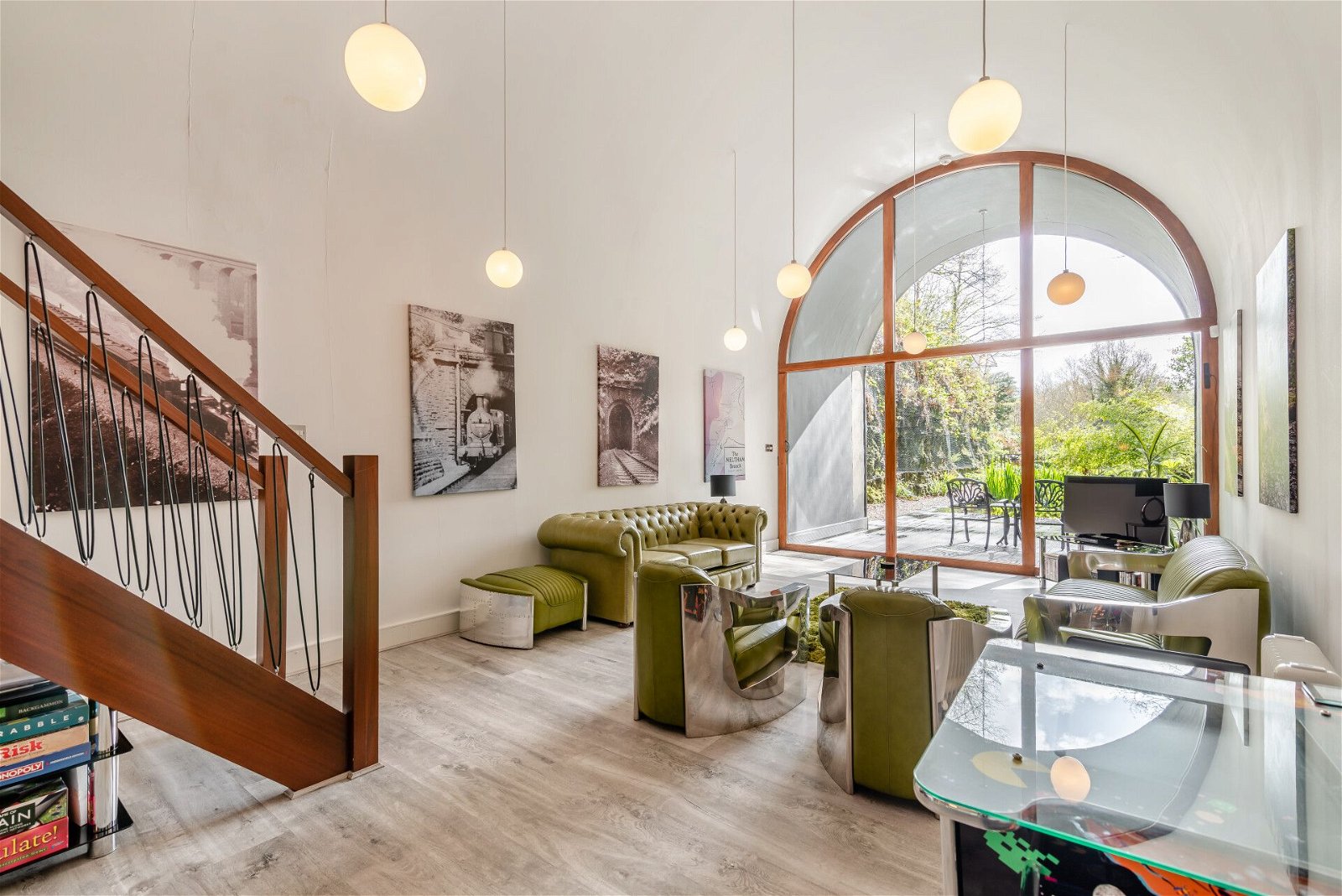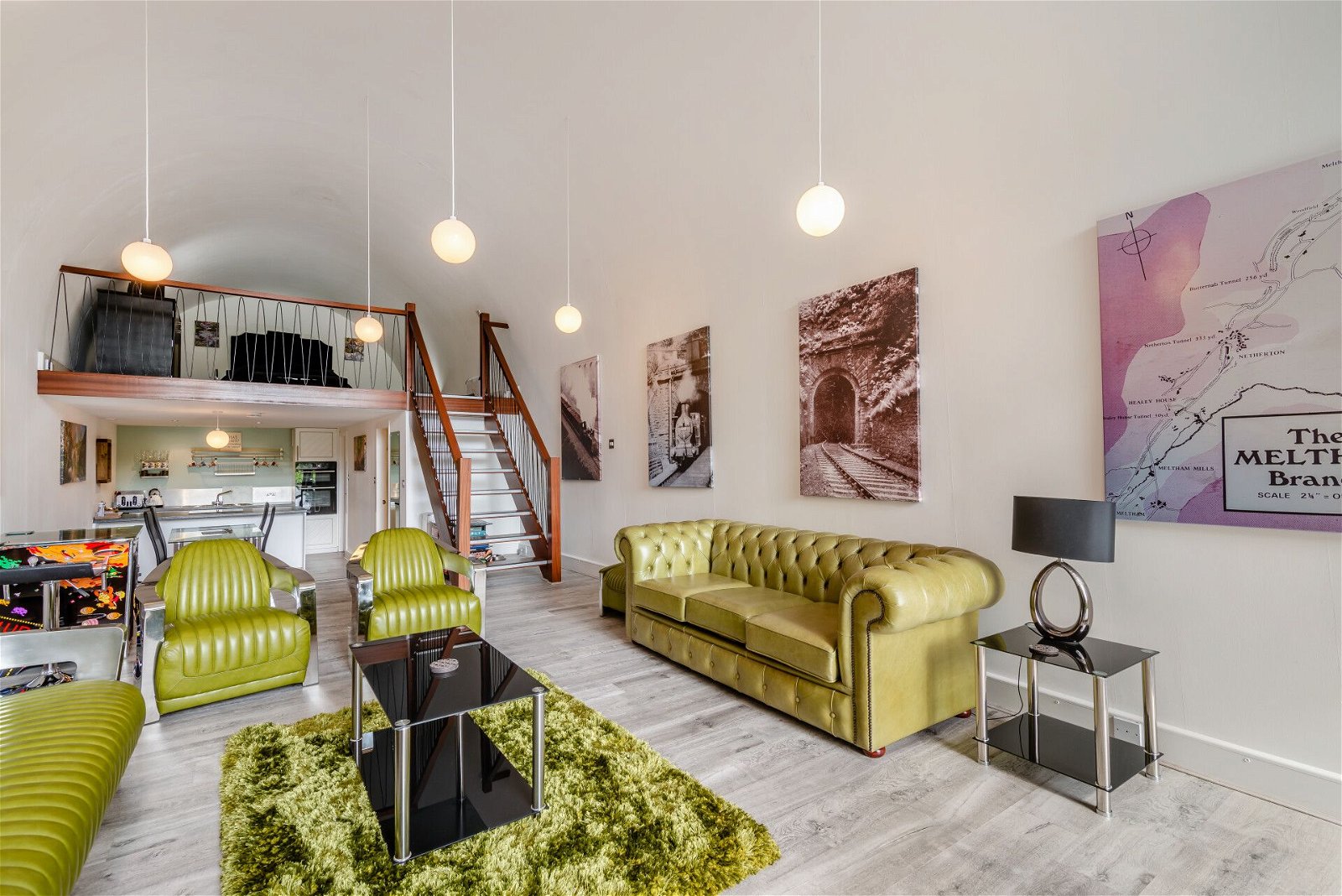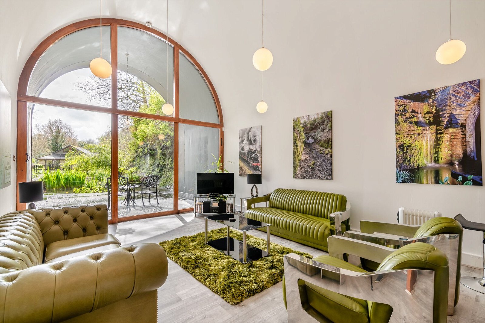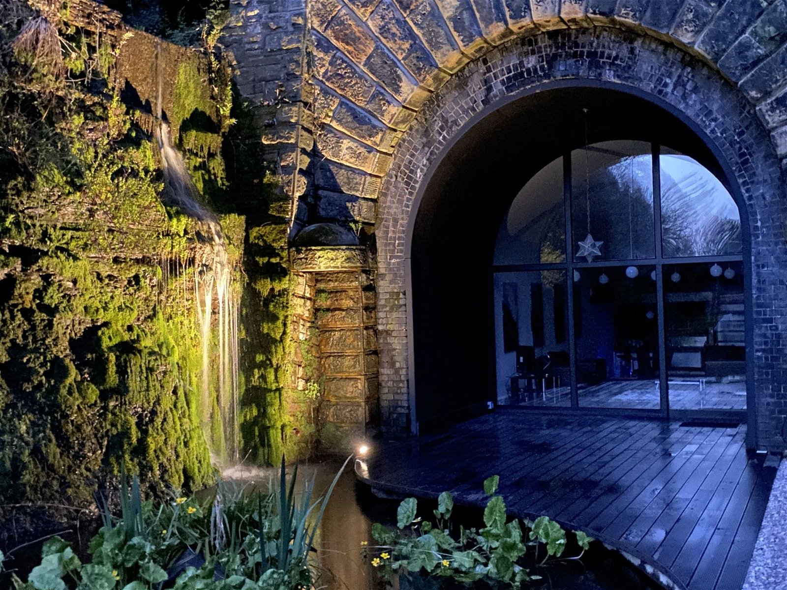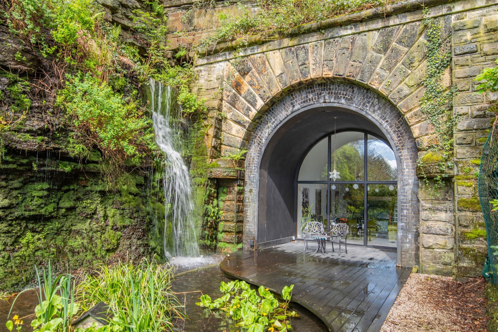 The Portal is a unique annex which is built into a disused railway tunnel. This cleverly designed self contained separate wing is away from the main house, offers accommodation for guests or as the current owners previously did, could be offered as an air B&B. The original railway tunnel was closed in 1966 and was part of the Huddersfield to Meltham line. After the tunnel was no longer in use, what is now known as The Portal was converted into a music and art studio and cinema in the 90’s. Fast forward to 2020 when our clients bought the property, they decided to make it more sympathetic to its history and create a haven for people to enjoy as retreat from every day life, which includes a 30 foot waterfall cascading into a pond and open plan luxury accommodation. With a high degree of privacy, the gated entrance invites you into a magical setting where the sound of falling water is interspersed with bird song. A huge arched double height window is built into the old stone tunnel . The accommodation offers a bright and modern open plan space, comprising a sitting area, dining room, kitchen and shower room, with a mezzanine bedroom. Outside, is a south facing seating area on the terrace next to the waterfall. A tranquil oasis.