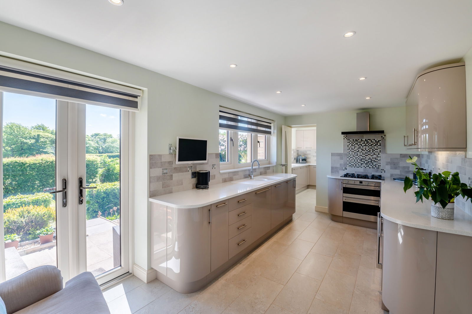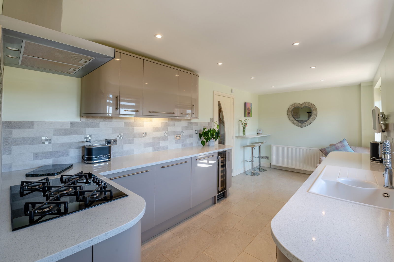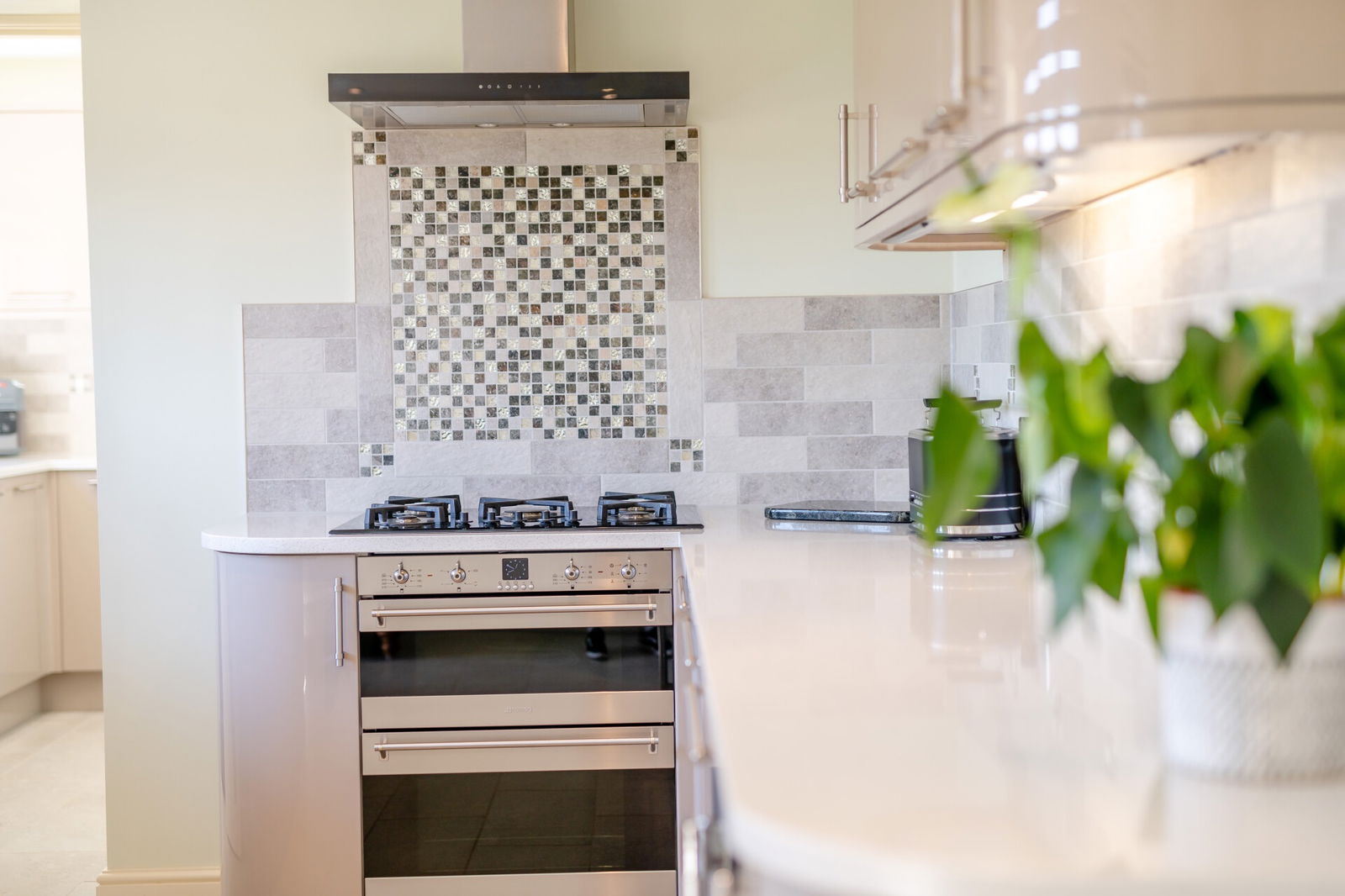 The modern breakfast kitchen is designed with both style and functionality in mind. Neutral modern fitted cabinets are complemented with sleek quartz worktops, while integrated appliances—including a double oven, gas hob with extractor fan, fridge, and dishwasher ensure effortless meal preparation.