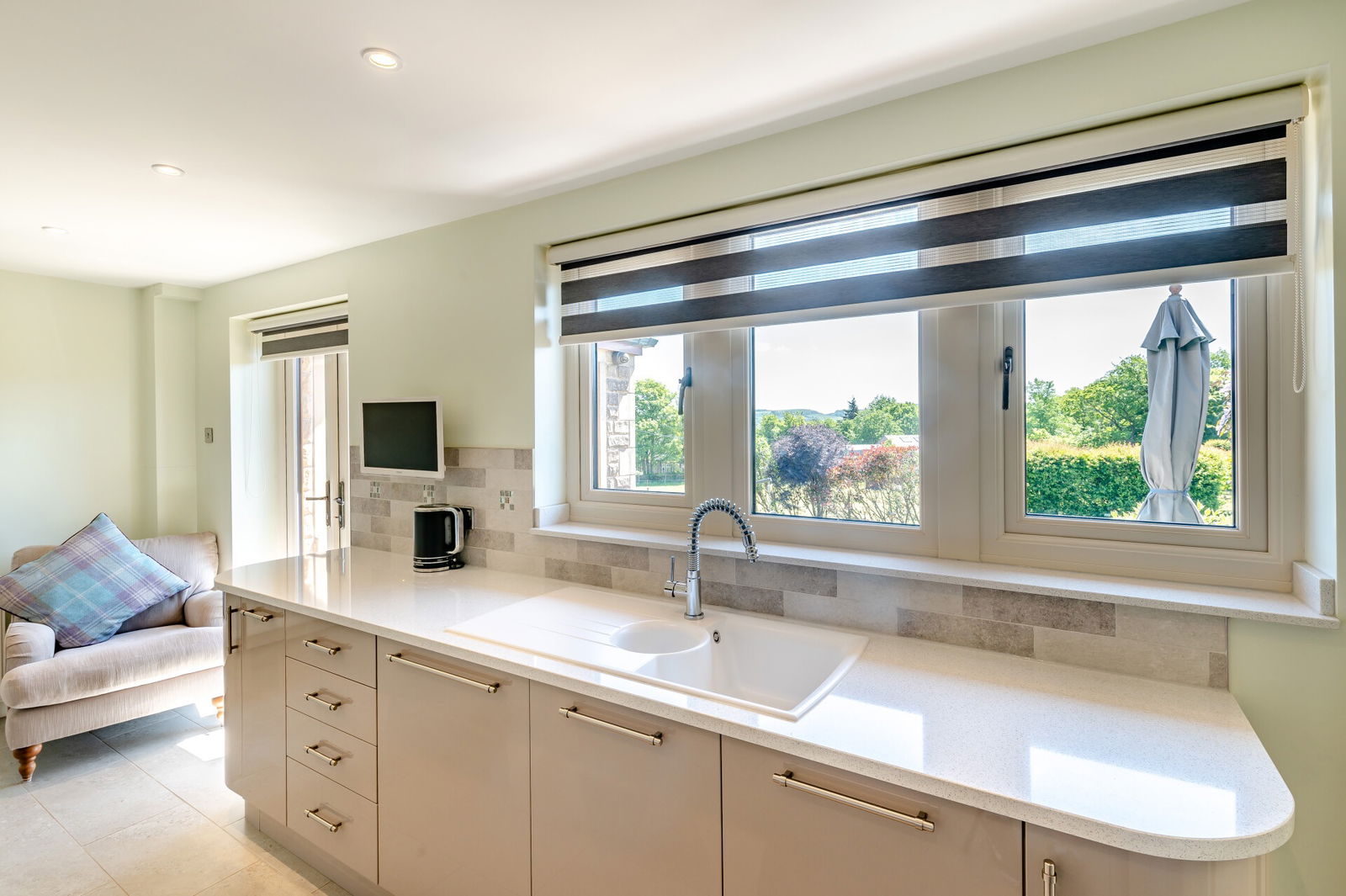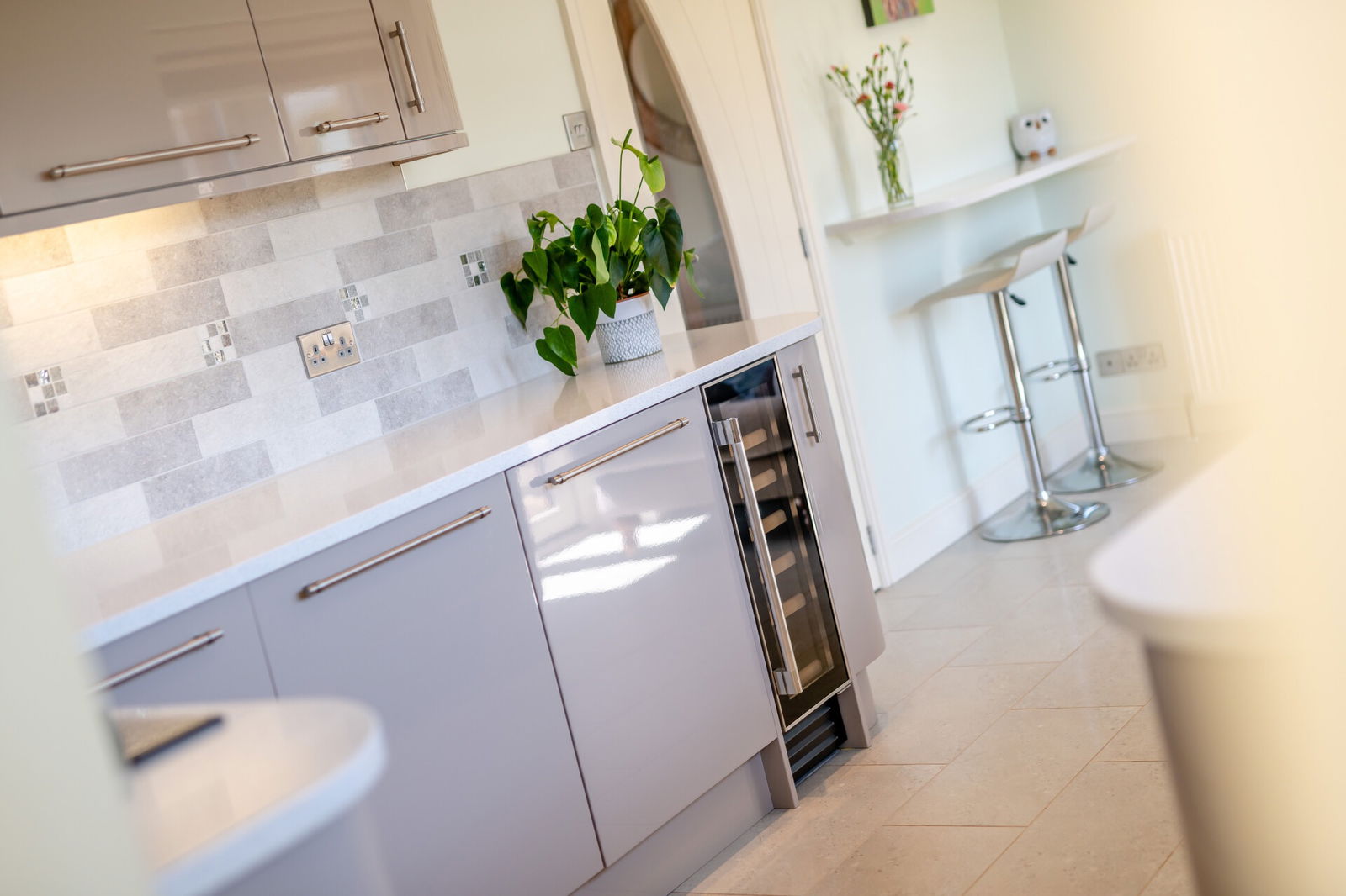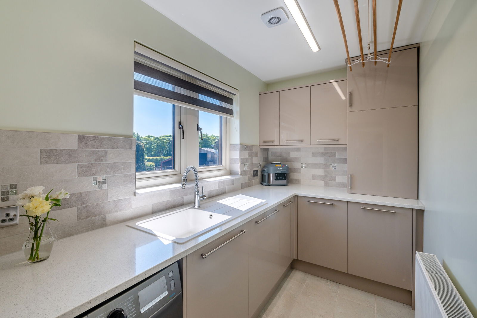 The modern breakfast kitchen is designed with both style and functionality in mind. Neutral modern fitted cabinets are complemented with sleek quartz worktops, while integrated appliances—including a double oven, gas hob with extractor fan, fridge, and dishwasher ensure effortless meal preparation.