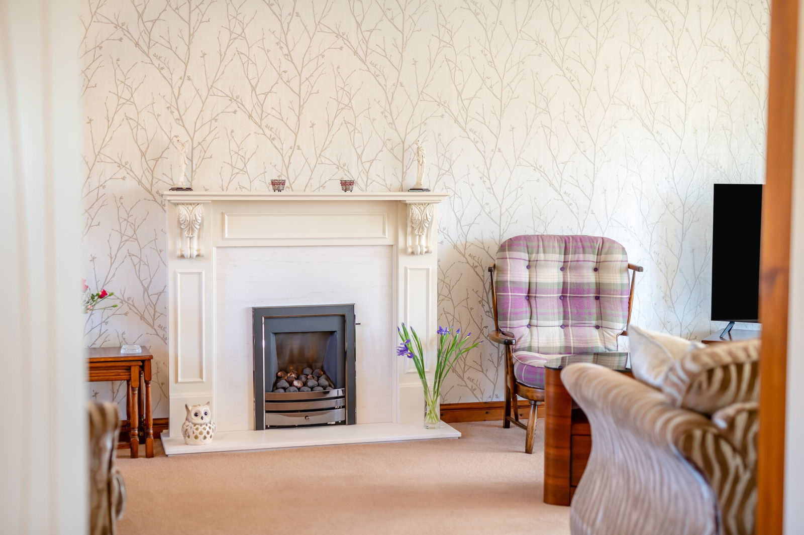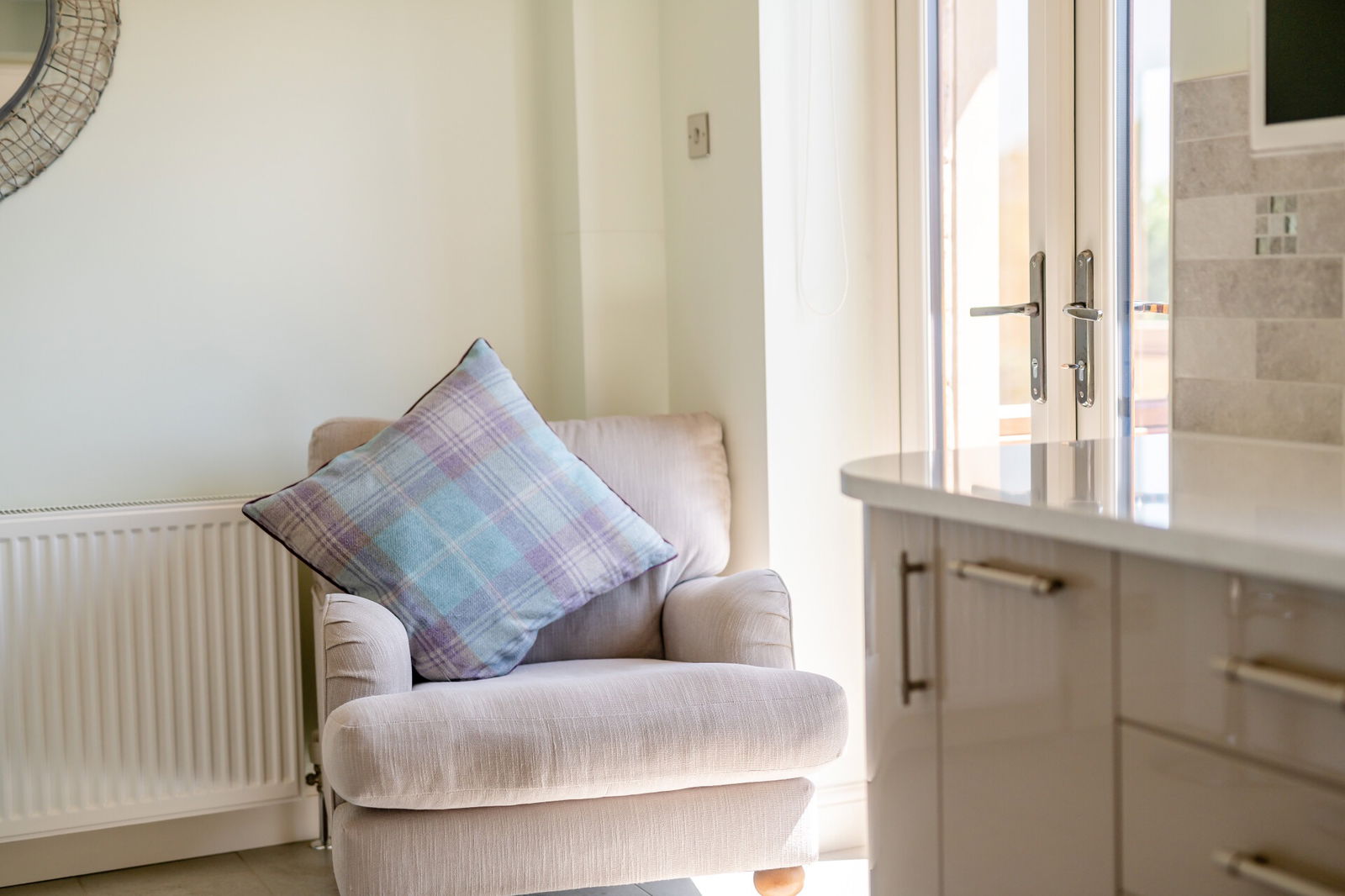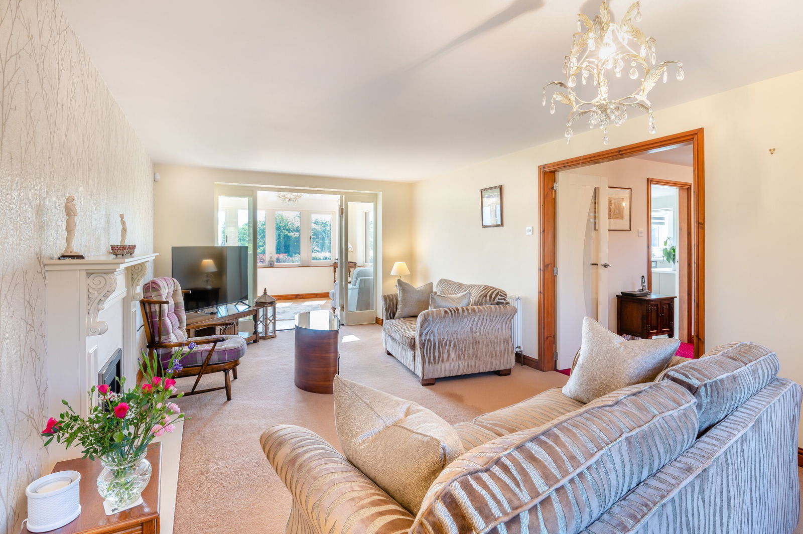 Natural light floods the dual-aspect sitting room, which has a modern gas fire and is complemented by French doors that open into the serene conservatory.
