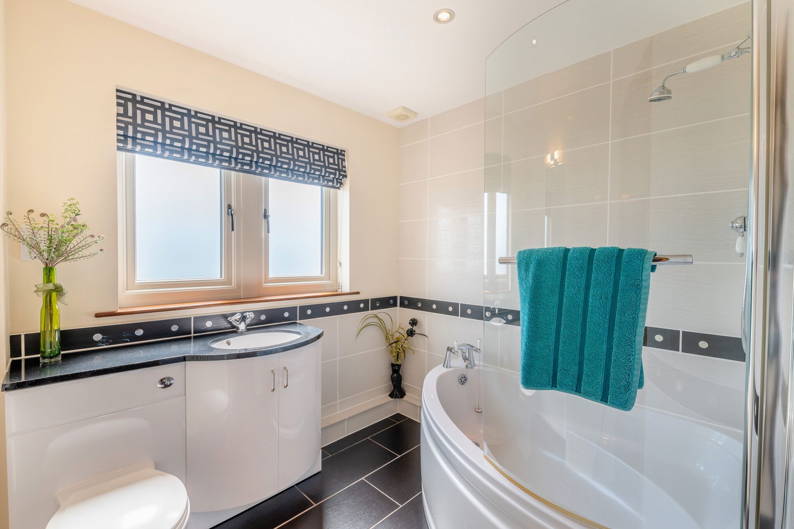 The house bathroom is tastefully appointed, featuring a corner bath with a glass screen,a WC, and a hand wash basin neatly integrated within vanity storage, combining style and practicality.