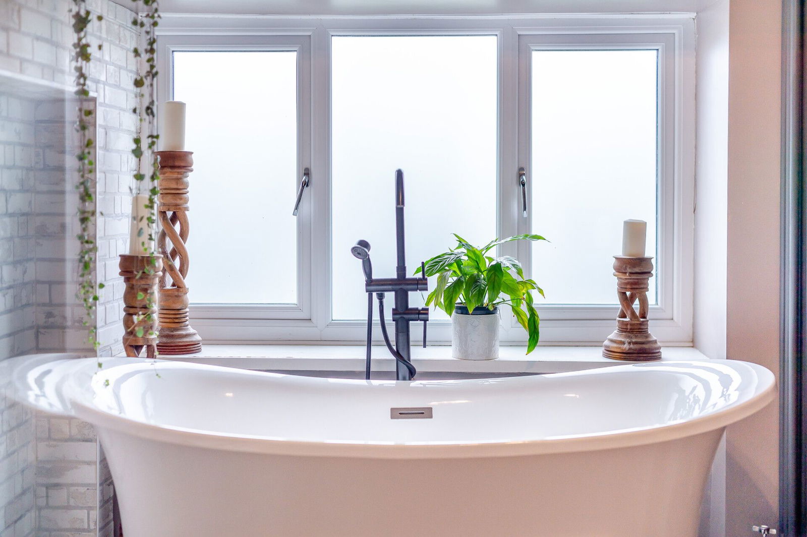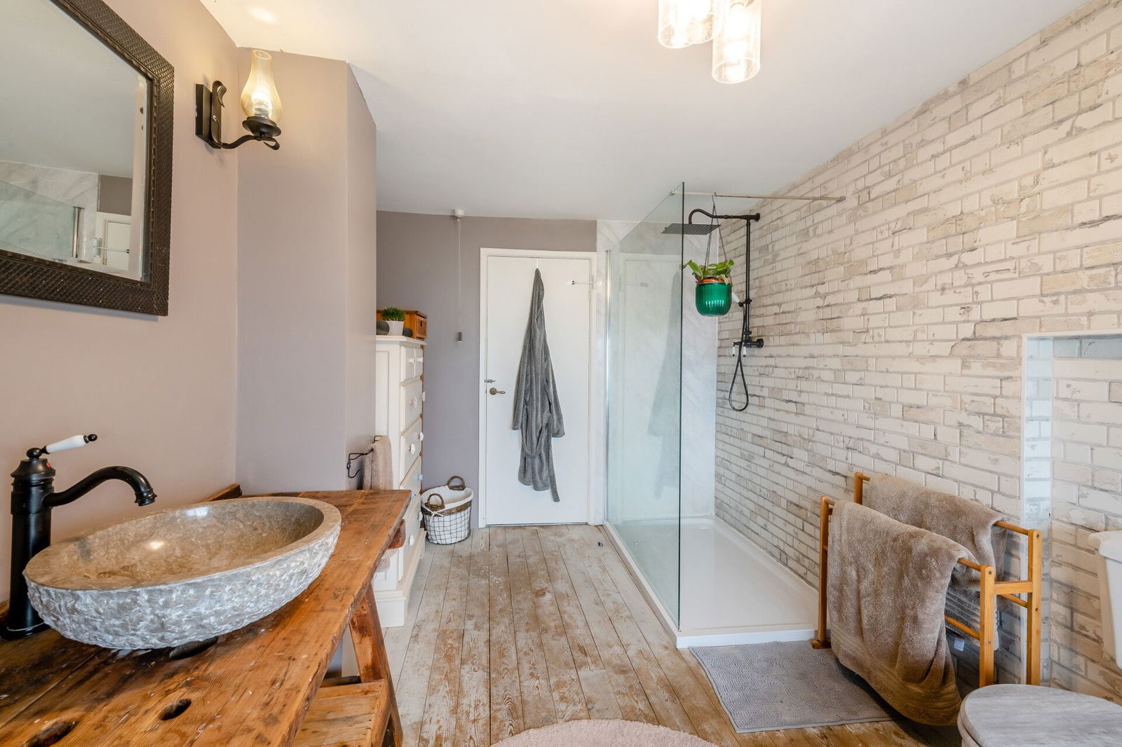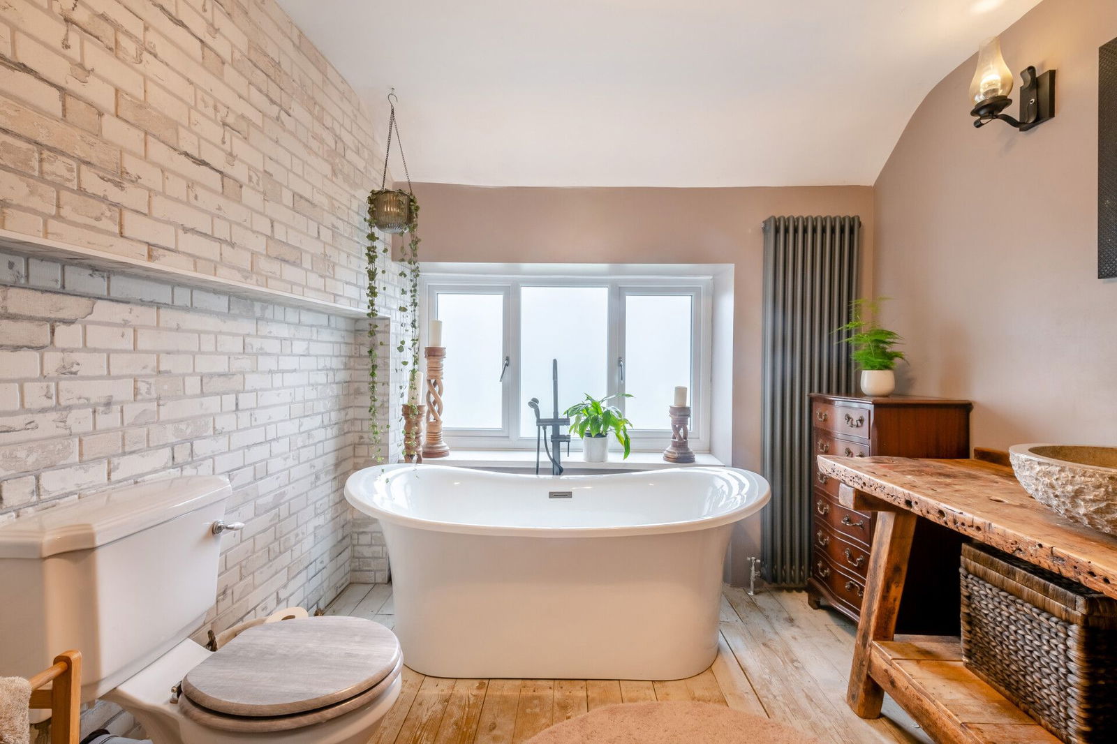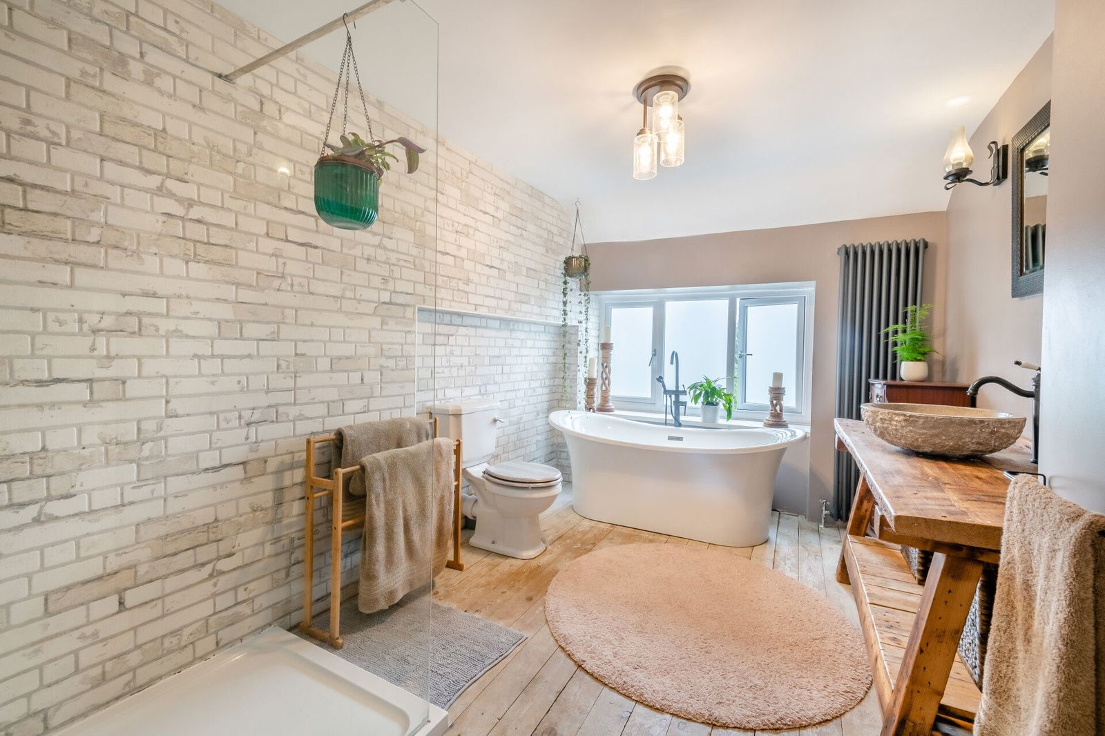 The house bathroom is stunning and has a 4-piece suite which comprises a freestanding double ended bath, separate step in shower cubicle, WC and sink which is mounted on a heavy timber trestle. There are exposed timber boards to the floor, an exposed stone effect tiled wall of which complements the stone window cill and a tall standing radiator.