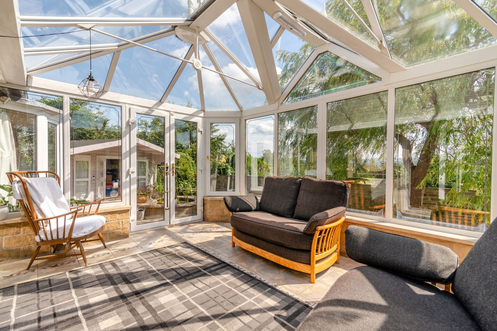 The garden room enjoys a fantastic open-aspect view across the property's gardens and valley beyond, has tiling to the floor and French doors out to the patio seamlessly connecting the outdoors to the inside.