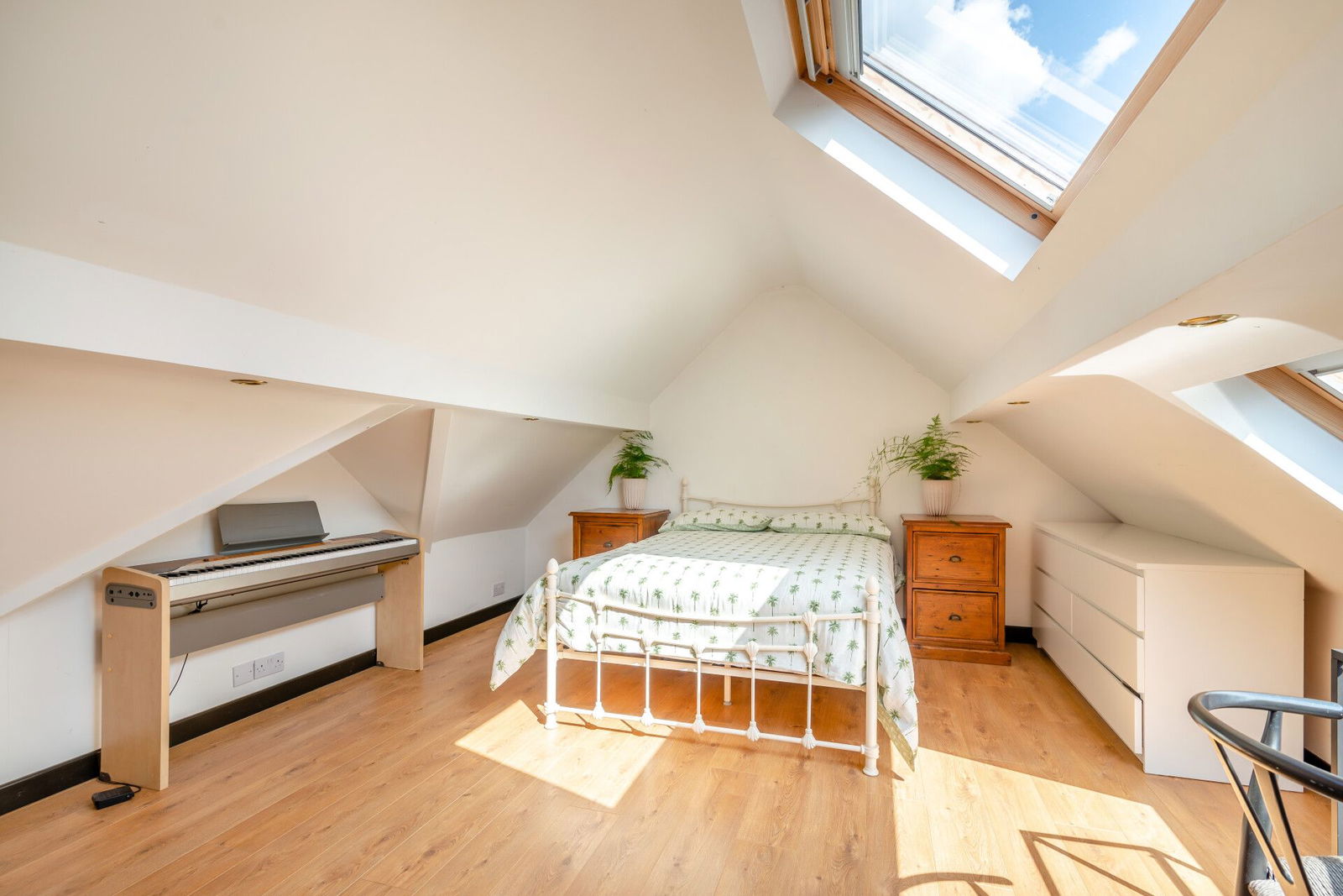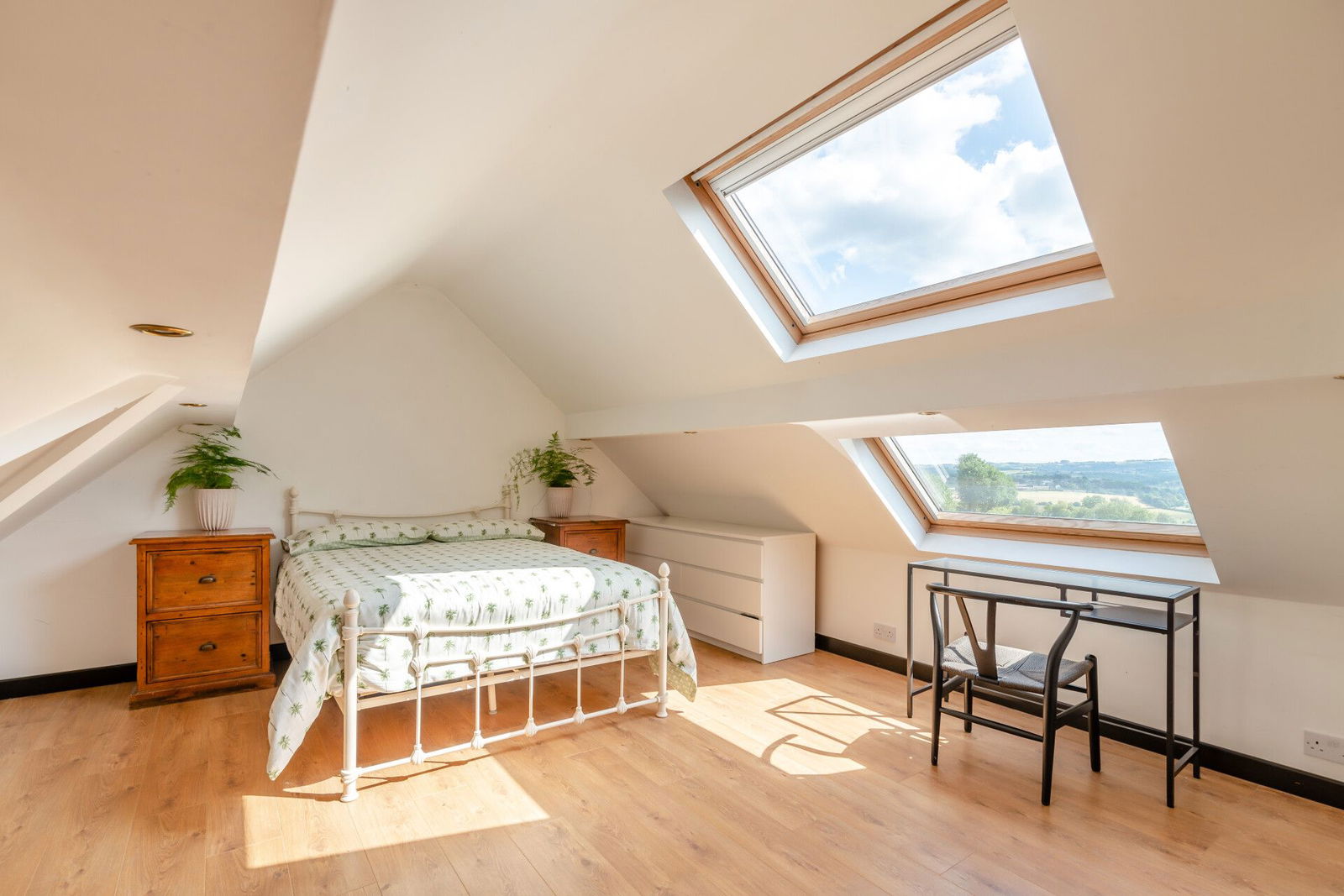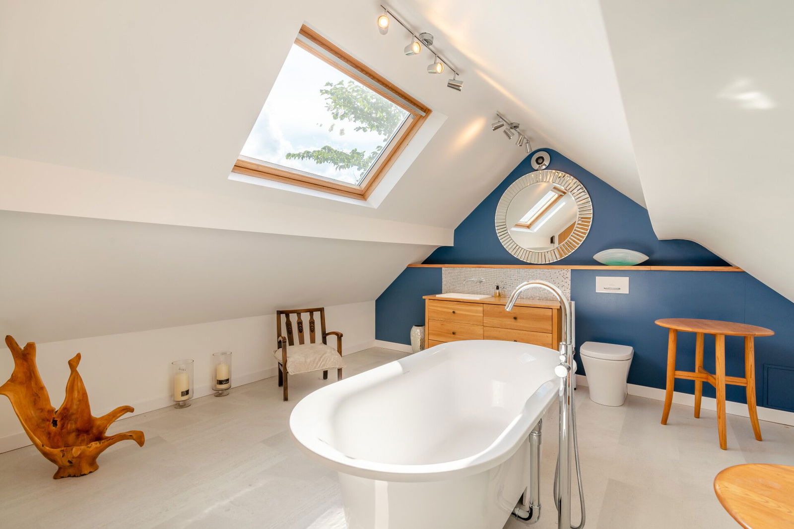The bedroom is flooded with natural light and offers spacious accommodation, has three skylight windows, providing panoramic views across the valley resulting in a stunning room which could be utilised as a full bedroom suite accompanying the bathroom which presents a three-piece suite finished in white comprising a freestanding, double-ended, roll top bath with floor-mounted chrome mixer tap and showerhead attachment, a low-level W.C. with concealed cistern and push-button flush, and a broad wash hand basin set upon a bespoke oak vanity cupboard with wall-mounted mixer tap and mosaic tiled splashback. There is attractive Karndean flooring, and a skylight window.