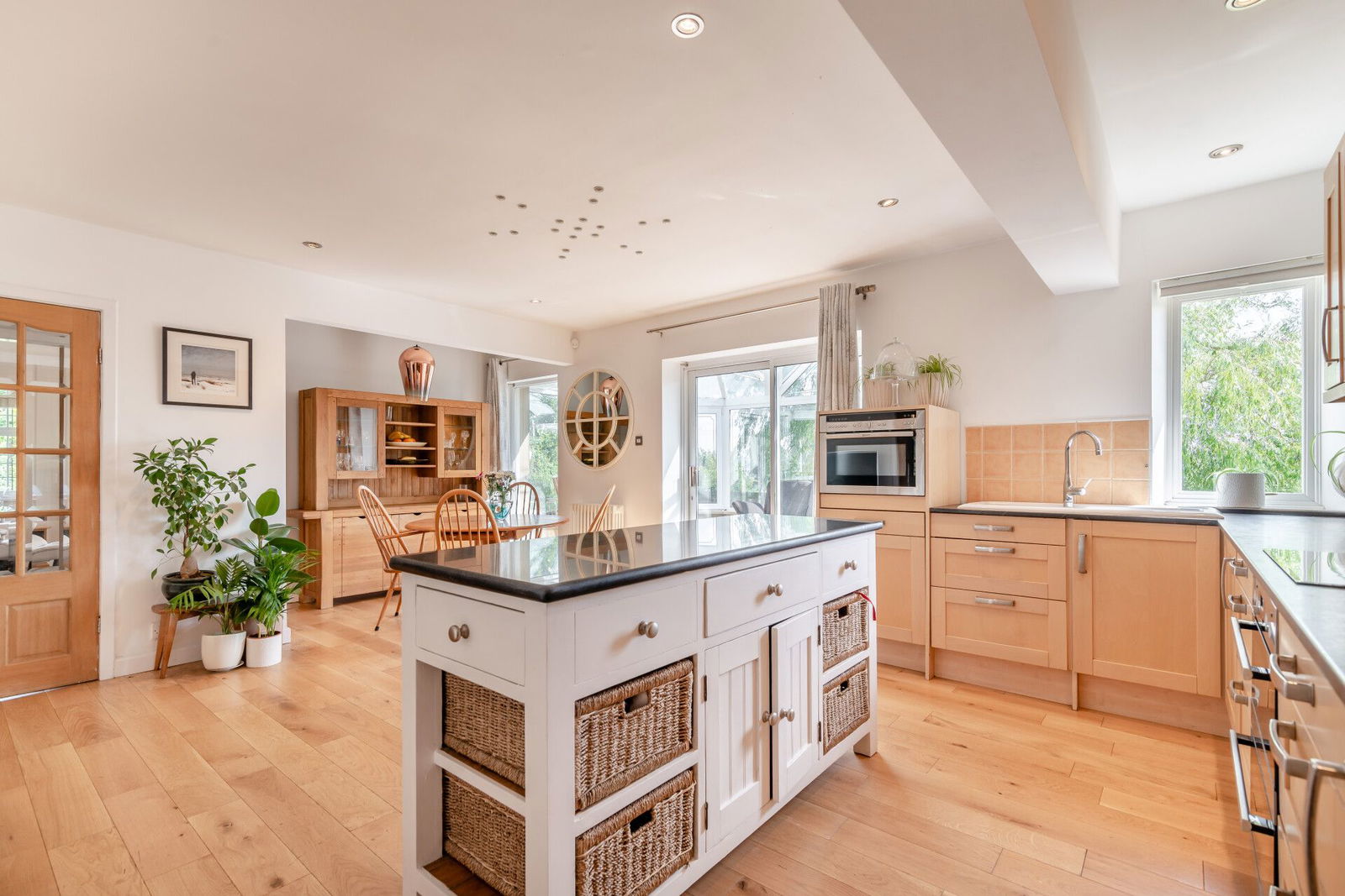 Forming the hub of the home, an open plan living kitchen incorporates a dining area and kitchen, features oak flooring and invites an abundance of natural light indoors via two windows to the rear and sliding patio which open to the garden room. The kitchen features a range of fitted furniture with shaker-style units and rolled-edge work surfaces incorporating a ceramic sink and drainer with chrome mixer tap. A complement of appliances includes a four-ring ceramic AEG induction hob with cooker hood over, a matching AEG double oven, a shoulder-level microwave oven, and a dishwasher. There is tiling to splash areas, under-unit lighting and soft-closing doors. A freestanding breakfast island has a granite top and fixed frame cupboards and drawers beneath.