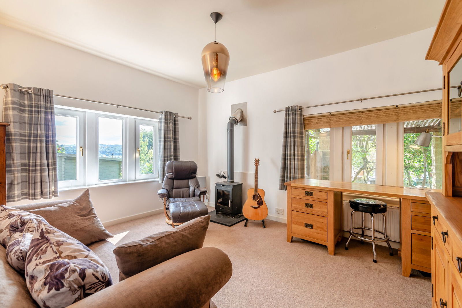Off the kitchen a third bedroom or family room / home office benefits from generous proportions and a dual aspect of mullioned windows to both the side and rear elevations, the rear taking full advantage of the panoramic views across the valley. There is a freestanding cast-iron Clearview multi-fuel stove set upon a raised hearth.