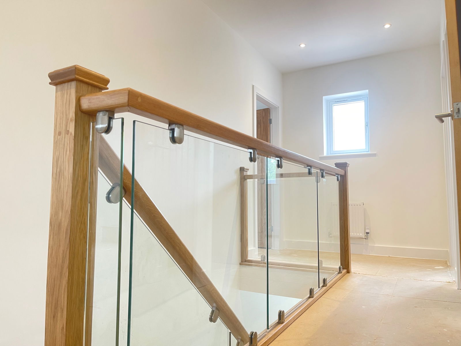 • Heritage white painted softwood staircase with oak handrail and newel post, and glass balustrade