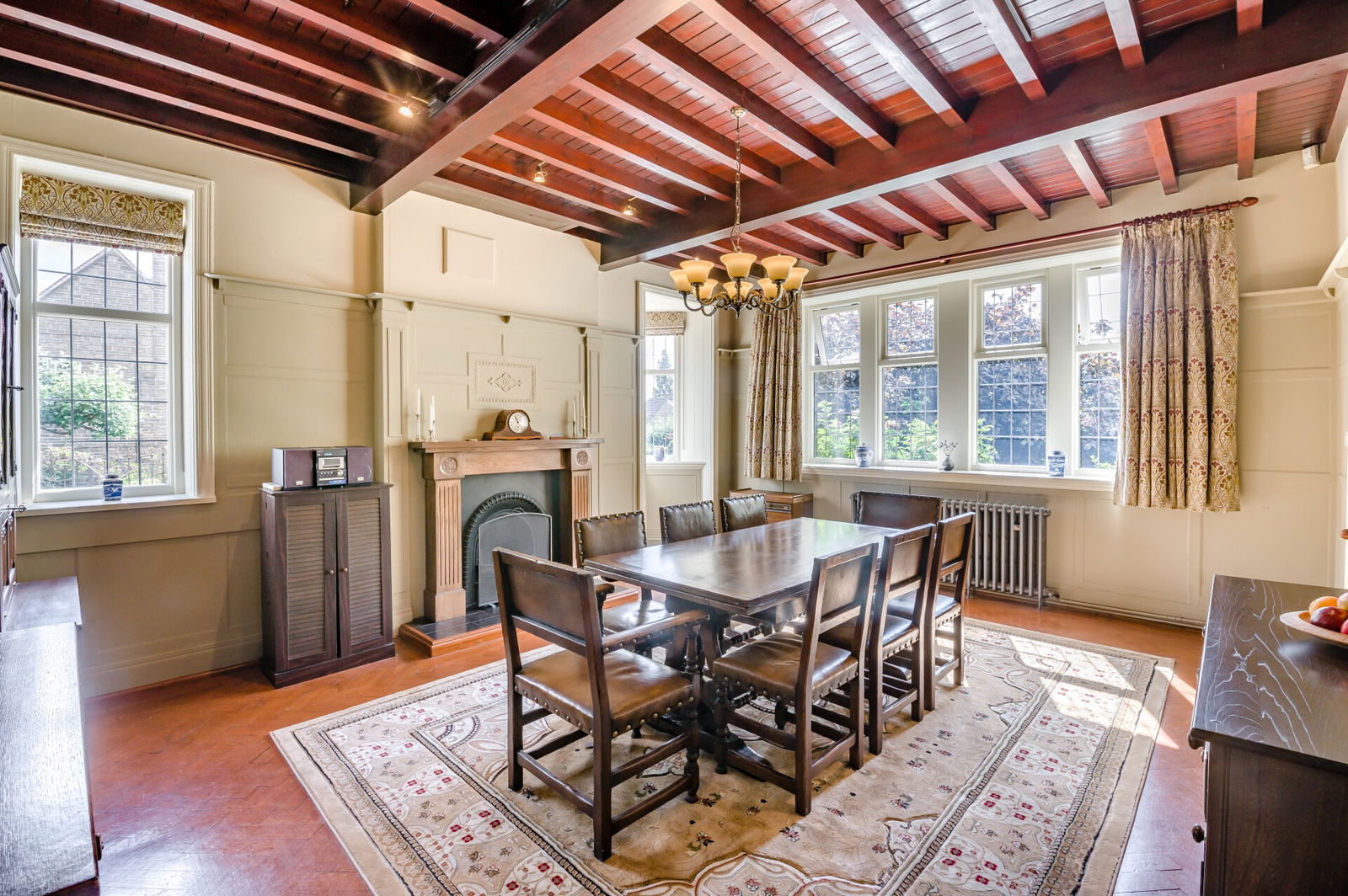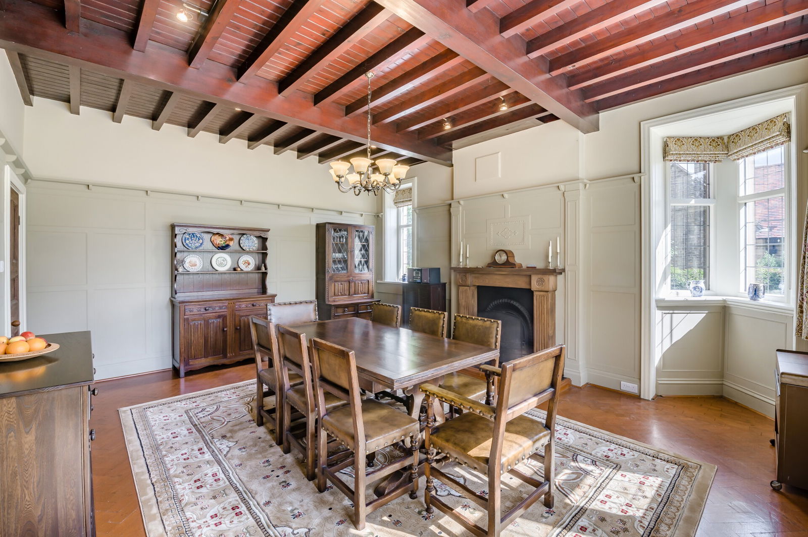 Traditional wall panelling and timber parquet flooring lend depth and texture, complemented by exposed ceiling timbers that speak to the property’s Edwardian roots. A classic fireplace creates a natural focal point. The dining room is a versatile space designed for both everyday living and formal occasions.