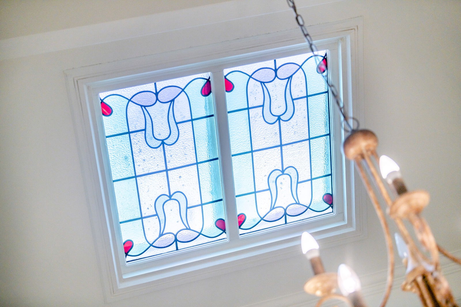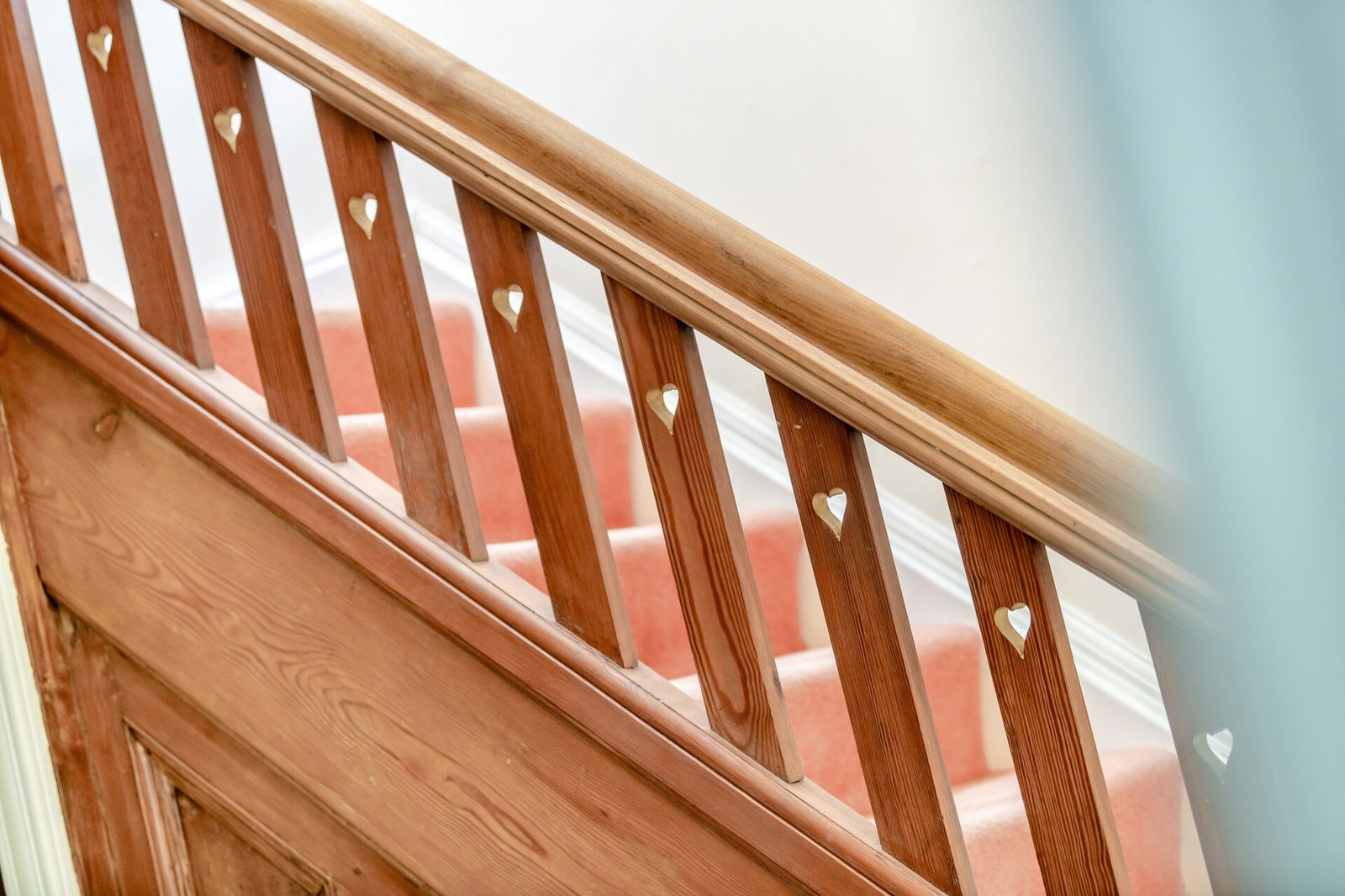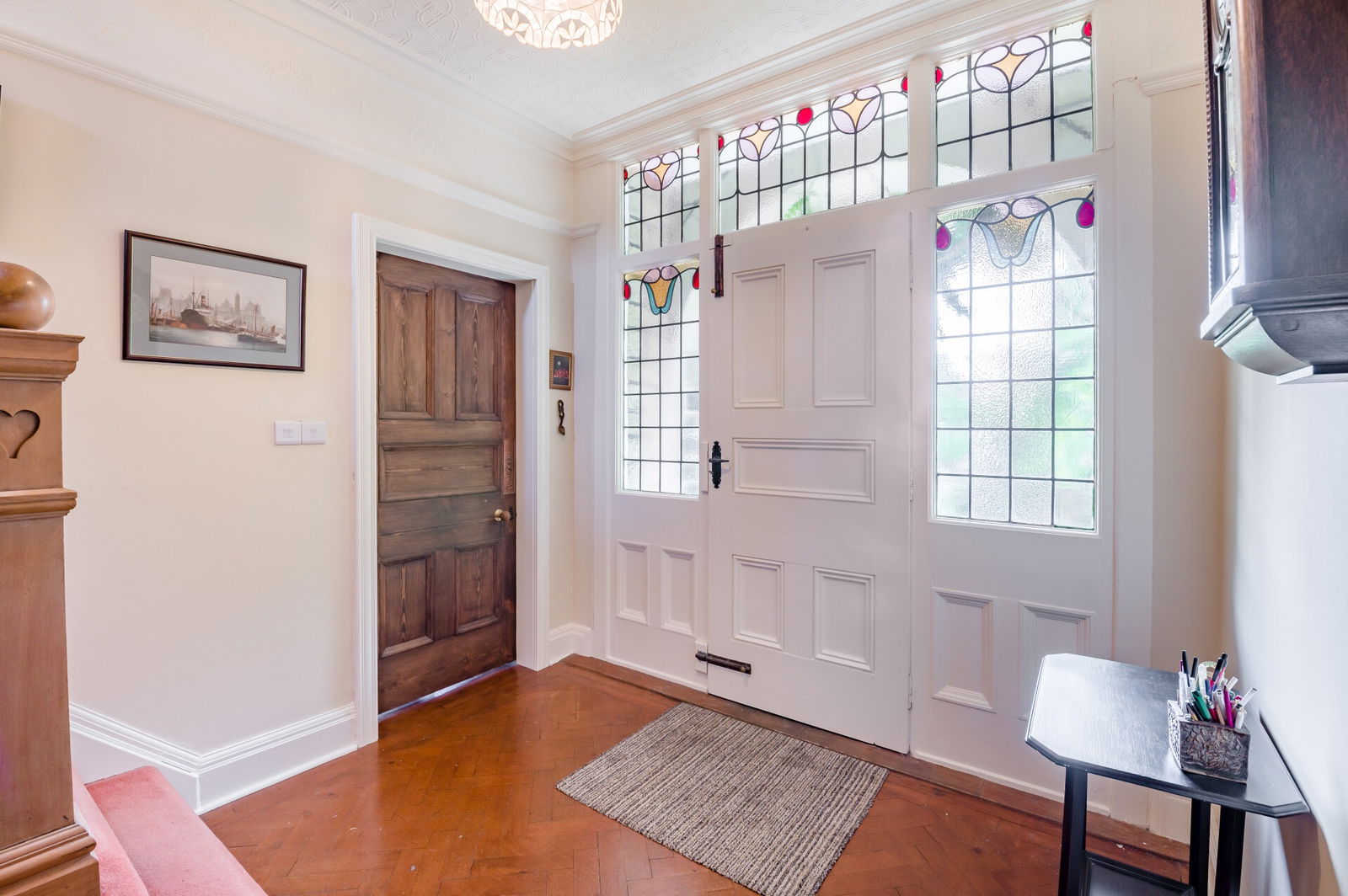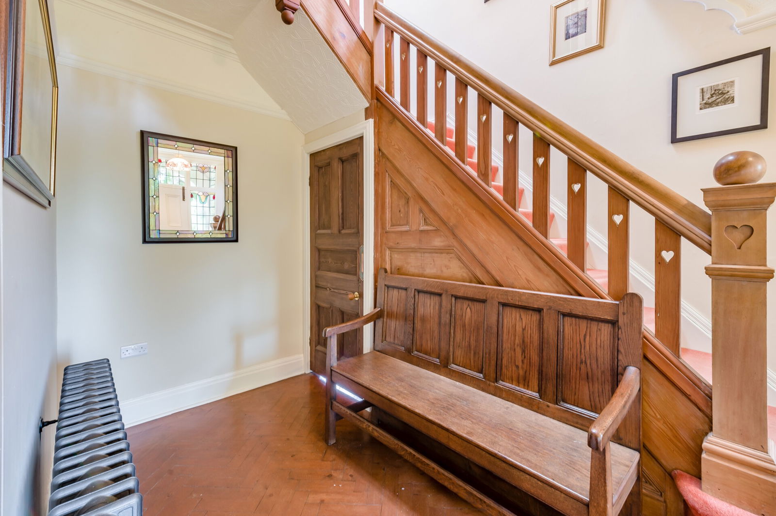 Step inside to a spacious hall where natural light dances across parquet flooring and stained glazing wraps the doorway in a soft, jewel-toned glow. Every detail has been curated with care, from the heart-shaped carvings inset within the timber staircase, to the galleried landing above that hints at the home’s architectural pedigree.