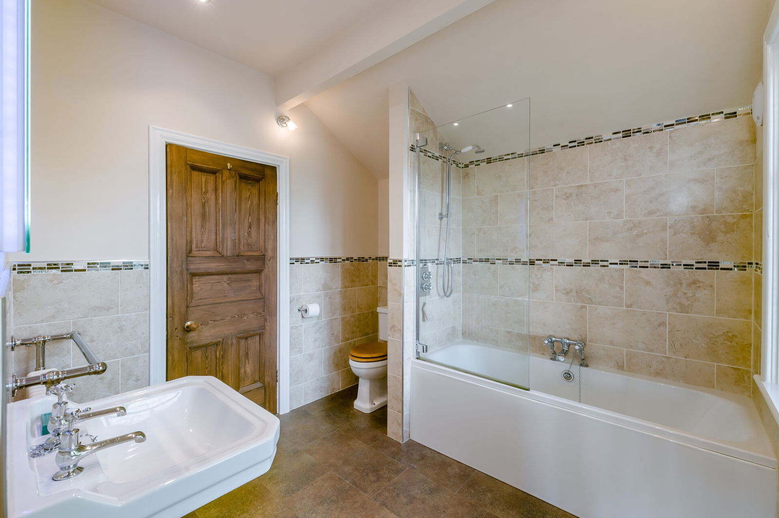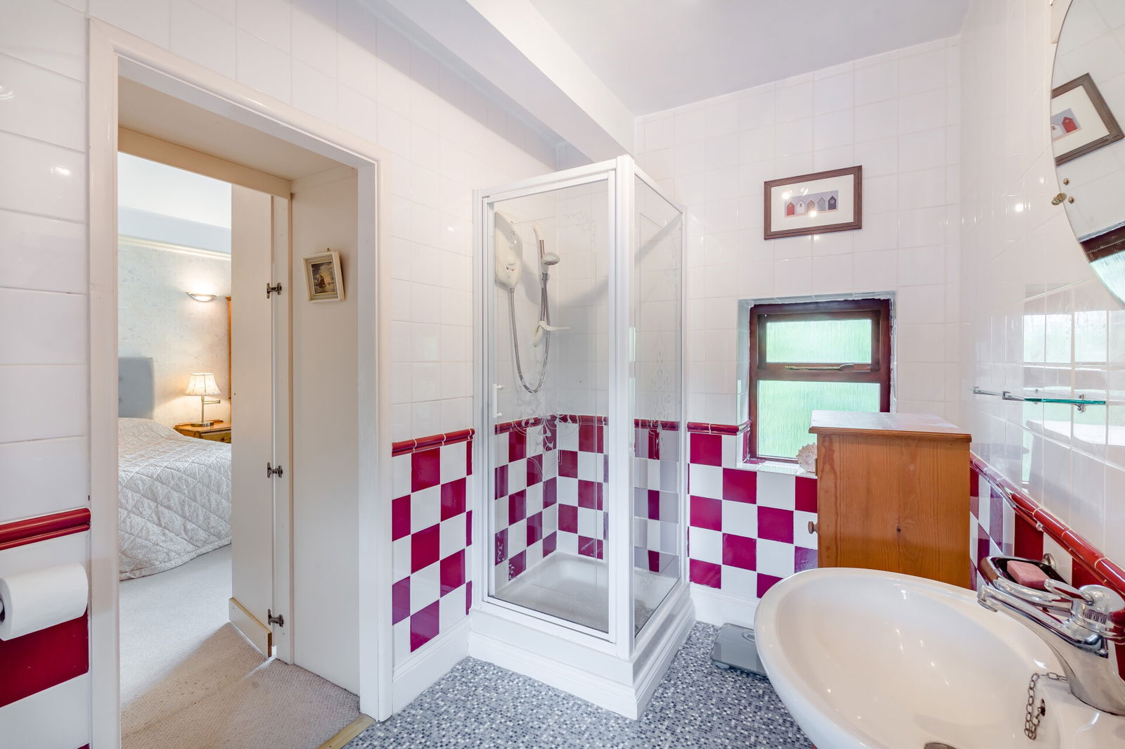 Upstairs, the sense of space continues. The principal bedroom features an en-suite shower room, while bedroom two benefits from direct access to the main house bathroom, creating a private en-suite arrangement. Two further bedrooms—ideal for younger children, guests, or home working—complete the first floor.