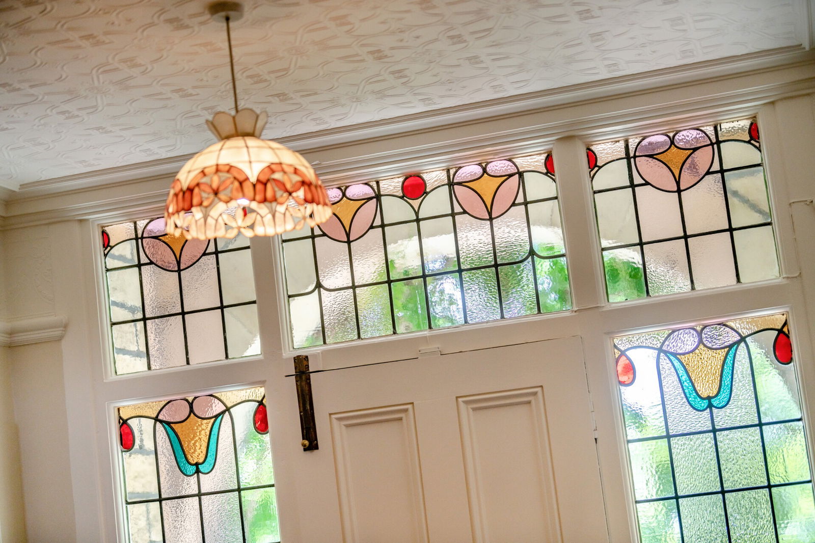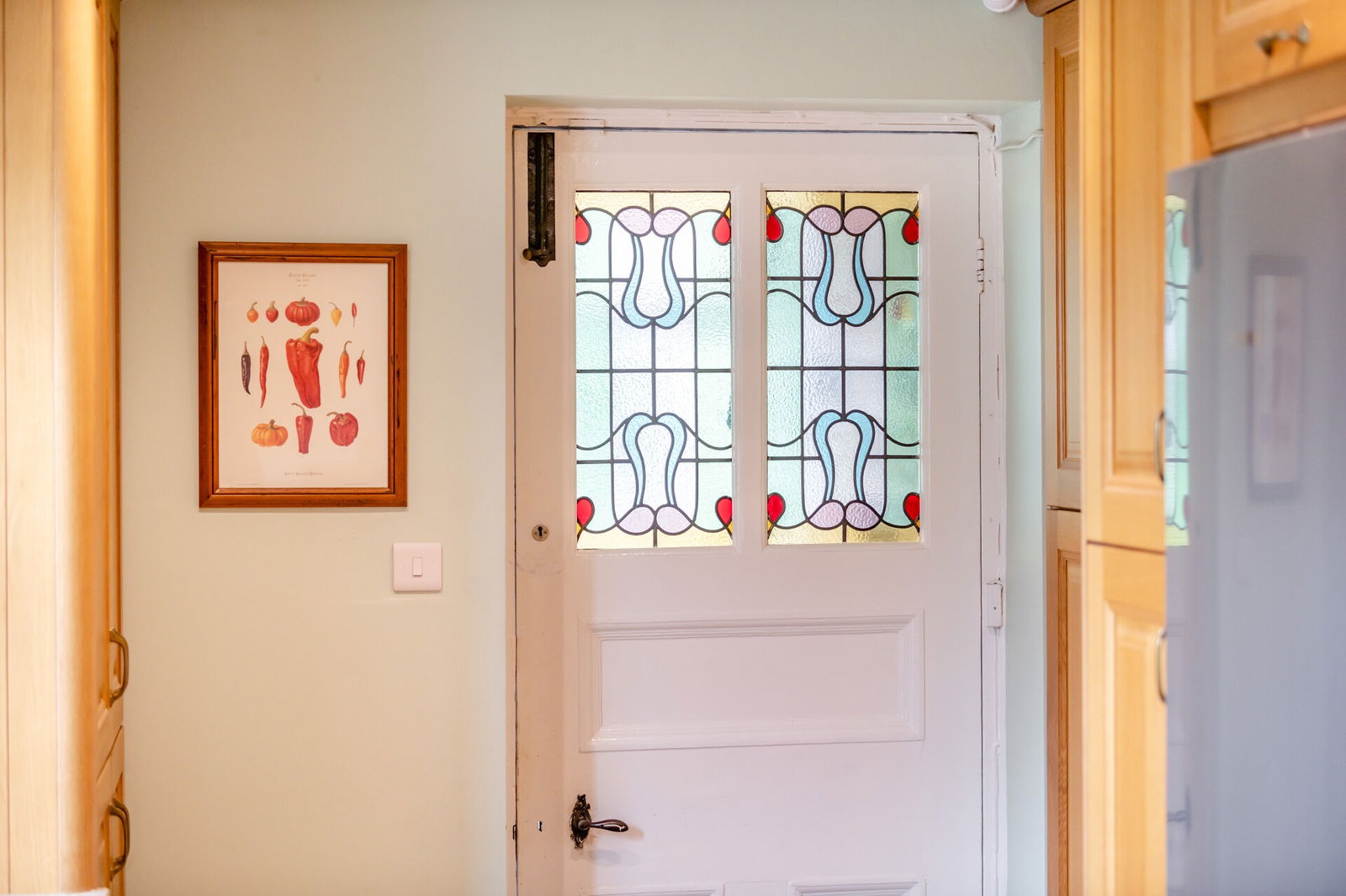 A stained-glass feature door adds a splash of colour and character, leading directly into a rear porch that serves as a discreet, everyday entrance, which is ideal for dirty boots and muddy paw prints!