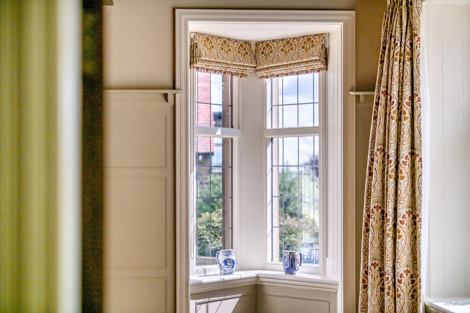 Directly opposite the sitting room, the formal dining room continues the home’s elegant narrative with heritage features that stir both warmth and admiration. A wide window mirrors its counterpart, drawing in soft daylight, while a side-facing feature window offers a secondary perspective—framing garden views and lending subtle grandeur to the room.