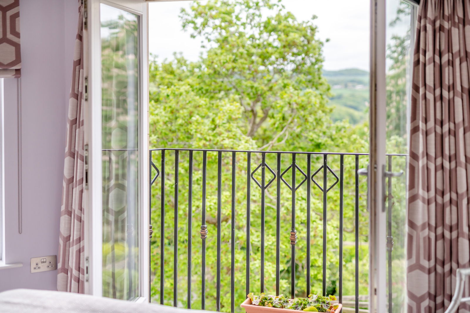 There are French doors, opening to a charming Juliet balcony. This delightful feature invites natural light to pour in while providing an idyllic vantage point to admire the surroundings, adding an airy, sophisticated feel to the space.