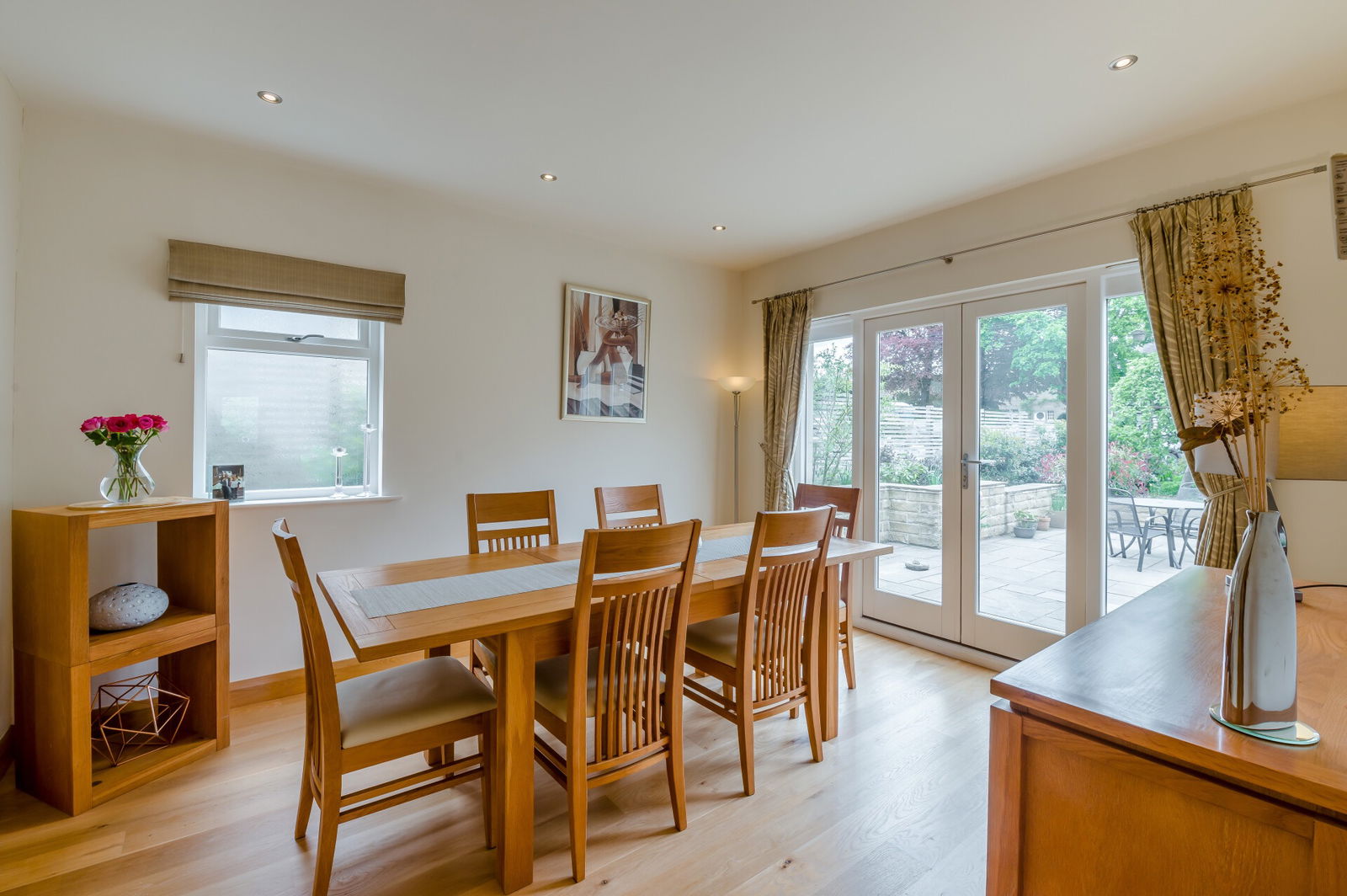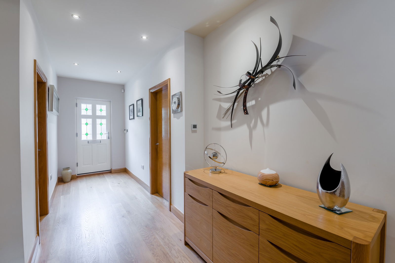 Featuring timber flooring, the entrance hall offers seamless access to multiple key areas of the home. To the right, there is a door leading to the formal dining room, a refined setting perfect for hosting intimate dinners or grand gatherings and features fully glazed patio doors leading to a paved patio area at the front of the property, blending alfresco dining when entertaining.