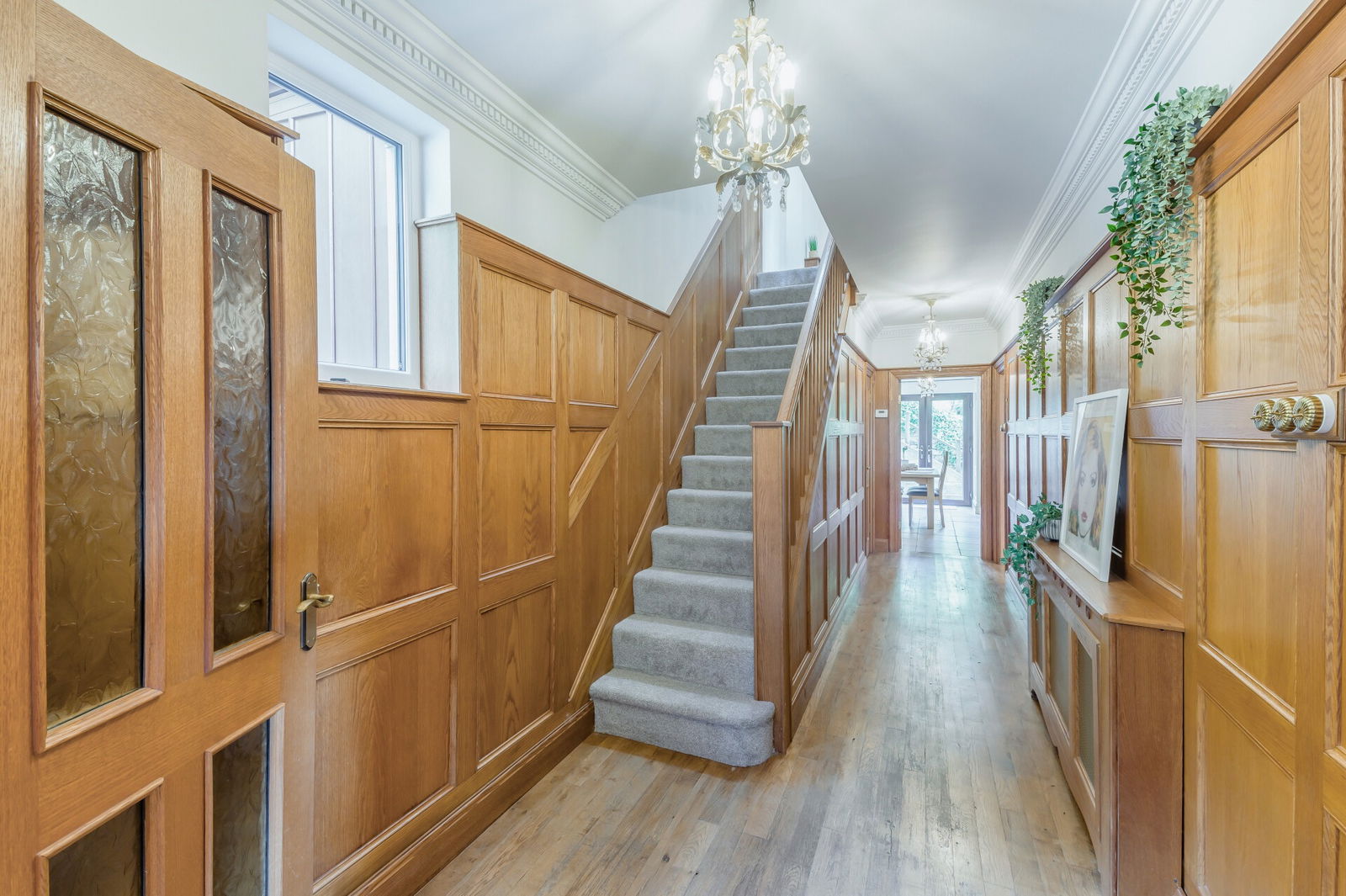 From the main entrance door, a welcoming entrance vestibule provides access to a guest WC, and double doors then open into the main reception hall, where timber-panelled walls pair harmoniously with the rich oak flooring. This sets the tone and is a great introduction to the interior’s high-quality craftsmanship. The entrance hall is light, warm and thoughtfully proportioned, while making an immediate first impression.