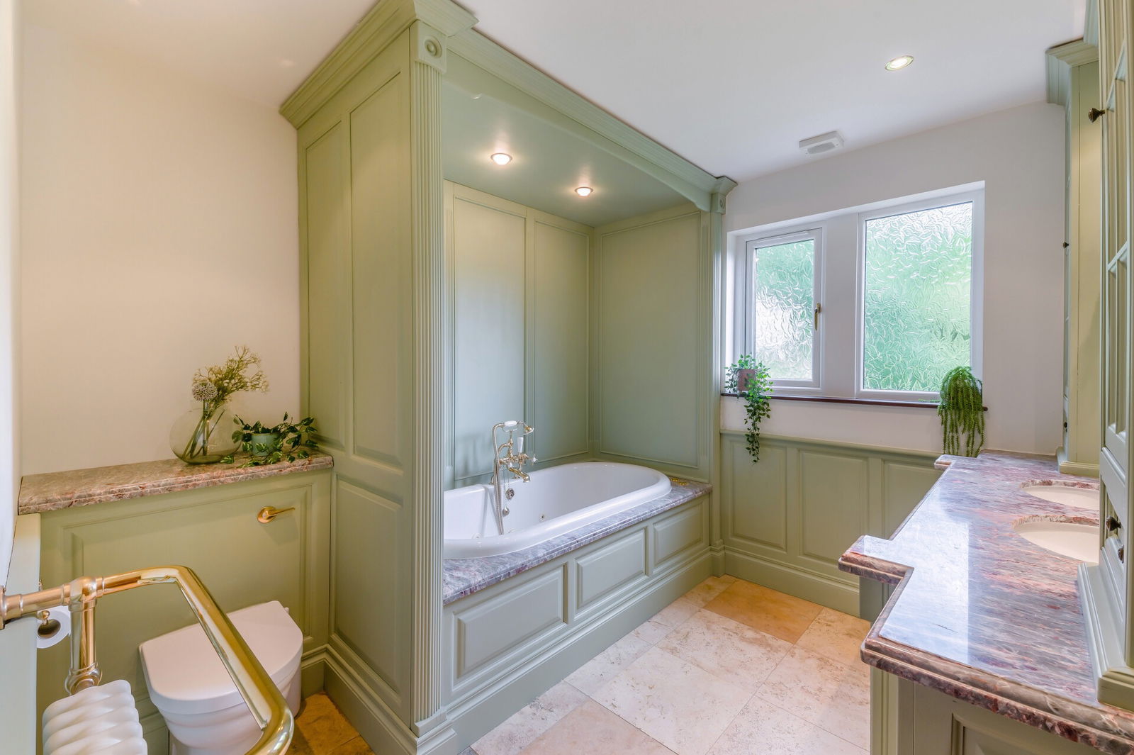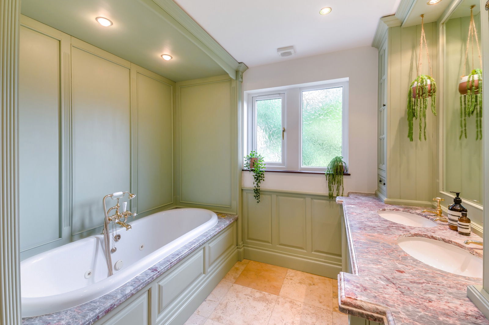The main bedroom offers timeless elegance with bespoke Clive Christian fitted furniture that blends craftsmanship with understated luxury. An en-suite shower room completes the suite.