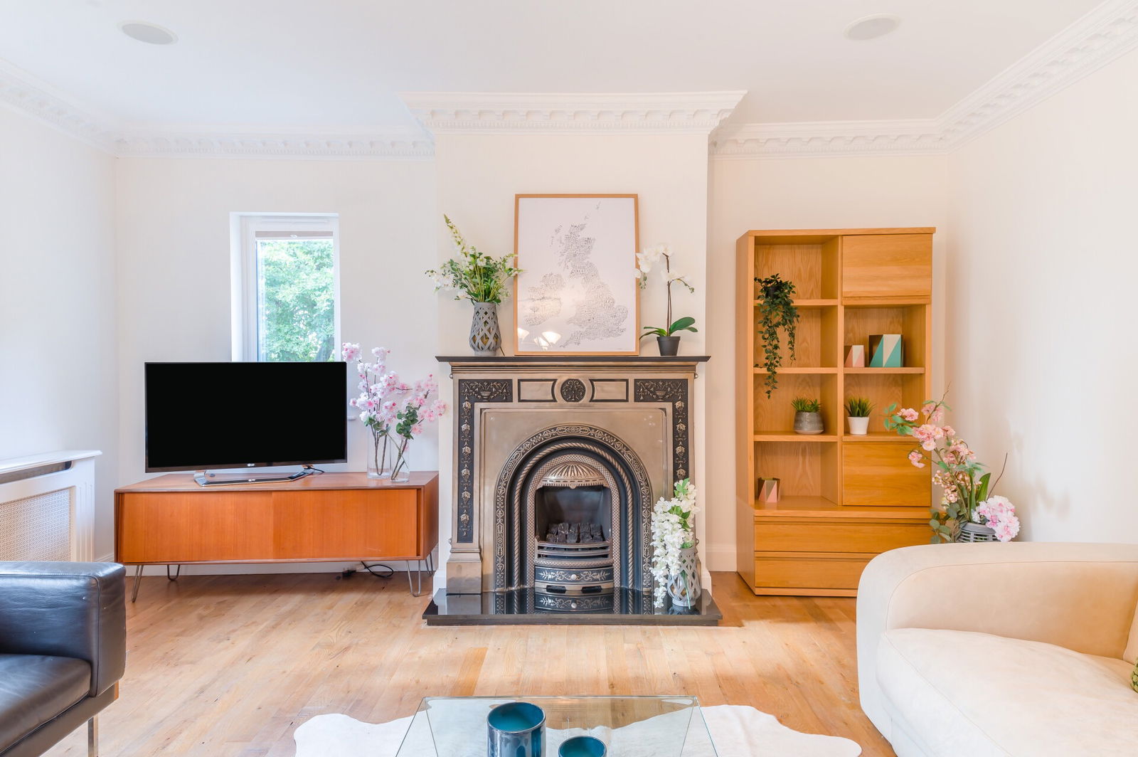 The formal sitting room is designed for refined relaxation and quiet moments, it is a balanced space where traditional detailing meets a tranquil outlook with a leafy aspect toward the garden at the side of the property, enhancing the feeling of peace and privacy. An ornate fireplace commands attention as the room’s central focal point, adding depth and character to the space. Underfoot, warm timber flooring provides both texture and timeless appeal, complementing the room’s classic aesthetic.