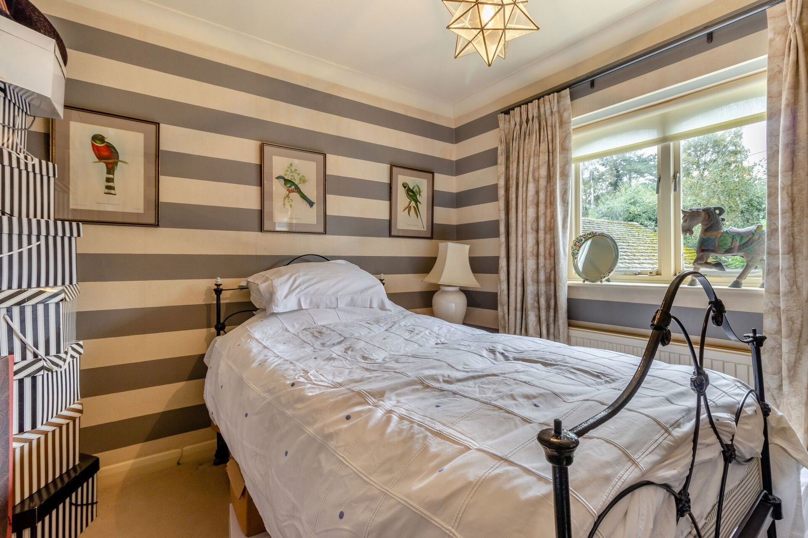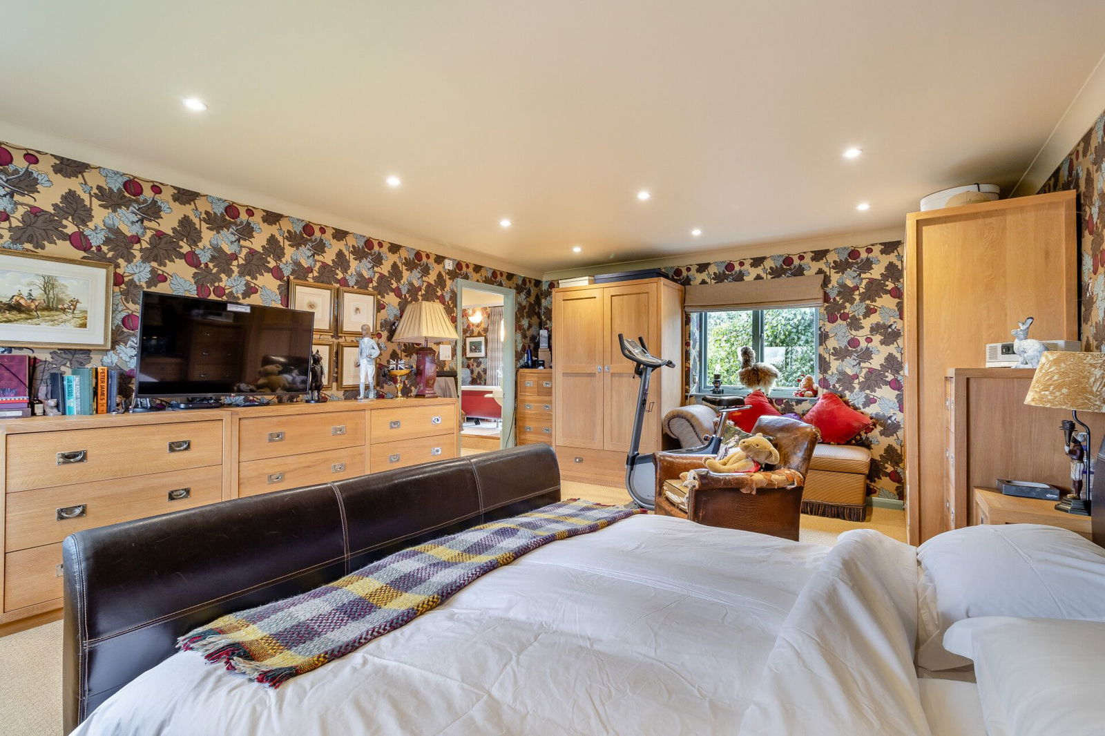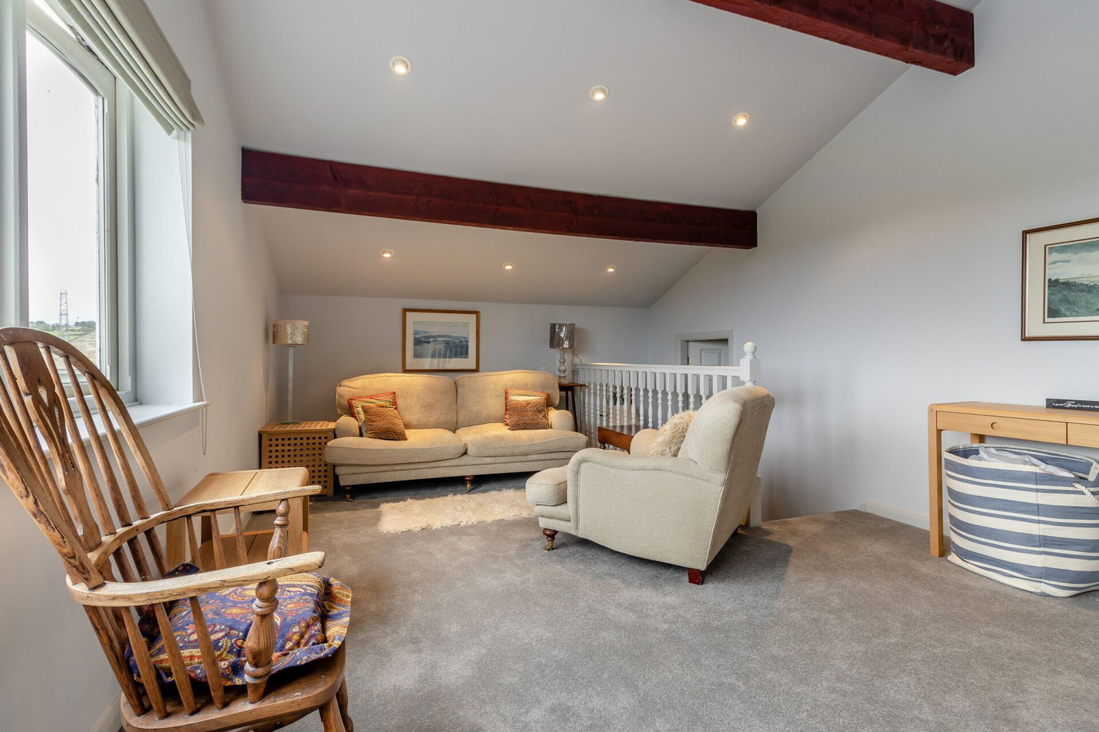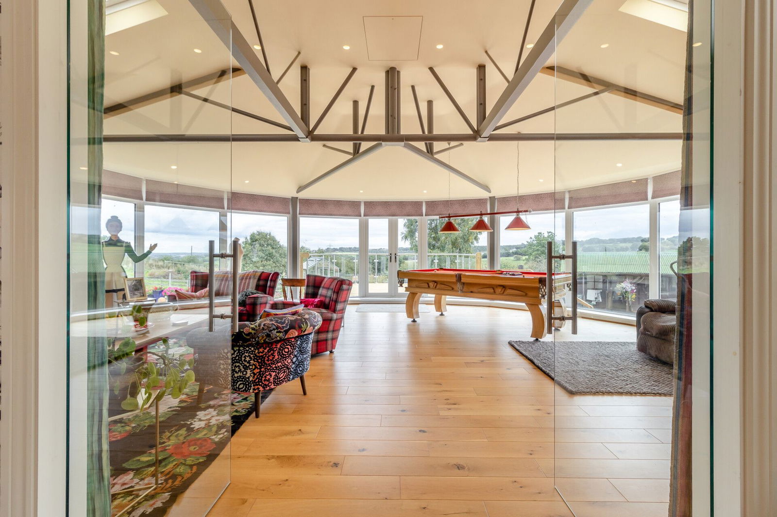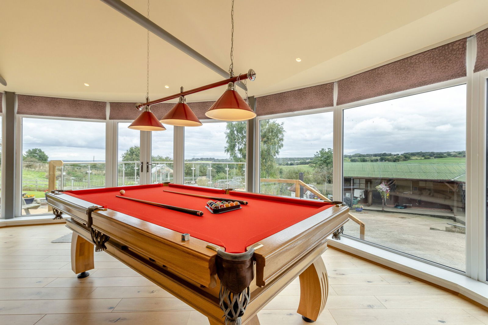 The adjoining room is presented in an open plan format incorporating both a sitting area and bedroom, is exposed into the apex of the building with exposed beams on display whist a window to the rear commands’ impressive views over the grounds, arena, stables and adjoining countryside beyond. The bathroom is presented with a three piece suite.