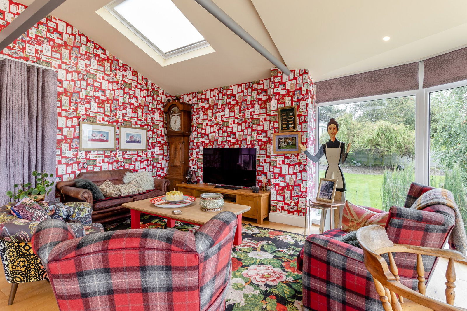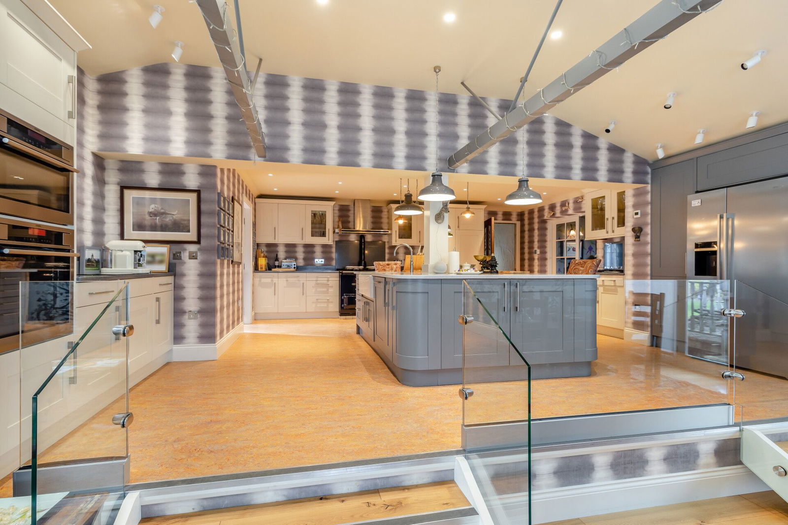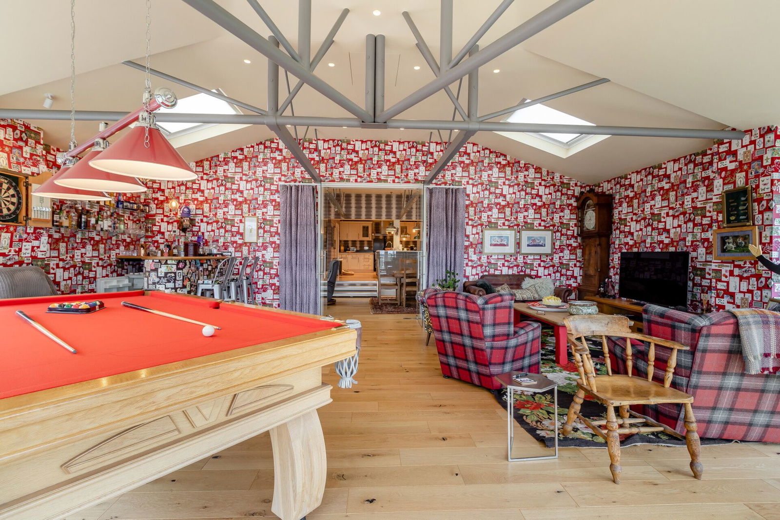 Internal glass doors open to the entertainment suite / garden room which offers generous accommodation that is flooded with natural light, a bank of windows to the rear of the room inviting the outdoors inside whilst French doors opening to a decked garden terrace that enjoys an idyllic south facing aspect. This room has two Velux skylight windows, an engineered oak floor, has as a purpose built bar and offers exceptional versatile accommodation.