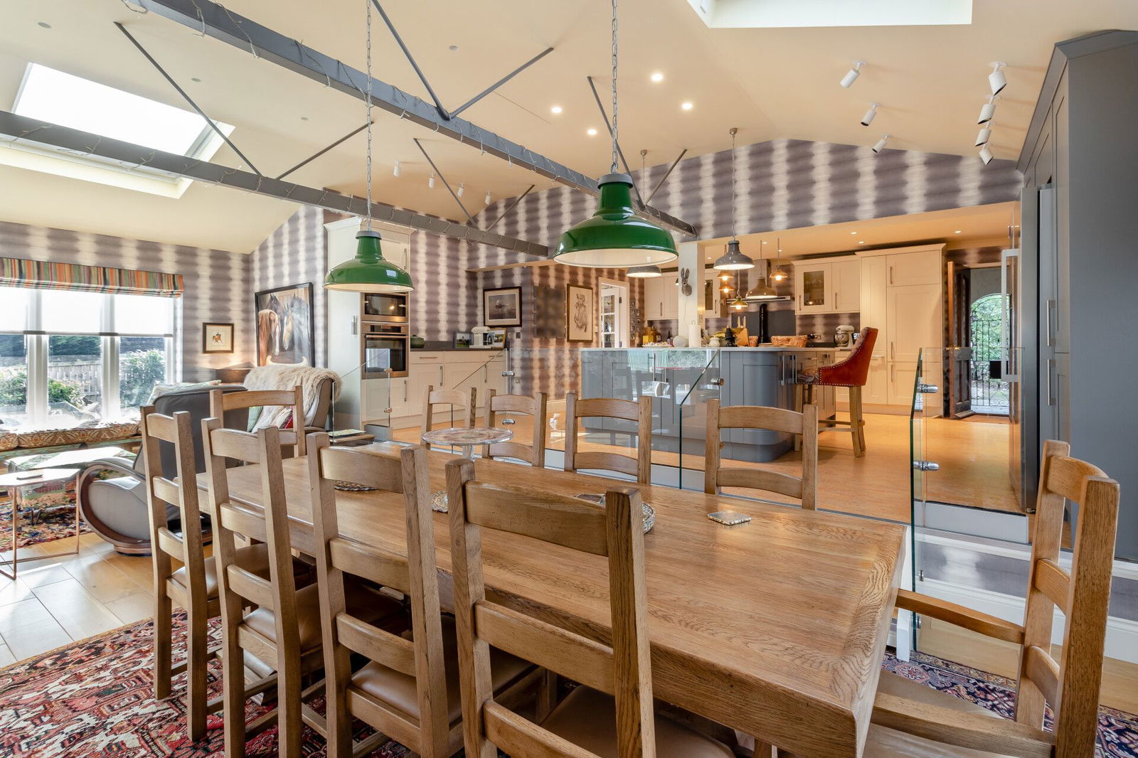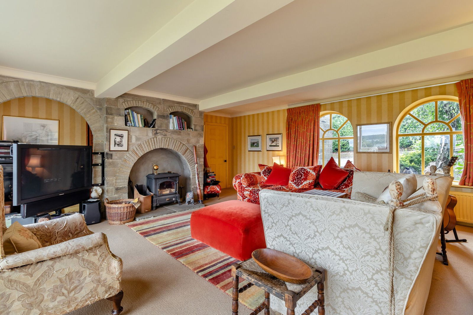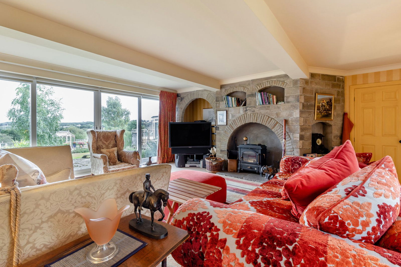 The lounge offers generous proportions with two arch topped windows to the front aspect whilst full height windows to the rear command scenic views over the gardens and adjoining countryside beyond. Patio doors open directly onto an external flagged terrace. A feature stone fireplace forms the focal point of the room and is home to a wood burning stove that sits on a stone flagged hearth.