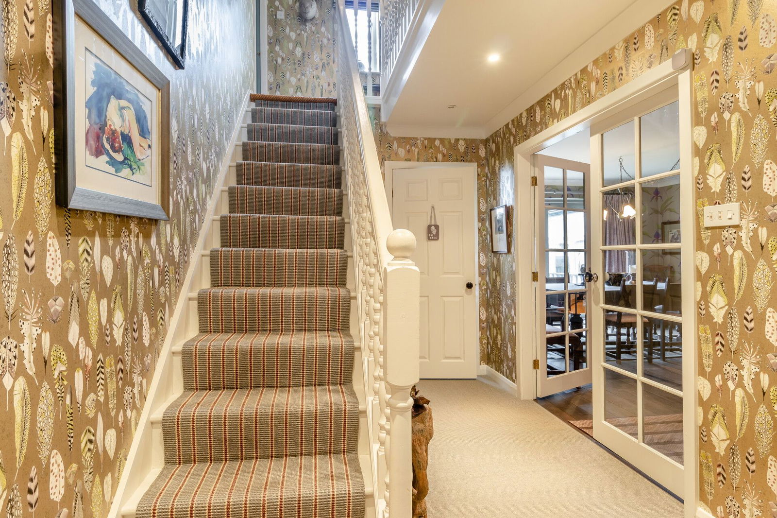 An open fronted storm porch has ornate wrought iron gates, and a part glazed door which open directly into the reception hall which has a staircase to the first floor level with storage beneath, access to a cloakroom that is presented with a two piece suite finished in white. A home office has oak panelling to the walls and a window to the front aspect overlooking the courtyard.