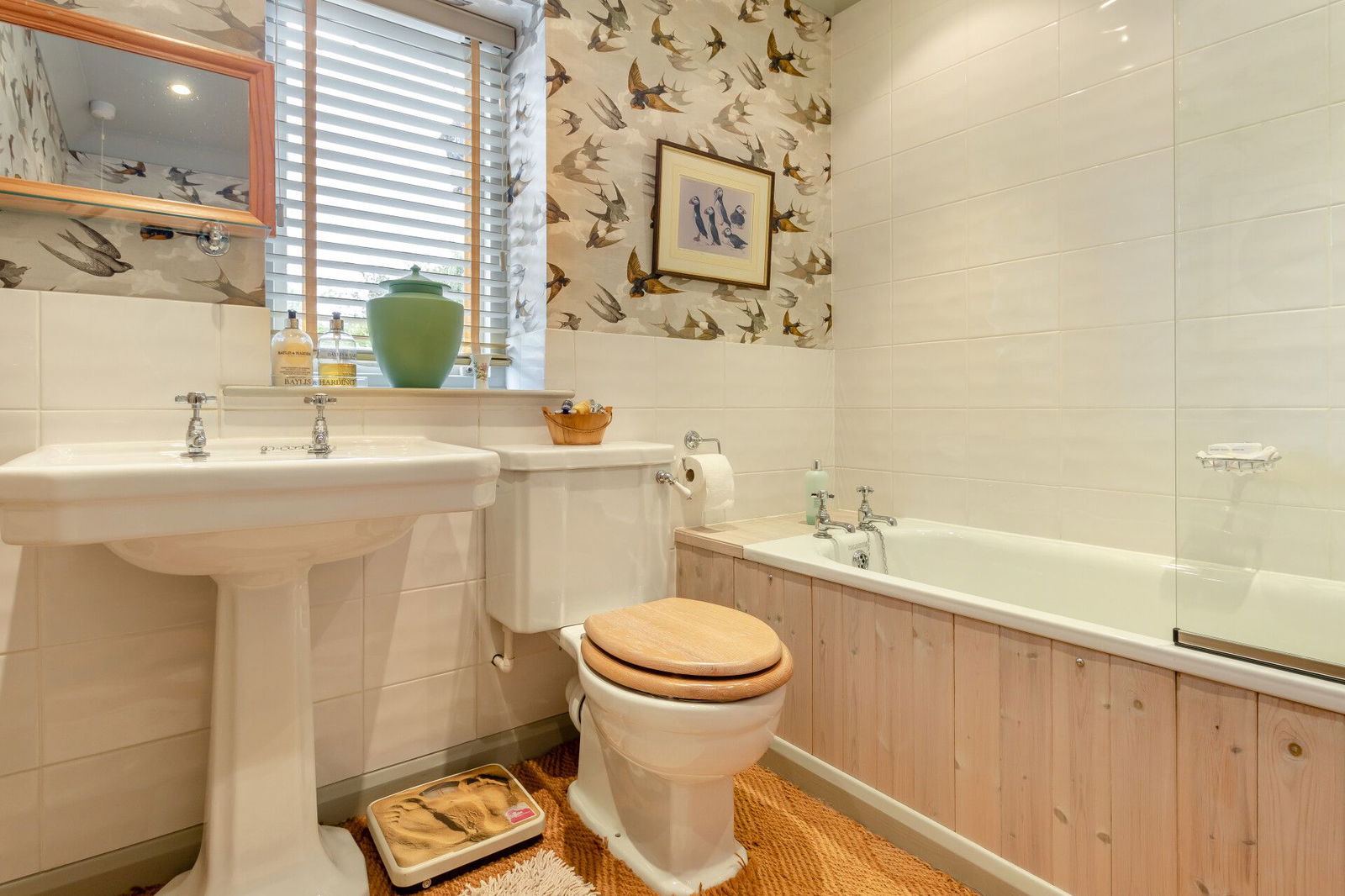 The family bathroom presents, a three piece suite finished in white consisting of a pedestal wash hand basin, a low flush W.C and panelled bath with a shower over.