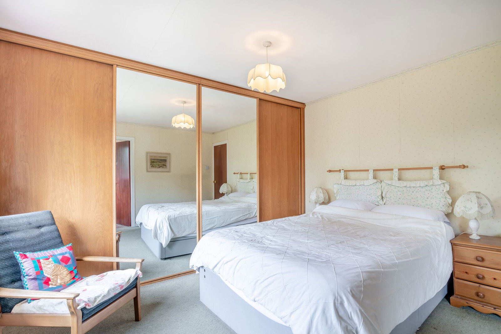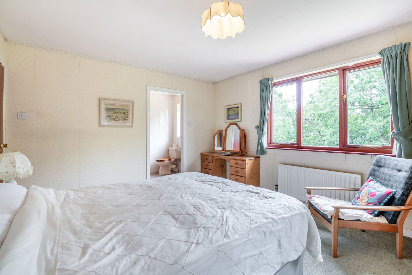 There is a double bedroom to the front with a window offering a glimpse of surrounding countryside whilst two further bedrooms each commanding an impressive outlook over the gardens and surrounding landscape, the front room has fitted wardrobes and open fronted library shelving.