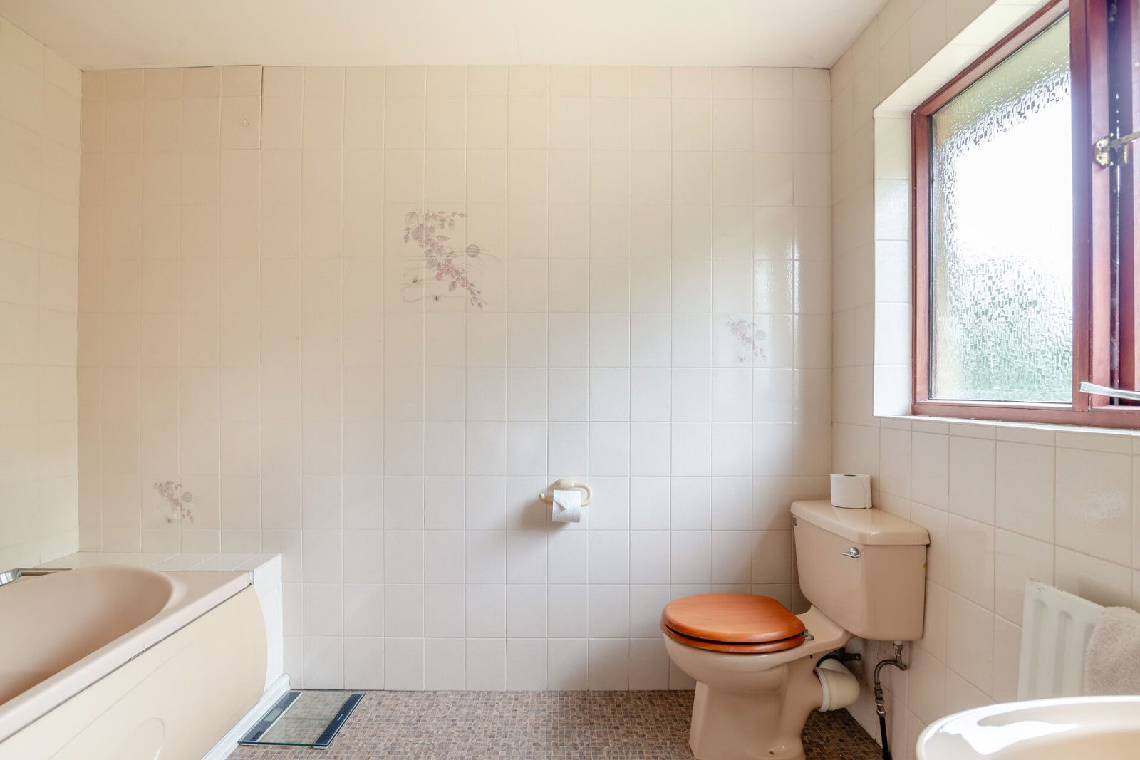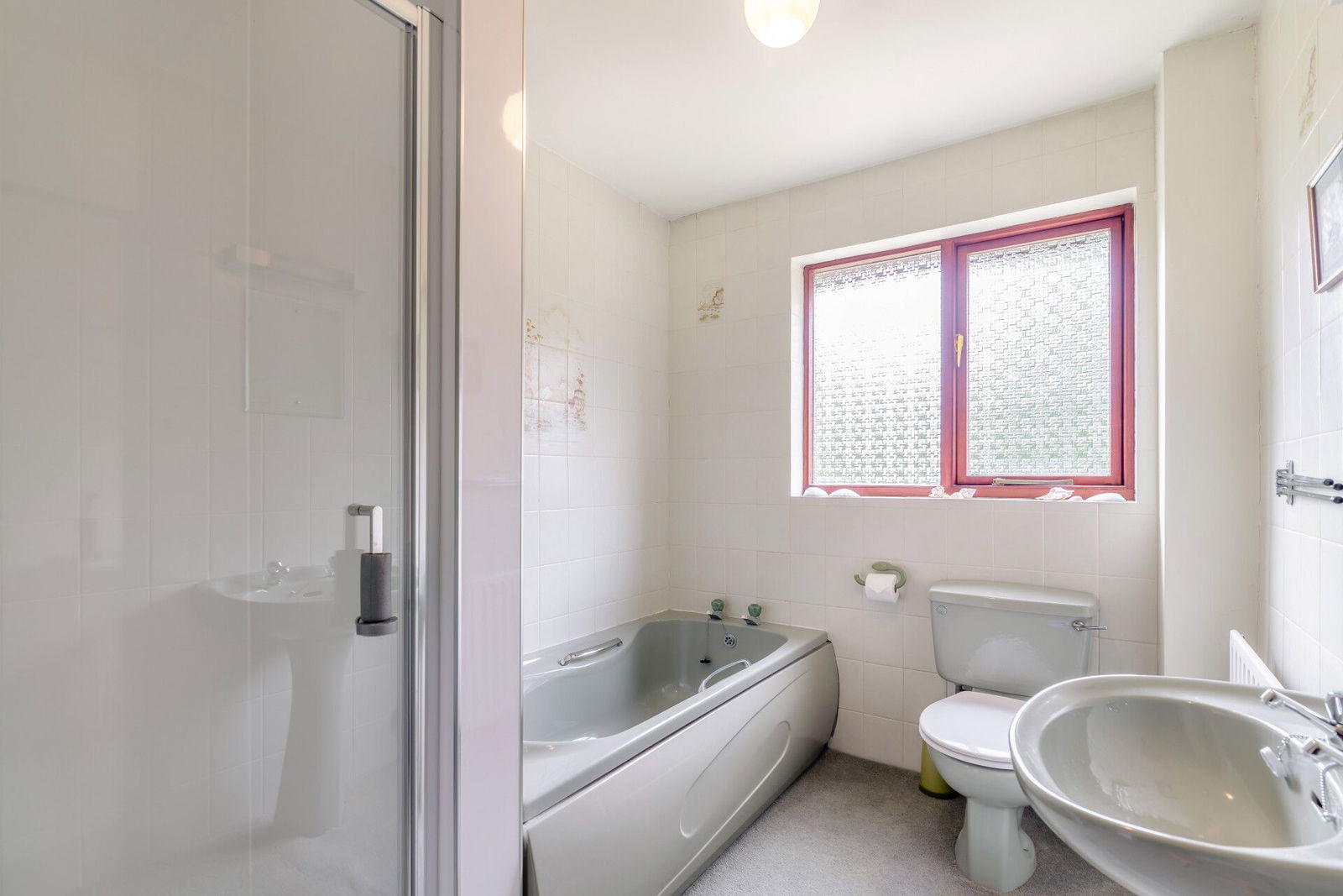 The family bathroom presents a four piece suite consisting of a low flush W.C, a pedestal wash hand basin, a panelled bath and a shower; the room having full tiling to the walls and a frosted window.