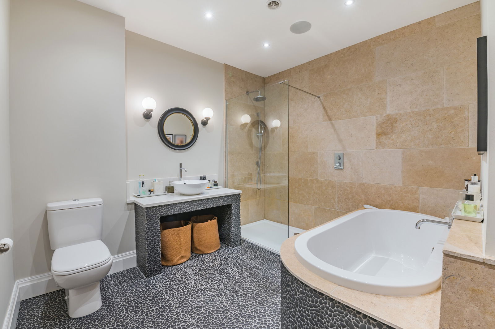 The main bedroom is a true sanctuary, featuring a bedroom area with hand-painted timber panelling, creating a refined and inviting atmosphere. A walk-in dressing room offers ample storage, leading to a luxurious ensuite bathroom, complete with a step-in shower cubicle with a sleek glass screen, a modern double-ended bath, a sink with vanity unit, and a WC, all finished to an impeccable standard.