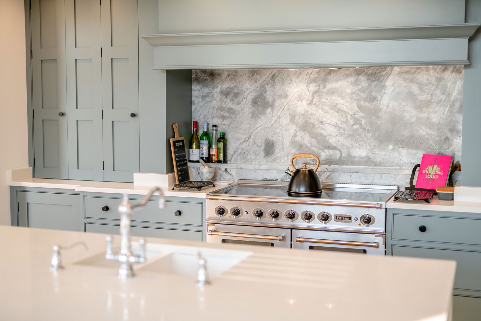 A twin larder fridge and dual-zone wine larder ensure ample space for fresh ingredients and fine wines, while the Falcon range oven with induction hob offers professional-grade cooking capabilities. Completing the space is a built-in dishwasher, seamlessly integrated for convenience.