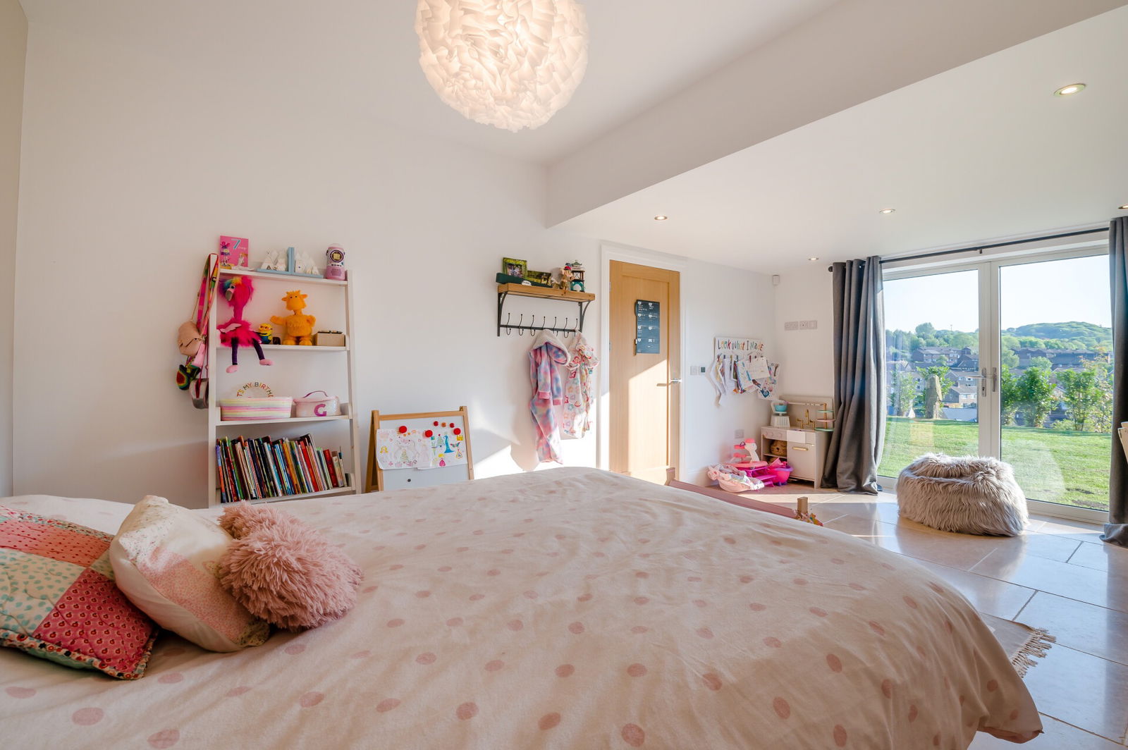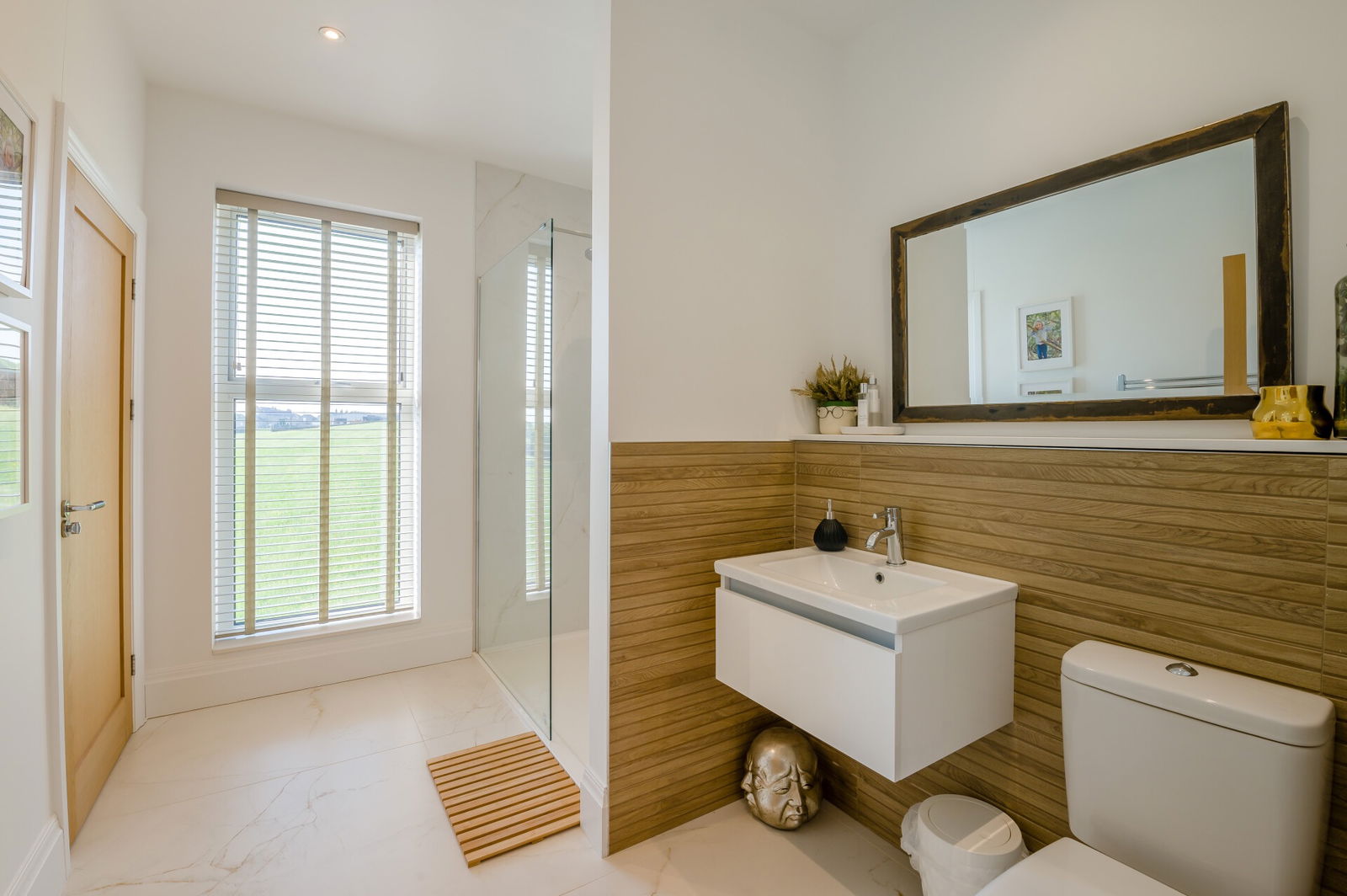 Double doors open onto the first-floor landing with and open staircase to the ground floor and access to bedroom 5. There is a Jack and Jill ensuite shower room which has a step-in shower cubicle and glass screen, sink with vanity unit storage and a WC. This is complete with quality porcelain tiling to the walls and flooring and has a floor to ceiling picture window with an outlook of an open field to the side aspect.