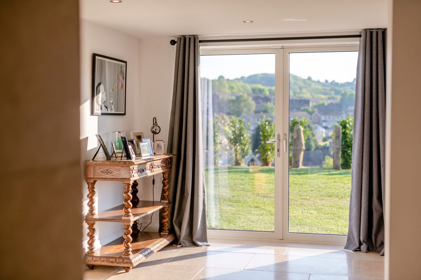 When arriving at the ground floor you’ll be drawn towards the fabulous views which can be admired through the floor to ceiling windows and bi-fold doors that open out to the large patio balcony, which also leads down to the lawned garden.