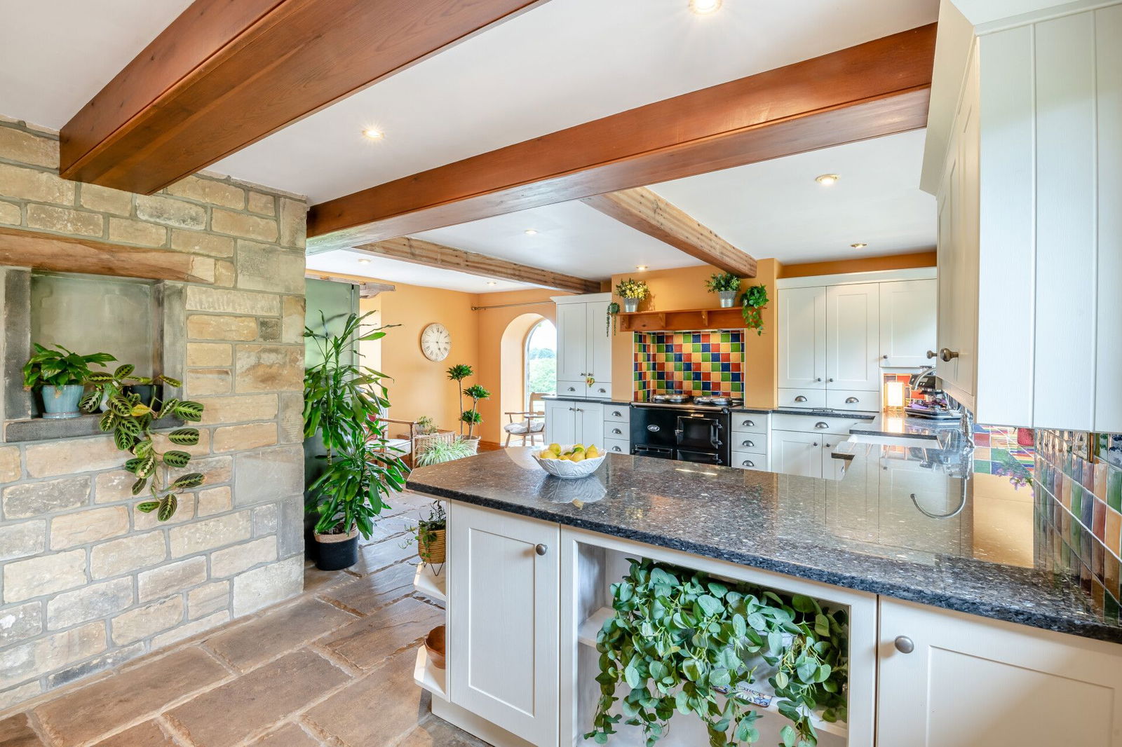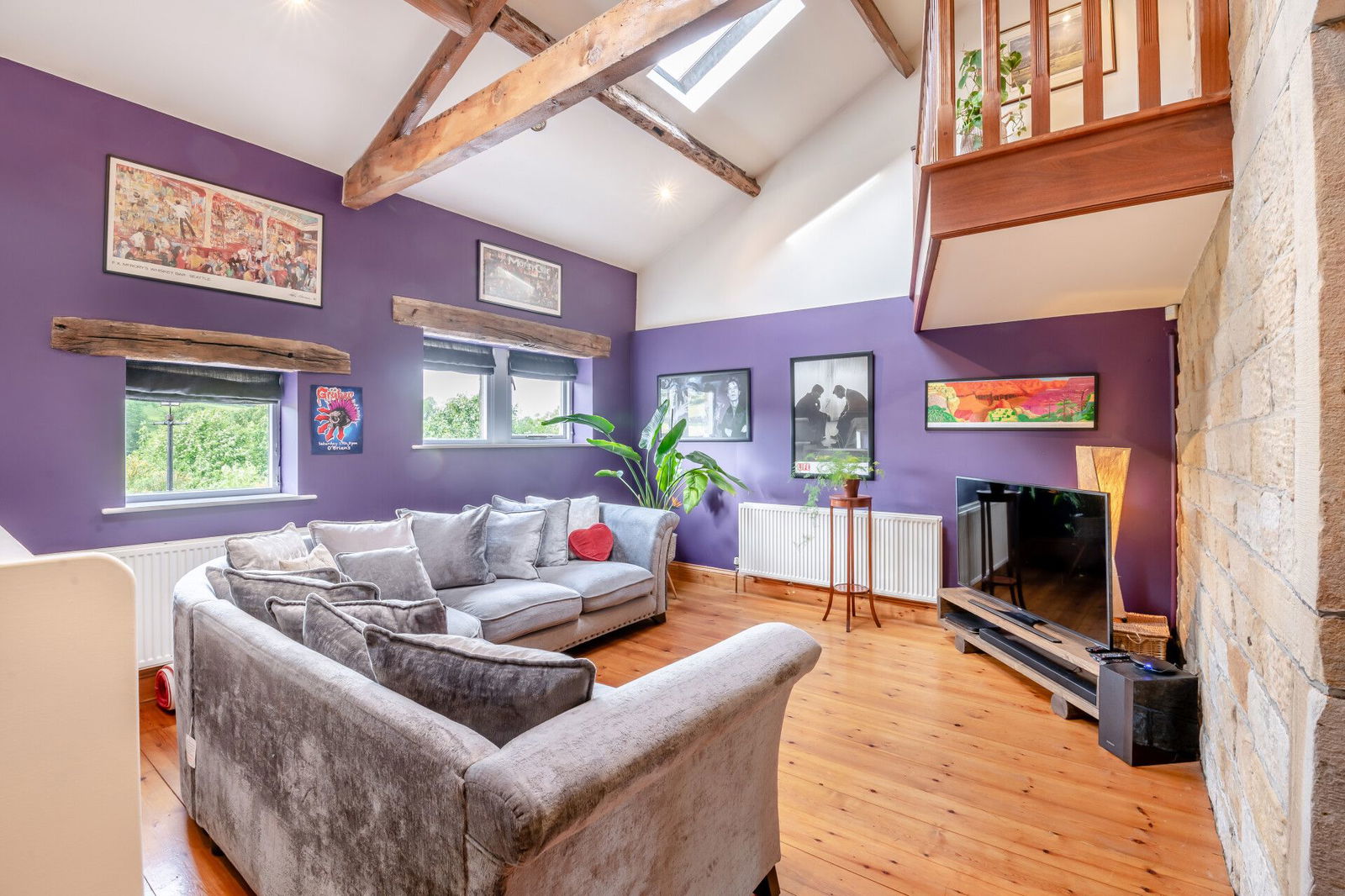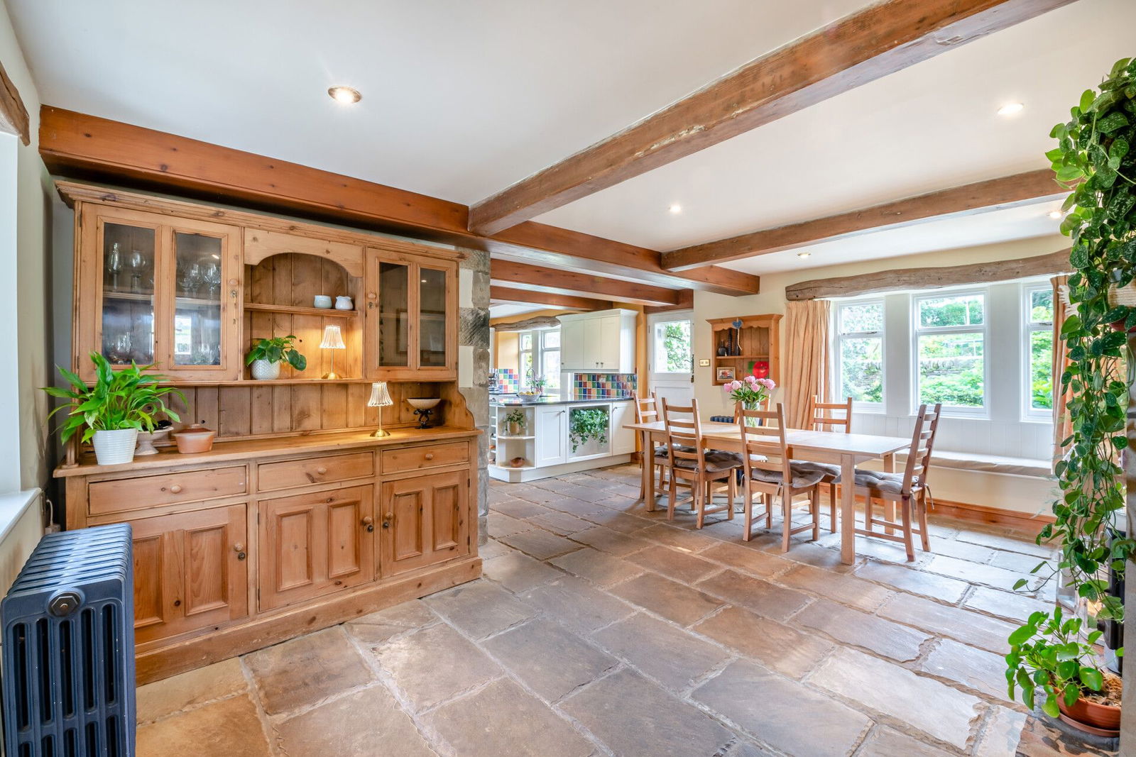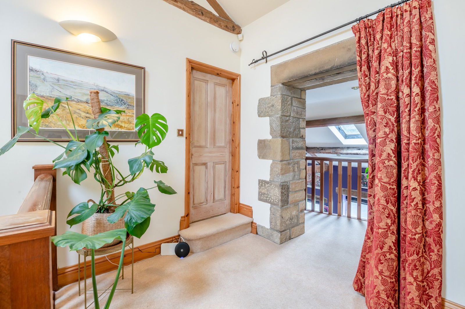 There are two further double bedrooms located on the first floor, both with feature mullion windows, an outlook over the rear garden and a family bathroom. The family bathroom comprises a ‘4-piece’ suite including a bath, separate shower cubicle, WC and hand wash basin, with part tiled walls, beams to the ceiling and windows with lovely views. With access via an enclosed lobby from the landing there are a further 2 double bedrooms. Bedroom 4 offers an outlook to both the front and rear aspect with timber window seating beneath and high angled and exposed beamed ceiling feature. There is an en-suite shower room which comprises a step-in shower cubicle, WC and hand wash basin. Bedroom 5 is simply stunning, and some would argue has the best views of the open countryside, with windows to three sides of the property and an outlook towards the village of Netherthong. Again, featuring the high angled ceiling with exposed timber beams.