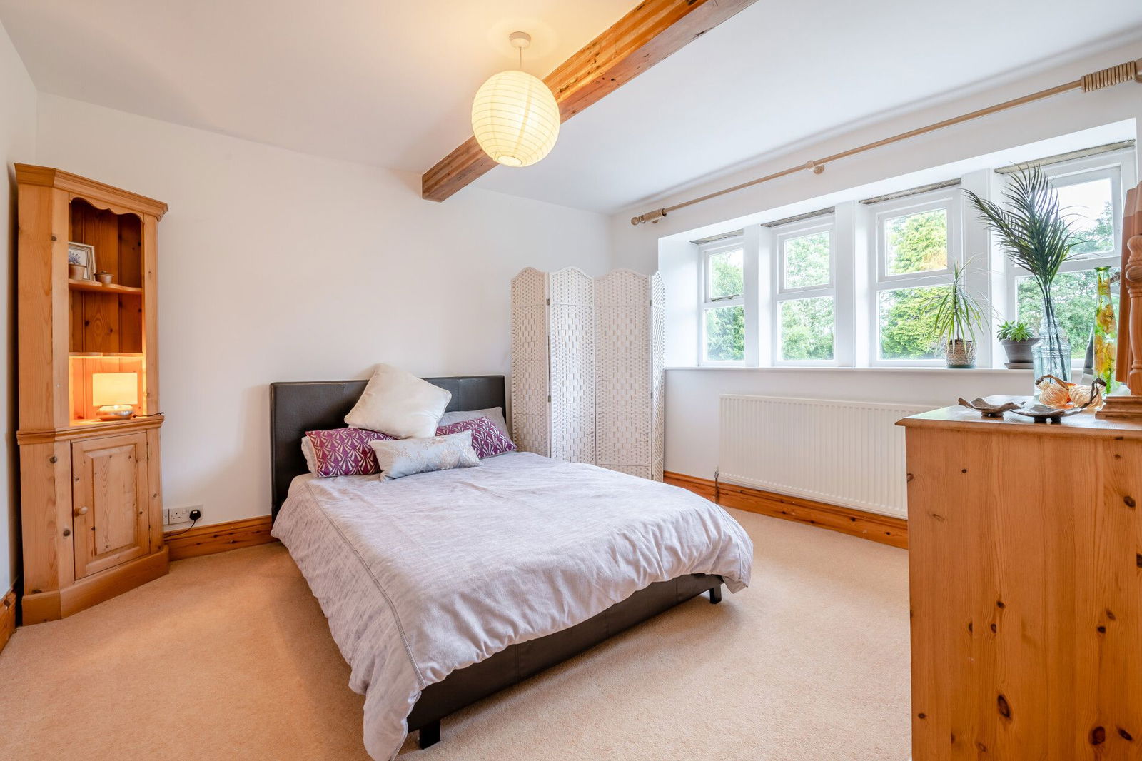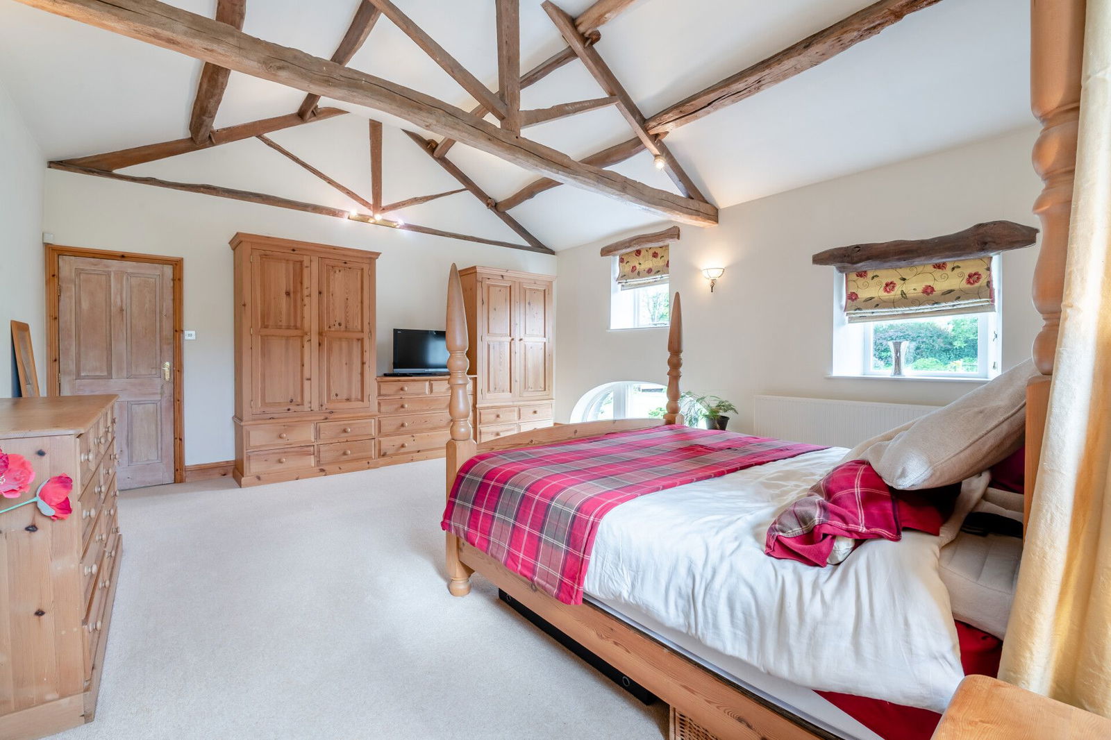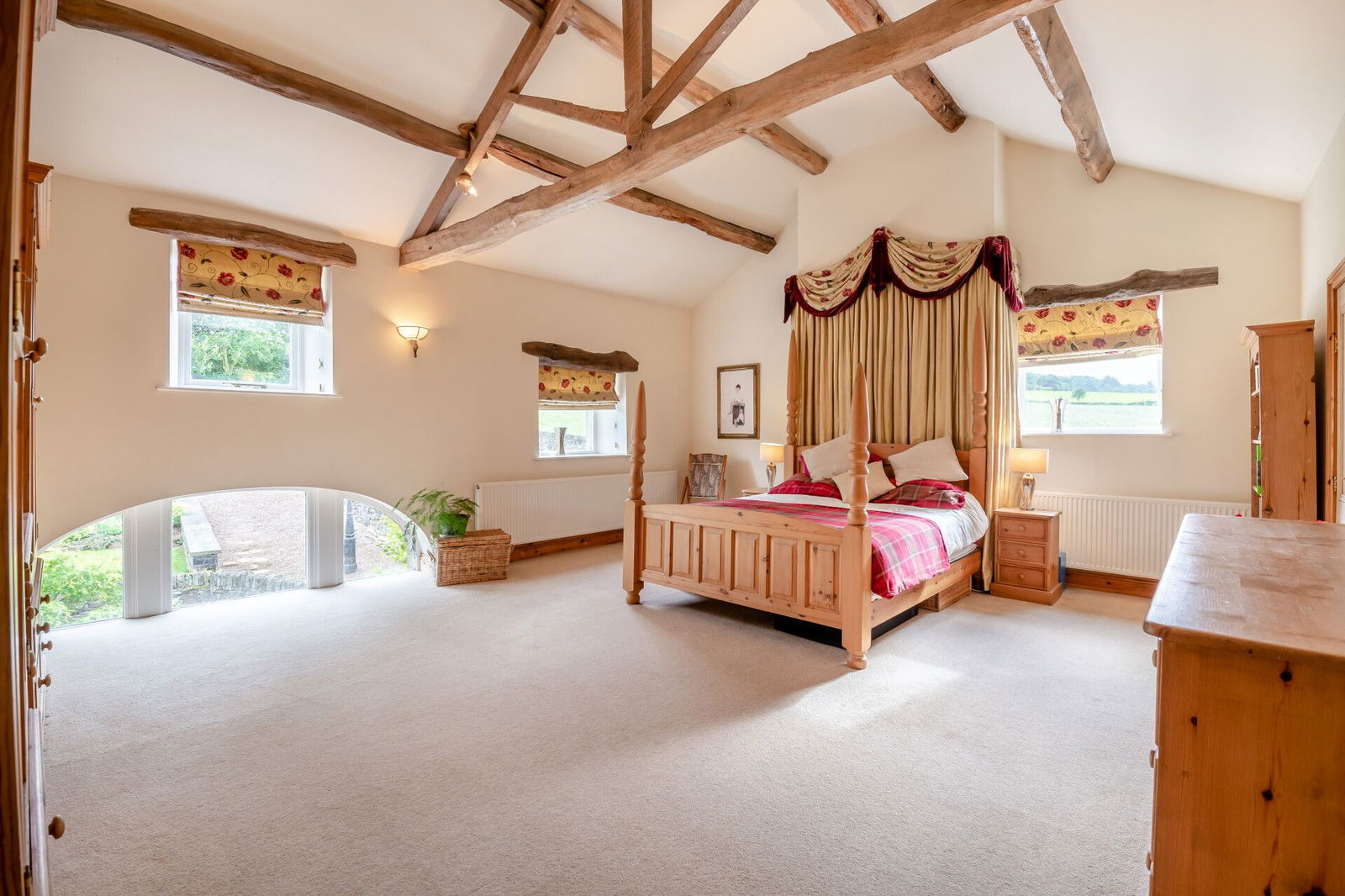 The master bedroom is of generous proportions and enjoys an outlook over the rear gardens. The beams and exposed timbers to the angled ceiling and the upper section of the barn arch are a reminder of the original history of the building. The en-suite shower room has a ‘4-piece’ suite which comprises a sunken double-ended bath, separate shower cubicle, WC and sink, with feature beamed ceiling.