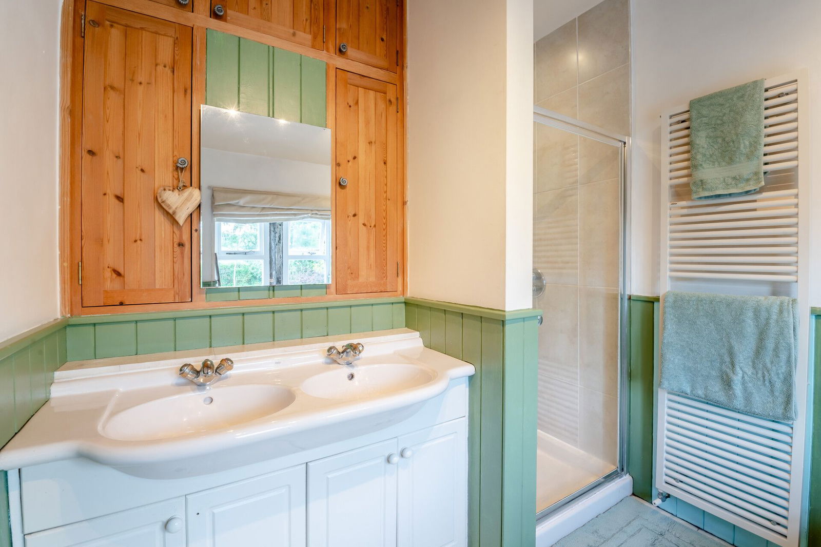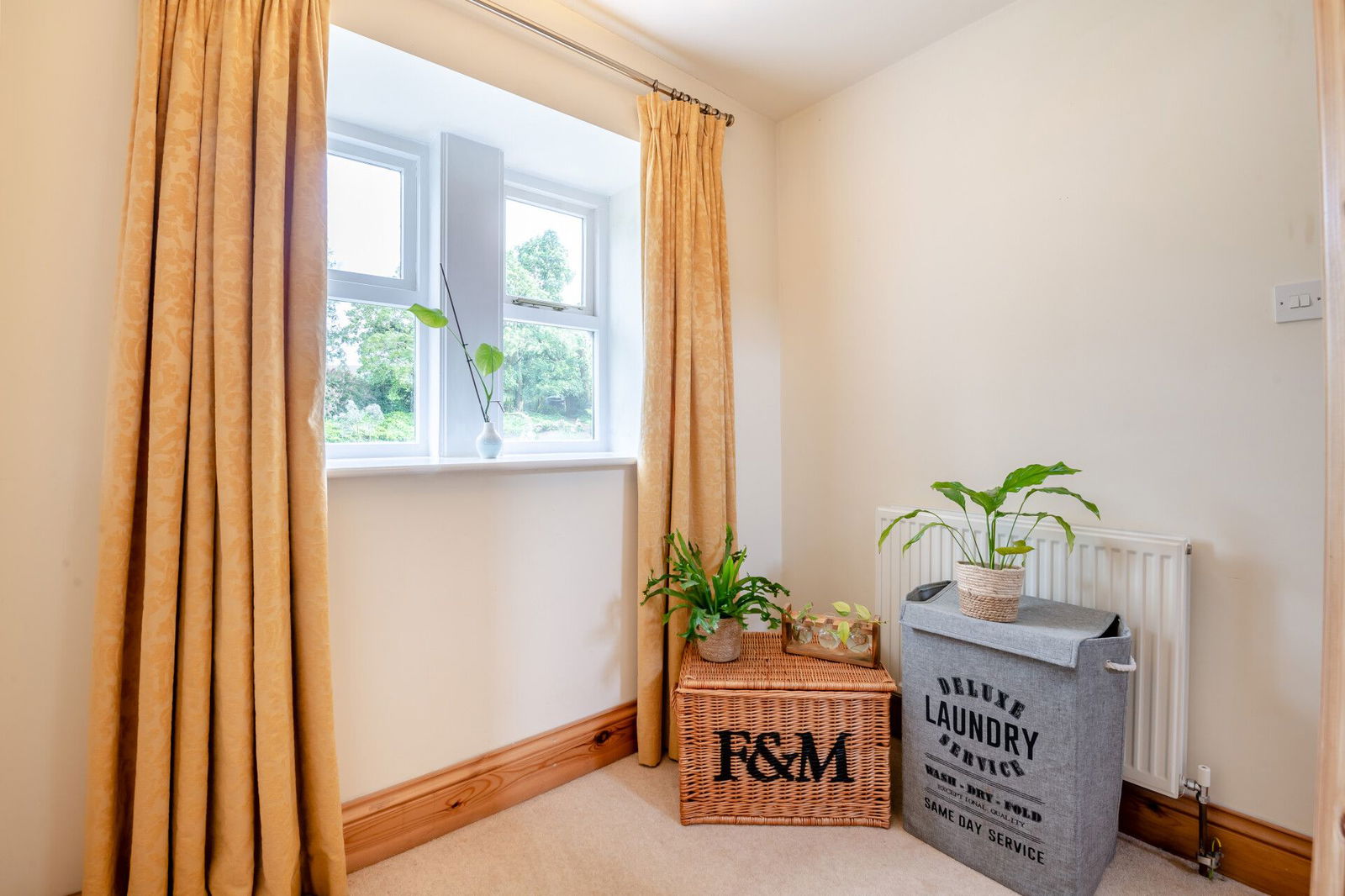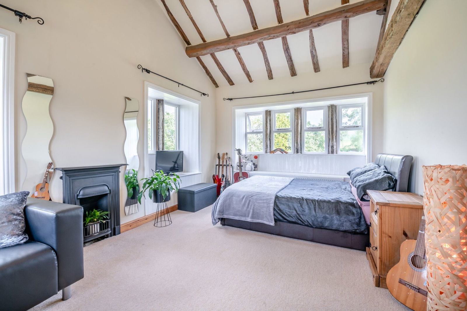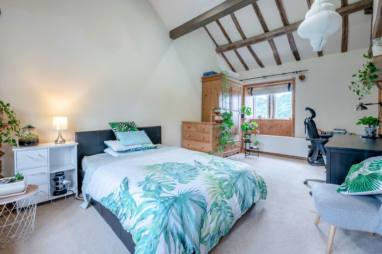 The master bedroom is of generous proportions and enjoys an outlook over the rear gardens. The beams and exposed timbers to the angled ceiling and the upper section of the barn arch are a reminder of the original history of the building. The en-suite shower room has a ‘4-piece’ suite which comprises a sunken double-ended bath, separate shower cubicle, WC and sink, with feature beamed ceiling.