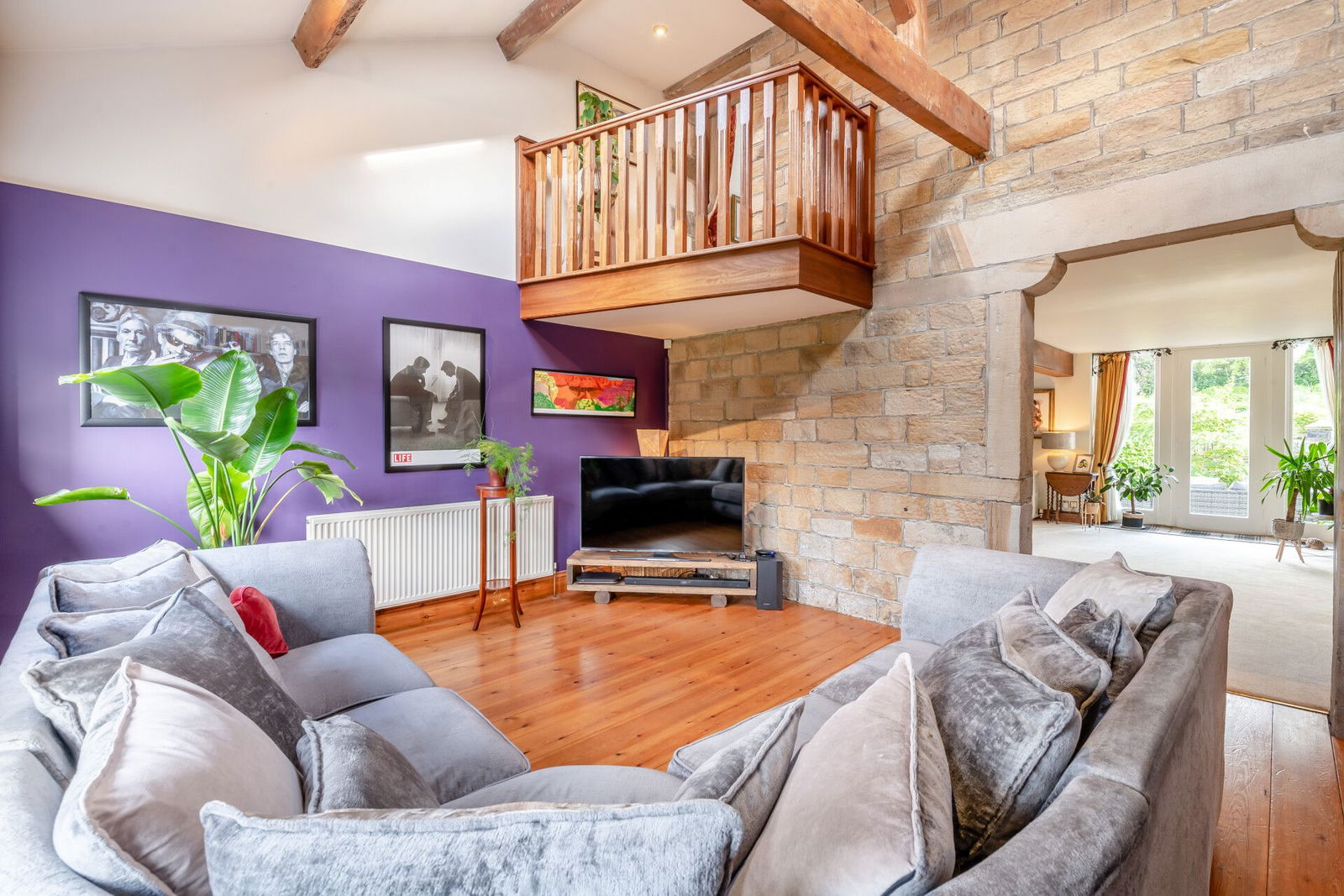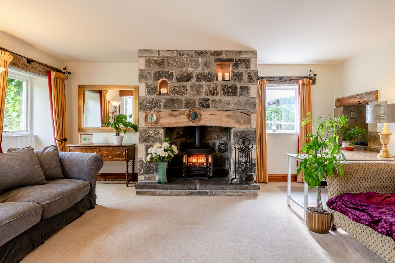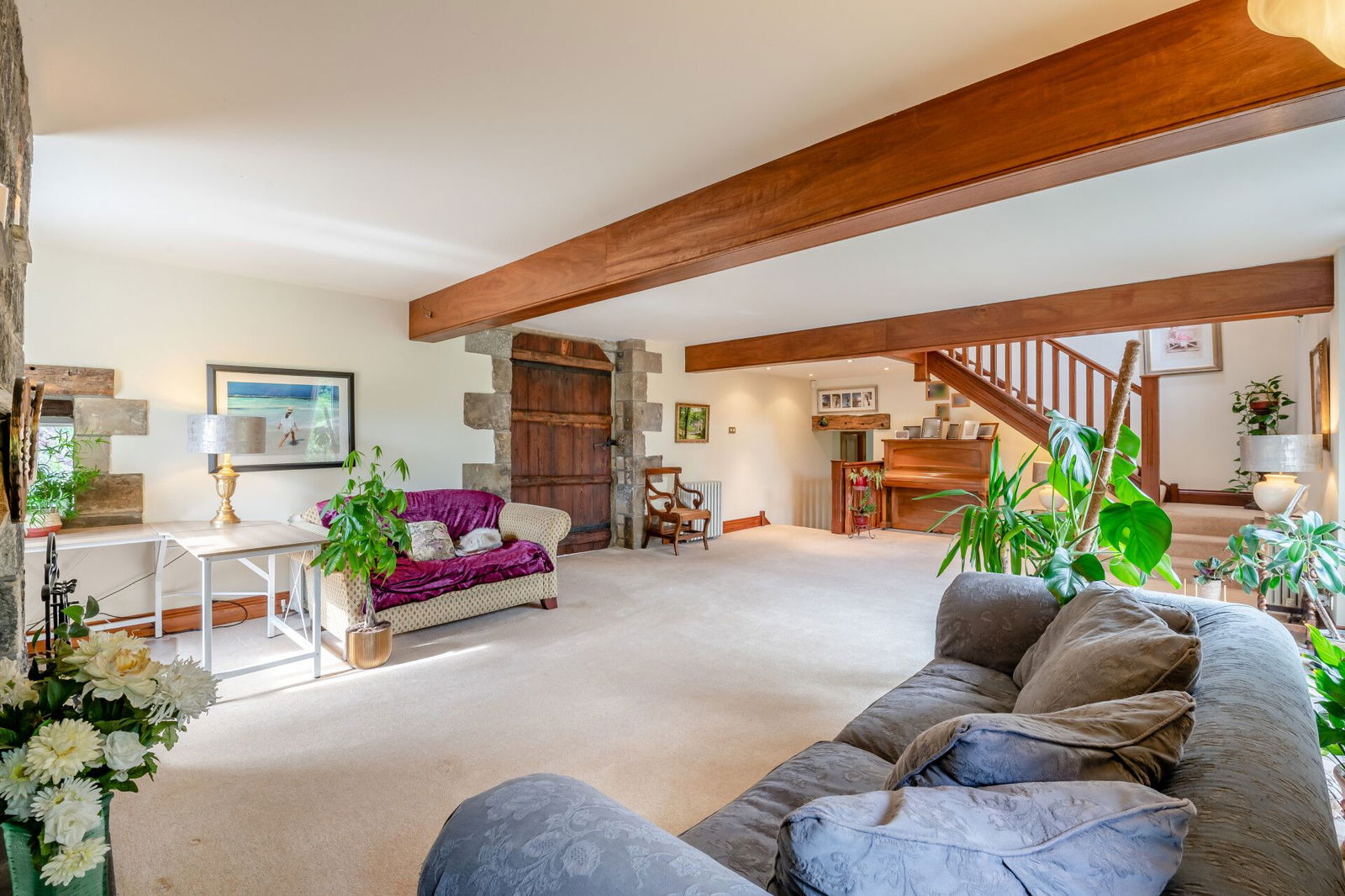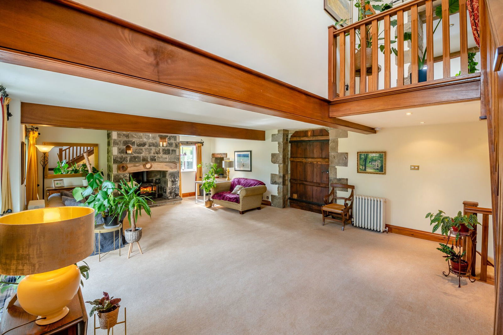 The open plan living dining kitchen offers an inviting ‘hub’ to the house. The floor is laid with stone flags and has eye-catching timber beams on display. There are windows to three sides which provide an outlook over the gardens, land and views beyond, and there is a part glazed stable style door that leads out to the gardens to the rear. To the kitchen there are quality modern shaker style base and wall units which are neutral in colour and complement the granite work surfaces. There is an inset Belfast sink with mixer tap over and plumbing for a dishwasher. Central to the kitchen and providing a focal point, there is an Electric AGA which has two ovens and two hot plates, and there is a separate integrated oven. The dining area offers a generous amount of space to accommodate a family sized dining table, and there is a stone fireplace which houses an oil-fired stove style fire. The attractive mullion windows overlook the garden and have window seating beneath. From the kitchen there is access to the pantry and down into the cellar. From the dining kitchen there is an open archway that leads into the lounge. This generous room offers character and charm with lovely views over the garden to the rear. The lounge features a beautiful stone chimney breast reaching up to the full height of the ceiling and houses a solid fuel burning cast iron stove. The original, over-sized, fully restored mistle door is a reminder of the history the property holds and is set within a stone archway that leads into the family room. The family room offers a wonderful space for use as a TV snug and music room. The levels are split into two sections, the upper level having library style bookshelving and exposed timber flooring which complements the exposed stone feature wall. This area creates a perfect space for use as a TV snug and has arched windows providing further character. The lower level, again with bespoke book shelving, has a built-in bar and could be used as a music room or home office. The room has an angled and exposed beamed ceiling and enjoys views through picture windows to the front of the property and beyond. From the main lounge there is an open staircase that leads to the first floor.