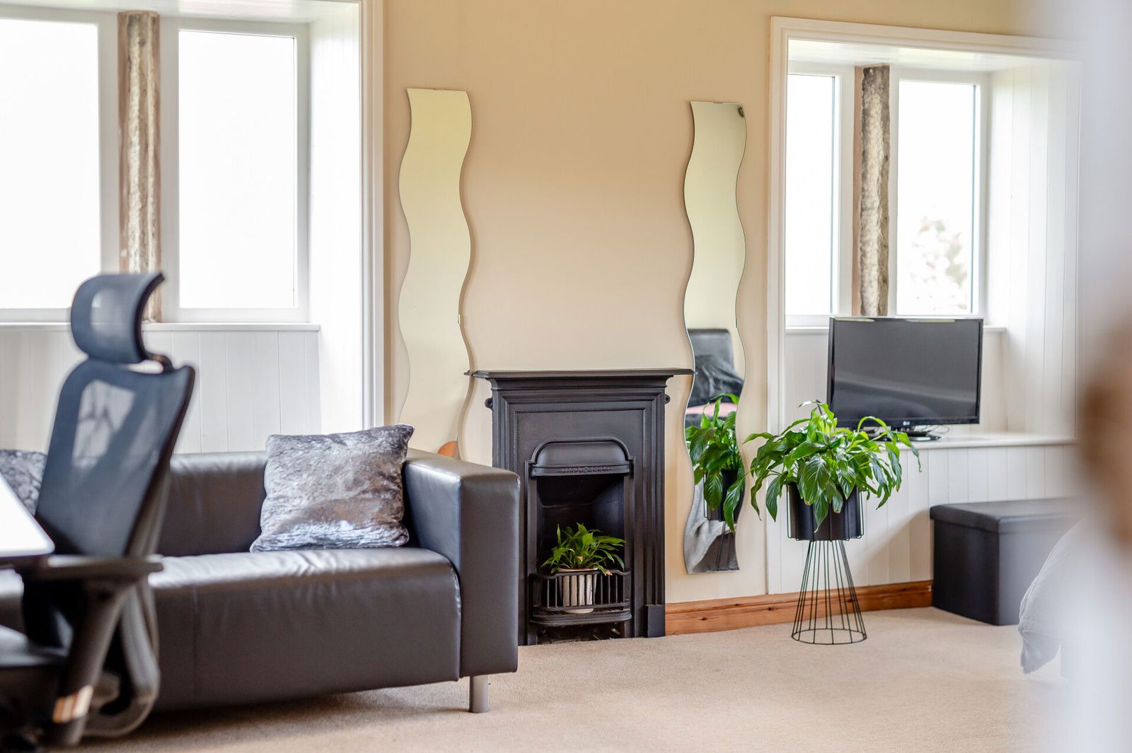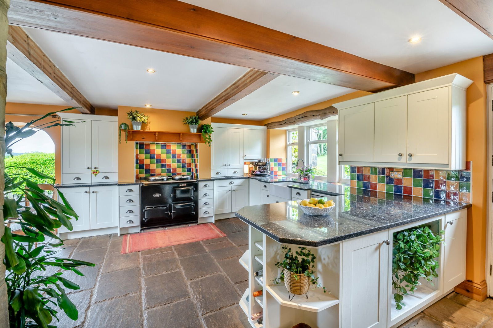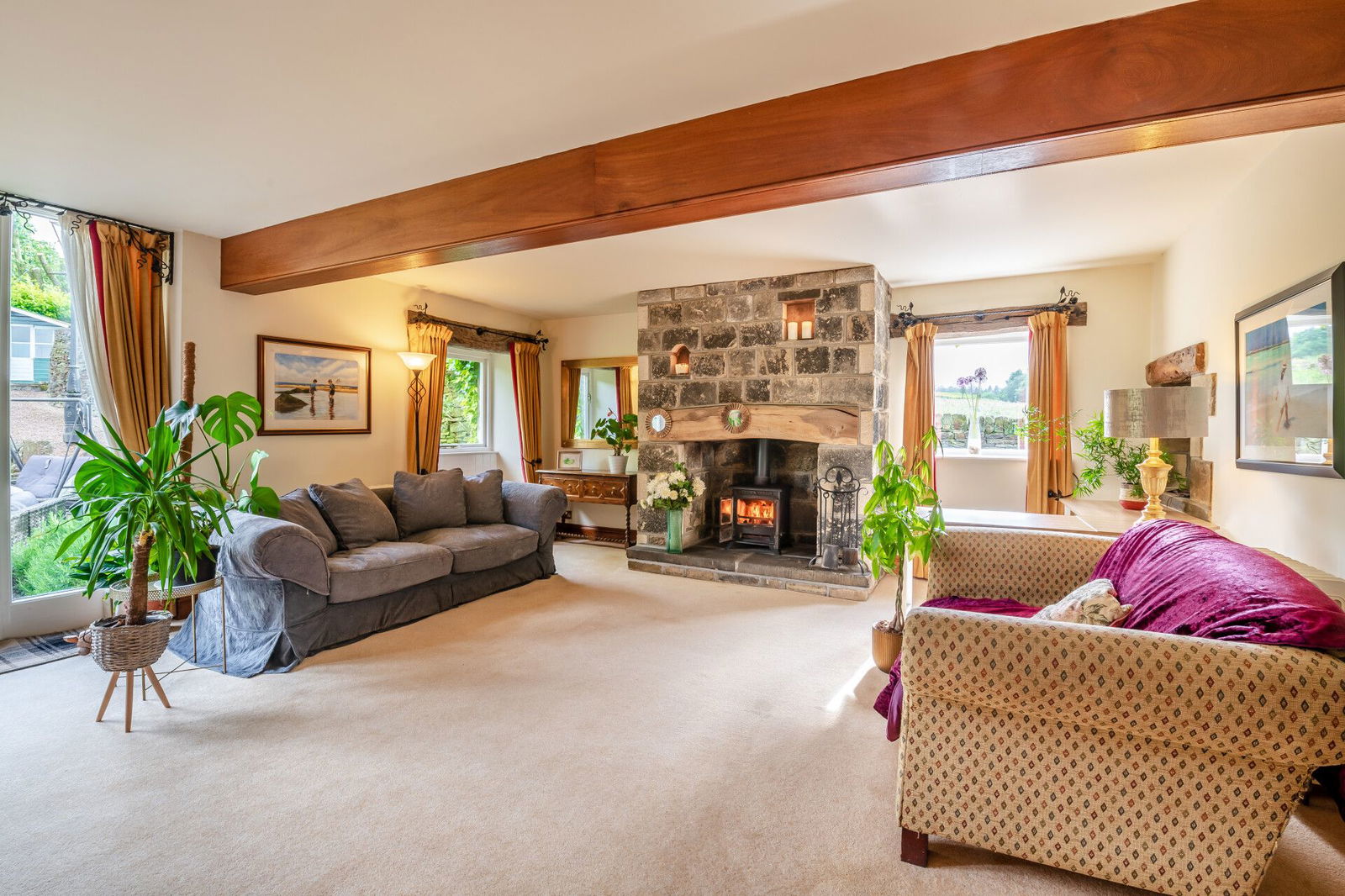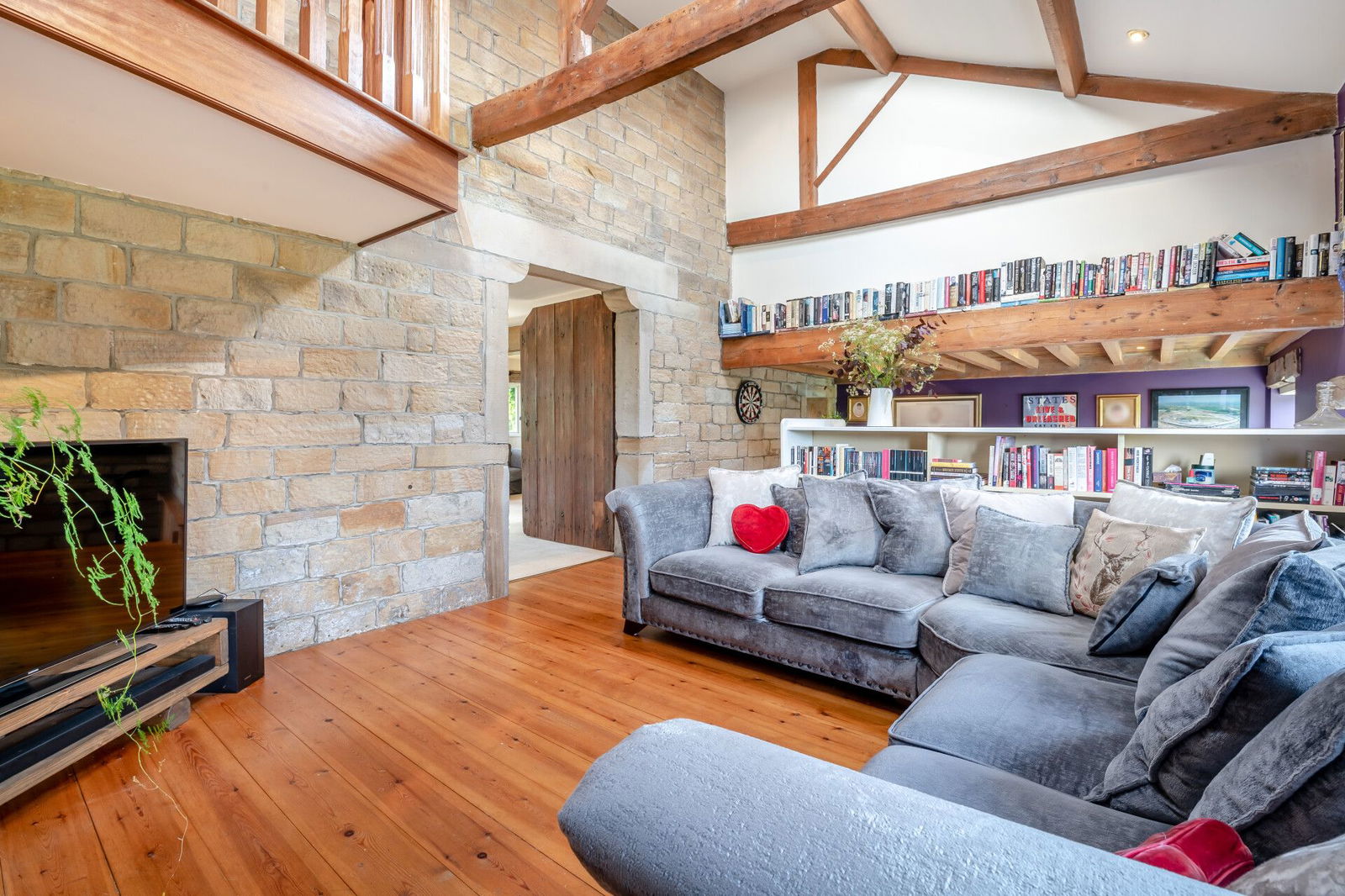 The open plan living dining kitchen offers an inviting ‘hub’ to the house. The floor is laid with stone flags and has eye-catching timber beams on display. There are windows to three sides which provide an outlook over the gardens, land and views beyond, and there is a part glazed stable style door that leads out to the gardens to the rear. To the kitchen there are quality modern shaker style base and wall units which are neutral in colour and complement the granite work surfaces. There is an inset Belfast sink with mixer tap over and plumbing for a dishwasher. Central to the kitchen and providing a focal point, there is an Electric AGA which has two ovens and two hot plates, and there is a separate integrated oven. The dining area offers a generous amount of space to accommodate a family sized dining table, and there is a stone fireplace which houses an oil-fired stove style fire. The attractive mullion windows overlook the garden and have window seating beneath. From the kitchen there is access to the pantry and down into the cellar. From the dining kitchen there is an open archway that leads into the lounge. This generous room offers character and charm with lovely views over the garden to the rear. The lounge features a beautiful stone chimney breast reaching up to the full height of the ceiling and houses a solid fuel burning cast iron stove. The original, over-sized, fully restored mistle door is a reminder of the history the property holds and is set within a stone archway that leads into the family room. The family room offers a wonderful space for use as a TV snug and music room. The levels are split into two sections, the upper level having library style bookshelving and exposed timber flooring which complements the exposed stone feature wall. This area creates a perfect space for use as a TV snug and has arched windows providing further character. The lower level, again with bespoke book shelving, has a built-in bar and could be used as a music room or home office. The room has an angled and exposed beamed ceiling and enjoys views through picture windows to the front of the property and beyond. From the main lounge there is an open staircase that leads to the first floor.