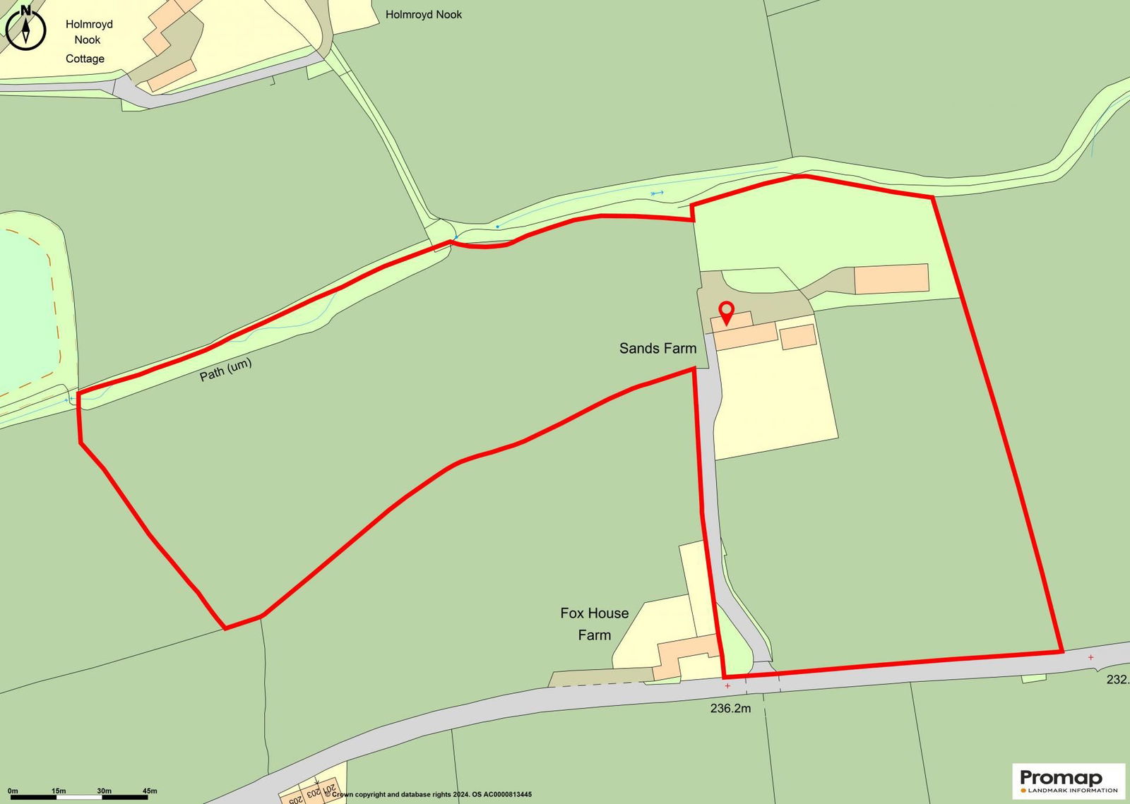 This detached modern style agricultural barn measures 2303sq ft, has timber sliding doors, a workshop and a stable, all of which have concrete flooring. Much flexibility exists at Sands Farm, whether this be for equestrian, agricultural or any other interests which could make use of this large adaptable space. The barn was originally built for the housing of cattle, there is a good amount of land adjoining the barn providing useful yard space and there is a concreted forecourt area before it. The two large fields are of high quality, being gently sloping and with well-established boundaries and all are accessed internally. The driveway and the field have a public footpath over part of them and there is a lovely walk from here up and down the valley and into the local woods with Honley village being a short walk over the hillside.