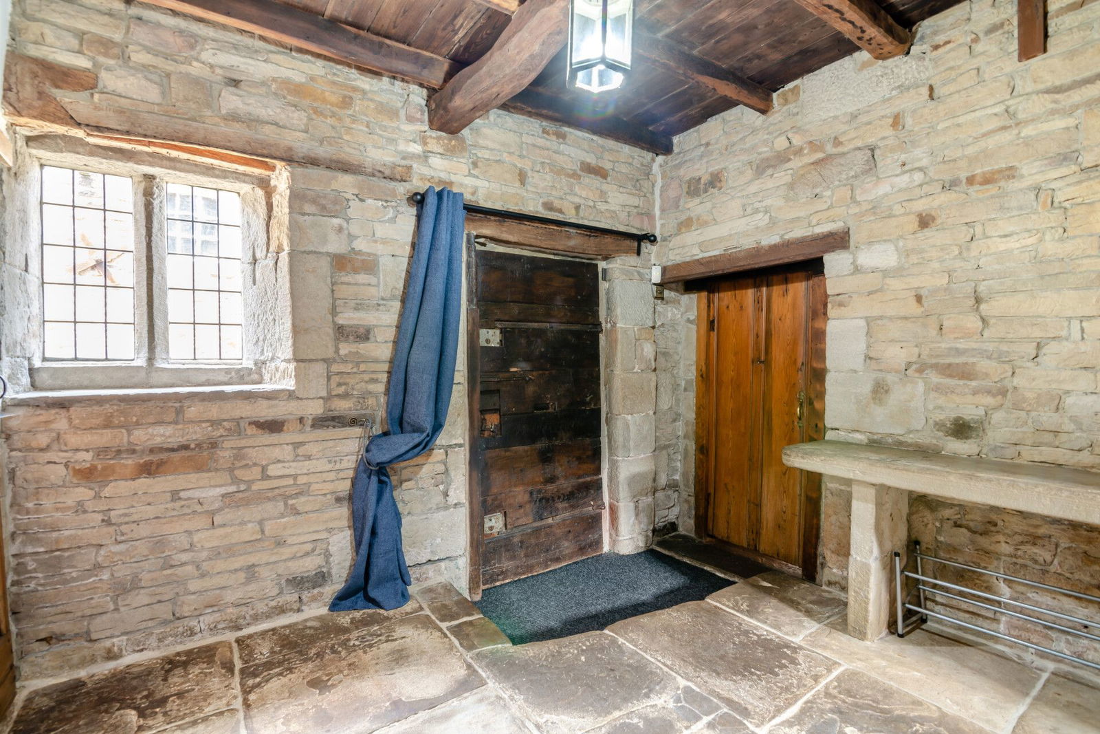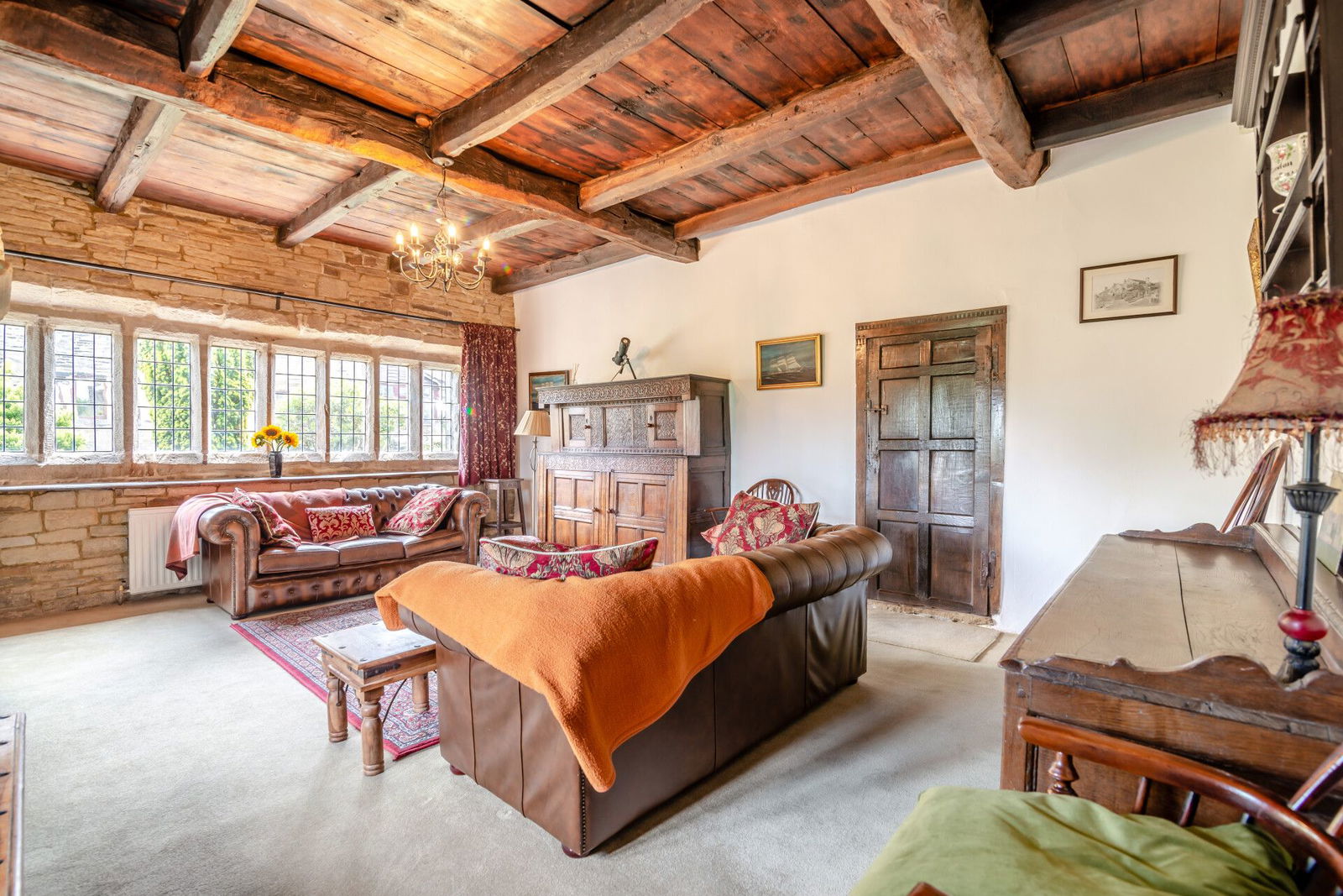 A grand dining room offers expansive proportions, has windows set to stone mullioned surrounds at both the front and rear aspects of the room, a stone flagged floor, beams to the ceiling, beautiful stonework to the walls and reclaimed 16th century oak panelling with carved frieze imported from Earlesheaton Hall, Dewsbury when it was demolished. An inglenook stone fireplace has a real fire sat on a stonehearth with cast iron crest plate behind.