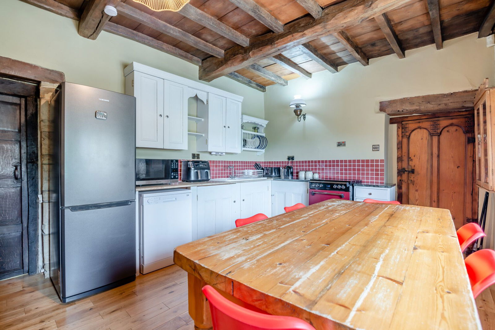 The living kitchen has windows set to stone mullioned surrounds, has exposed floorboards and original trusses to the ceiling, presents a range of furniture with contrasting work surfaces incorporating a sink with tiled splashbacks, an electric cooker point, plumbing for a dishwasher and space for a larder style fridge freezer.