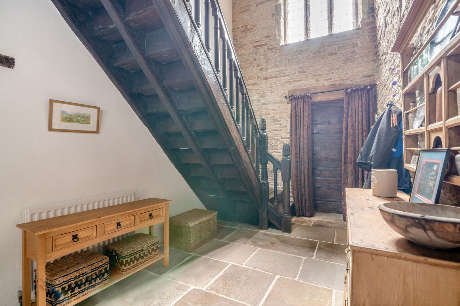 An inner hall has an original staircase to first floor, the half landing passing stone mullioned windows. There is also access to a small keeping cellar.