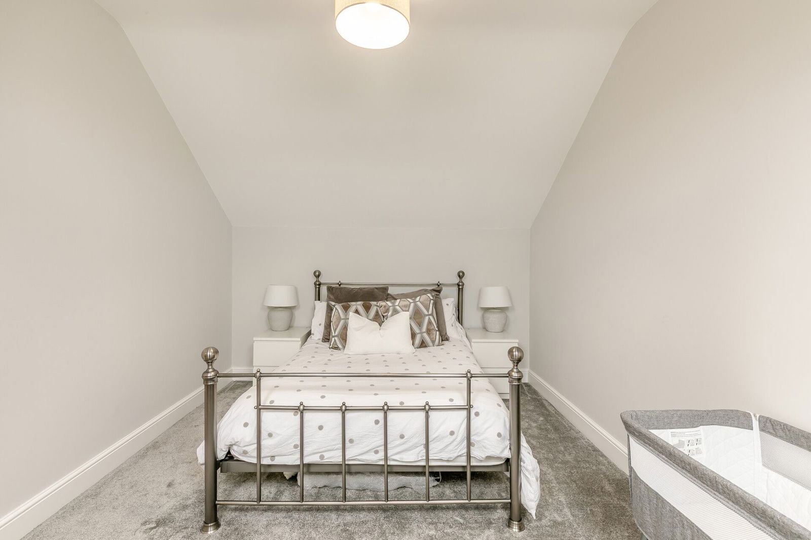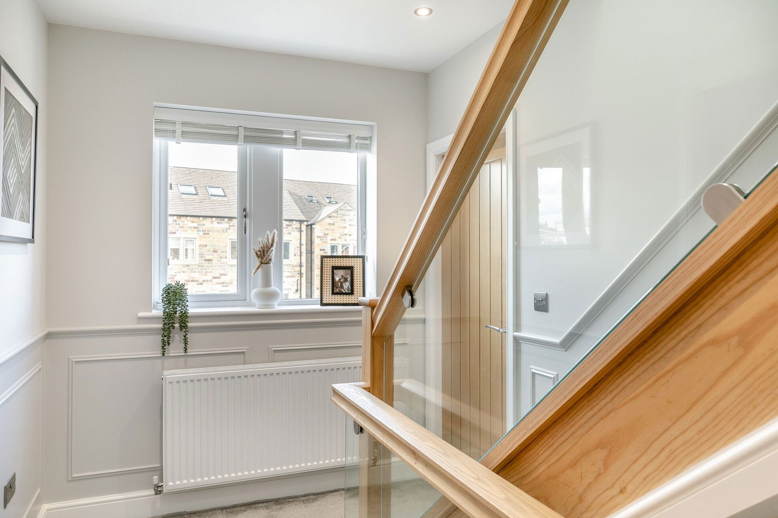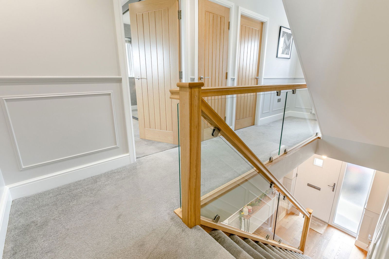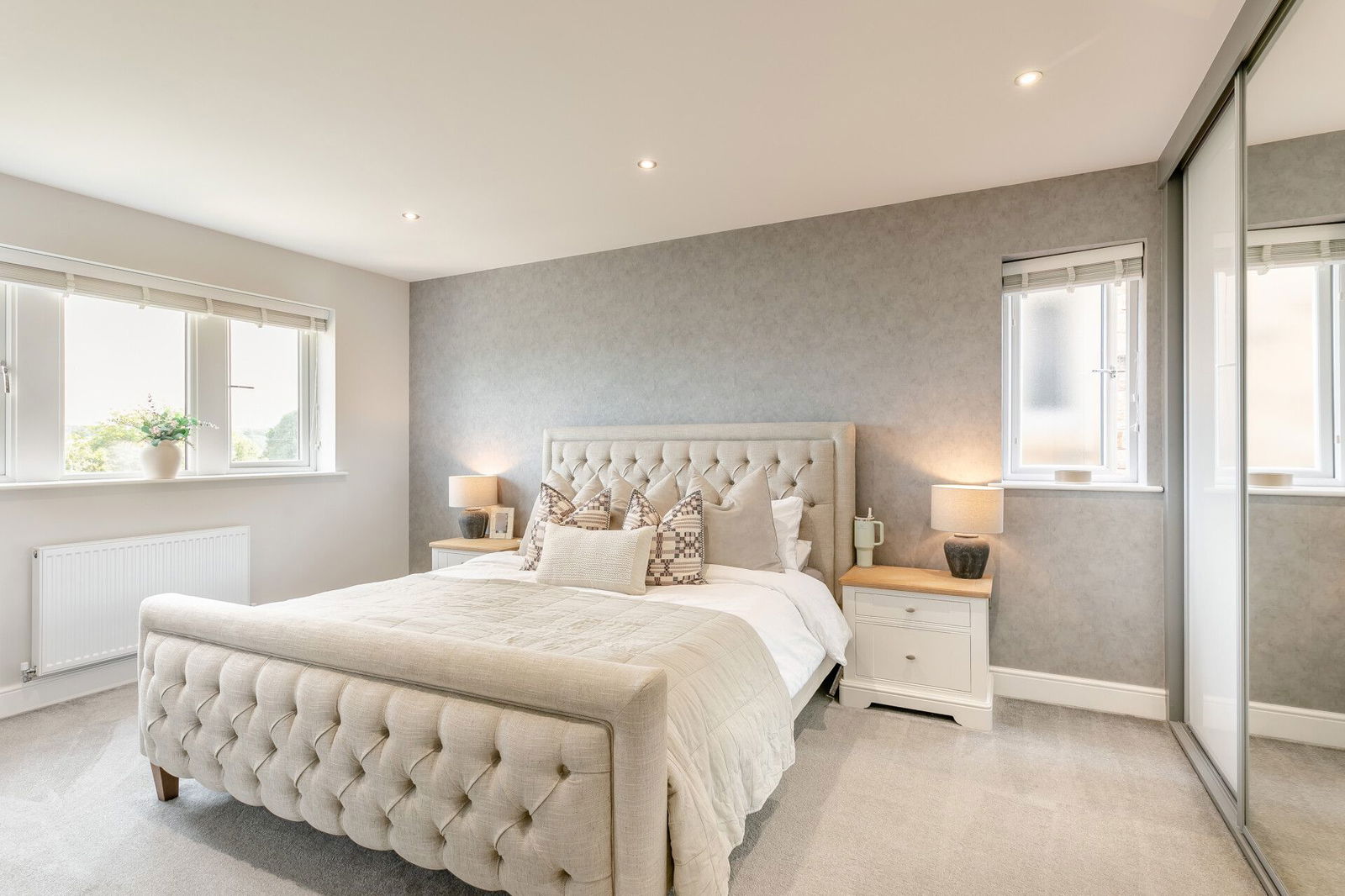 The landing has a continuation of the oak and glass staircase, has a useful storage cupboard and a window to the front aspect. The principal bedroom suite offers generous double accommodation, is positioned to the rear aspect of the home, windows set to stone mullioned surrounds overlooking the gardens and commanding stunning long distance views beyond. There are fitted wardrobes to one wall and en-suite facilities comprising a wall hung W.C and wash hand basin with inset vanity drawers, a double shower, the room finished with complementary tiling to the walls and floor, a frosted window and heated Chrome towel radiator.