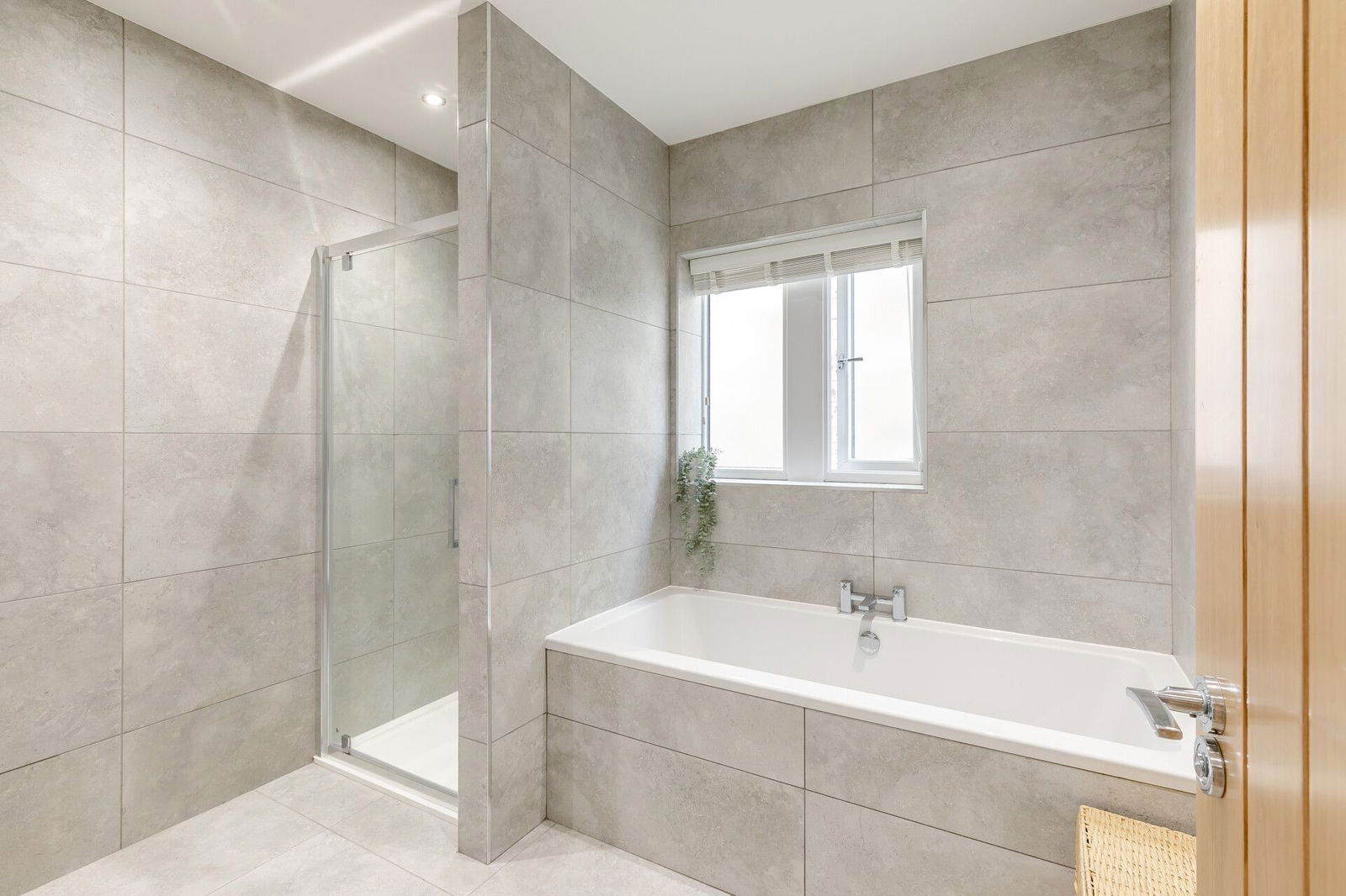 The family bathroom offers generous accommodation, is presented with a double ended bath, a low flush W.C, a shower and a wall hung wash hand basin with vanity drawers, the room complemented by tiling to the walls and floor, a heated towel rail and a frosted window.
