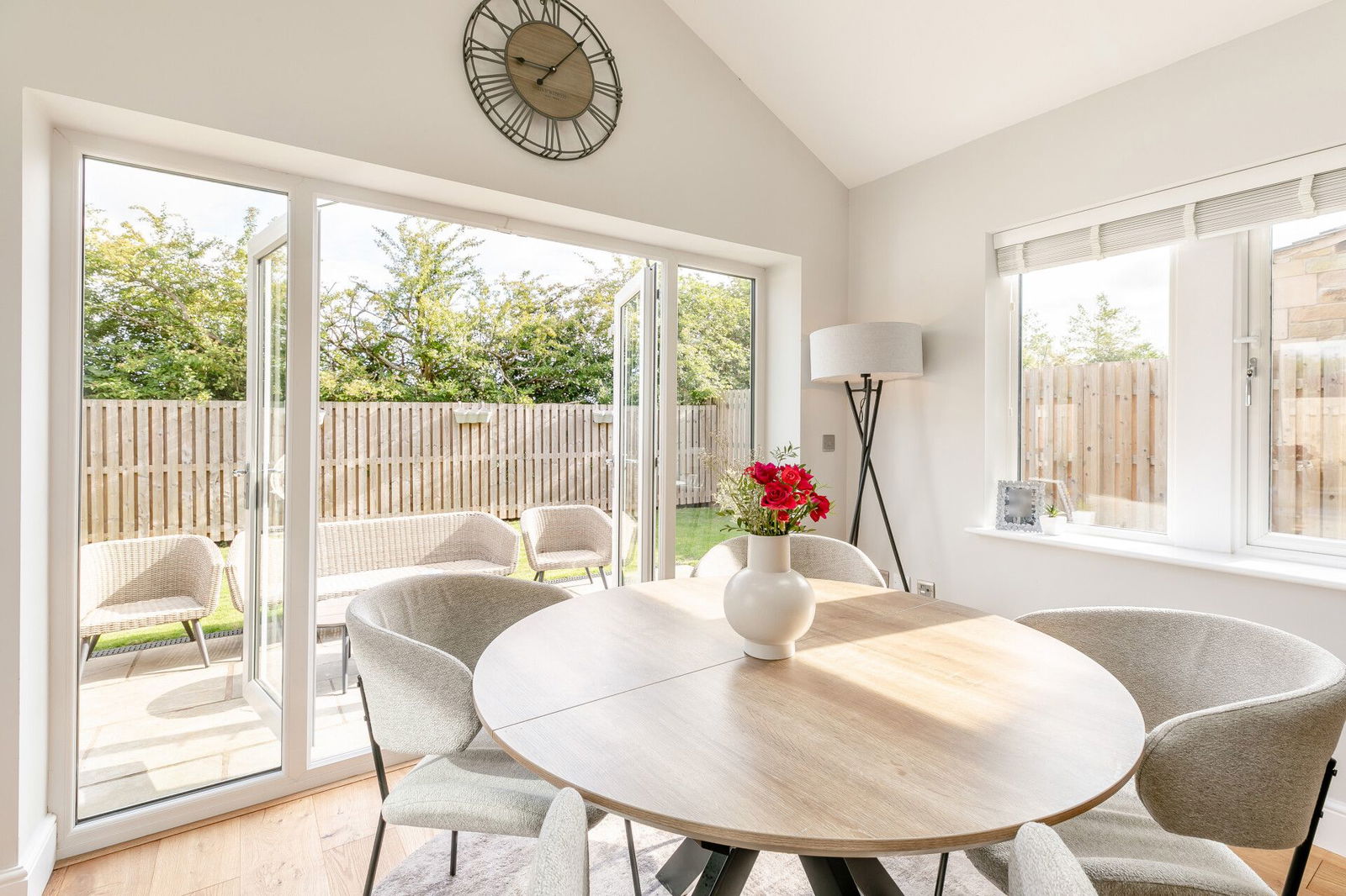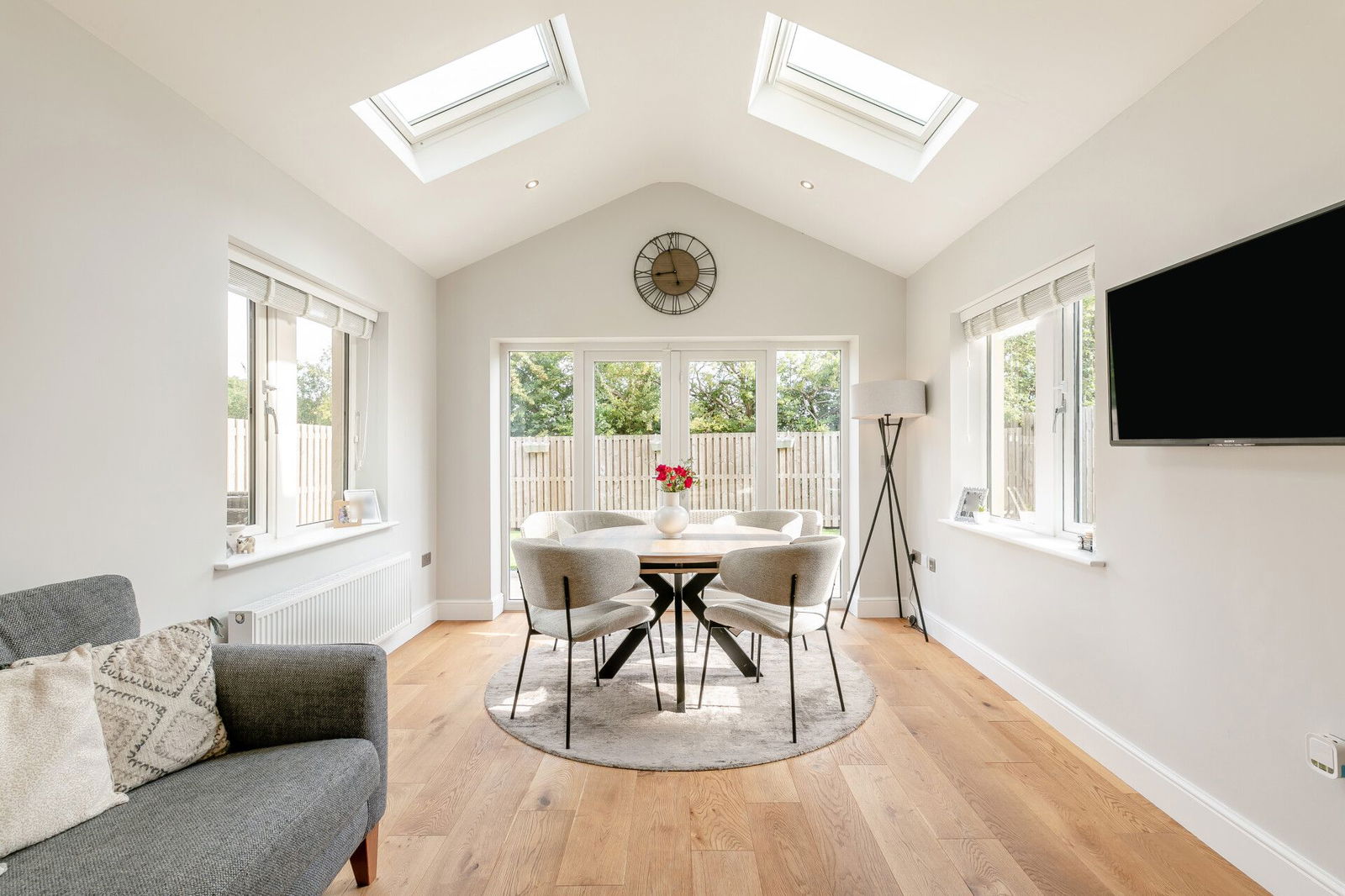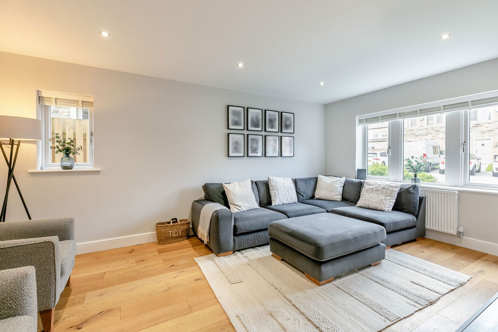 A generous lounge with an engineered oak floor, positioned to the front aspect of the home enjoying a double aspect position with windows to two elevations, the front set within stone mullioned surrounds.