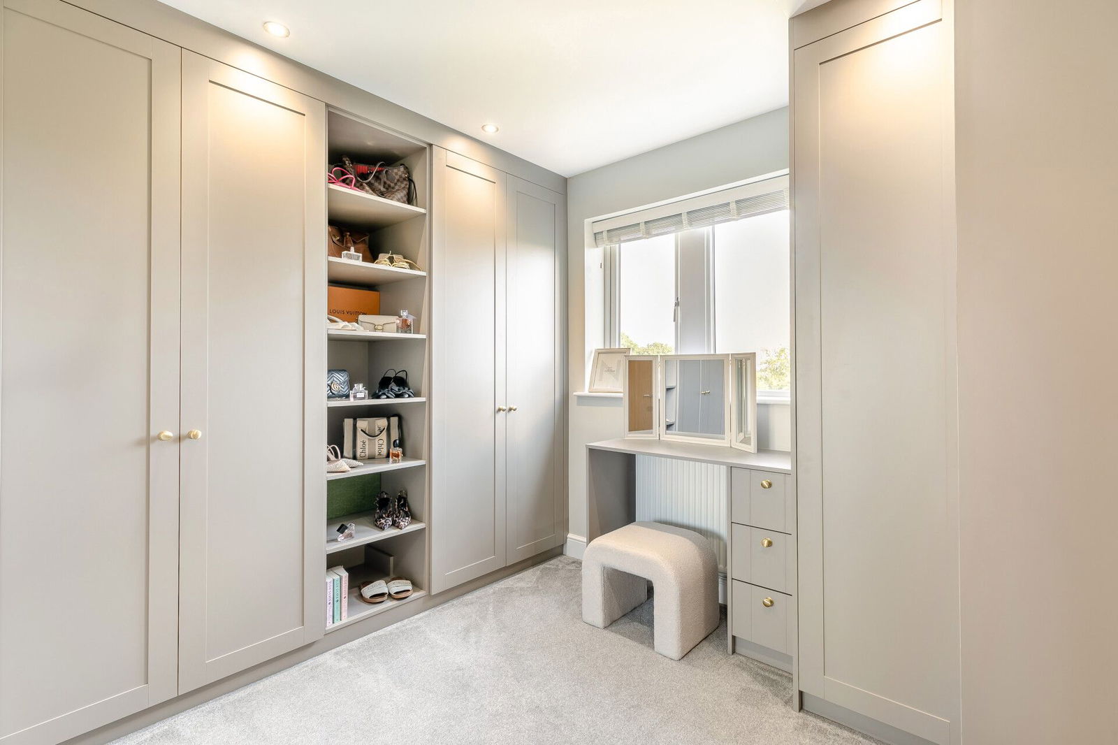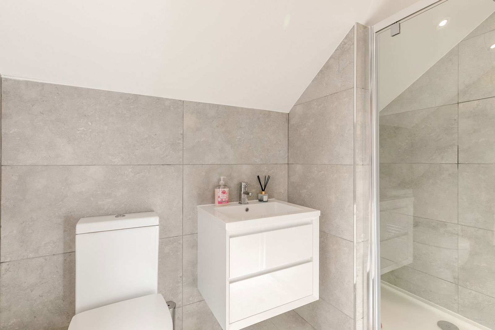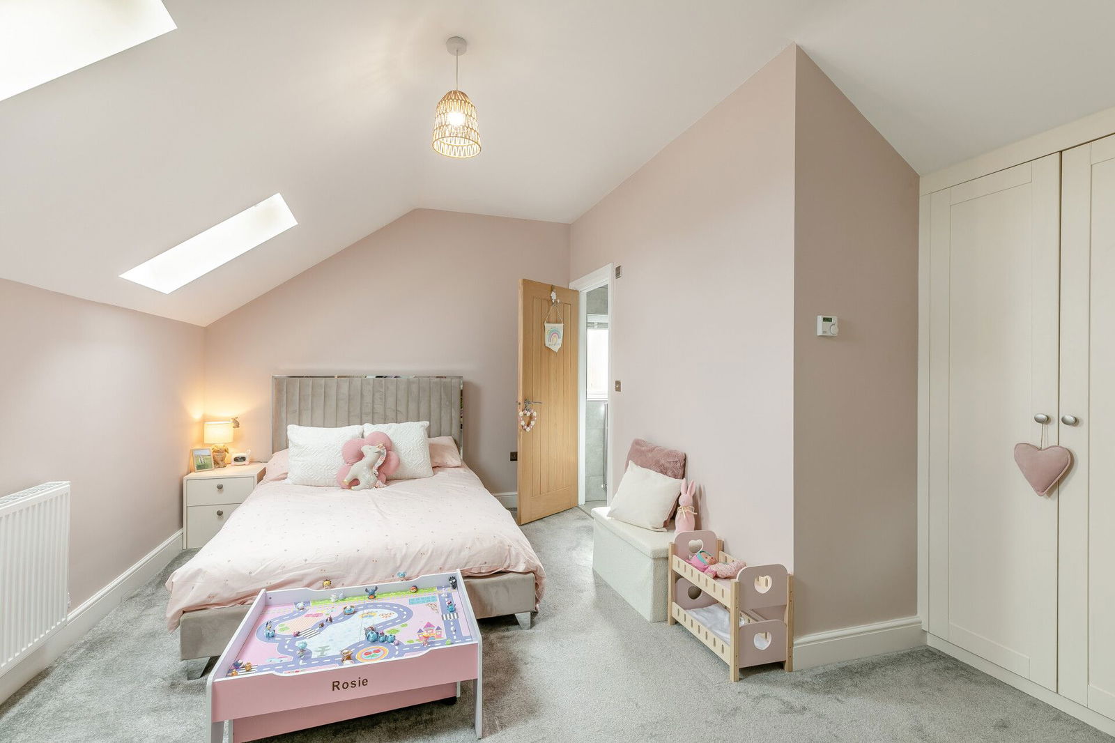 A central landing has a useful storage cupboard. There are double bedrooms each having Velux skylight windows, one of the rooms presented with three piece en-suite accommodation consisting of a low flush W.C, a shower and a wall hung wash hand basin with vanity drawers, complementary tiling to the walls and floor, a frosted window and a heated towel radiator. Bedroom furniture to this room includes fitted wardrobes and drawer units.