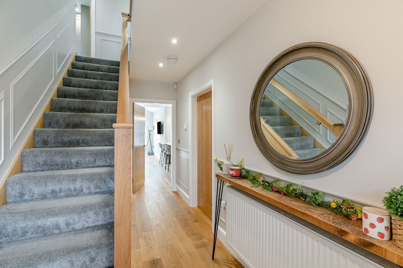 An entrance door is sheltered by an open fronted storm porch and opens to the reception hall which provides an impressive introduction to the home offering a glimpse through the living kitchen to the garden; the hallway has a bespoke oak and glass staircase with useful storage beneath and has an engineered oak floor. A personnel doors gains access not the garage.