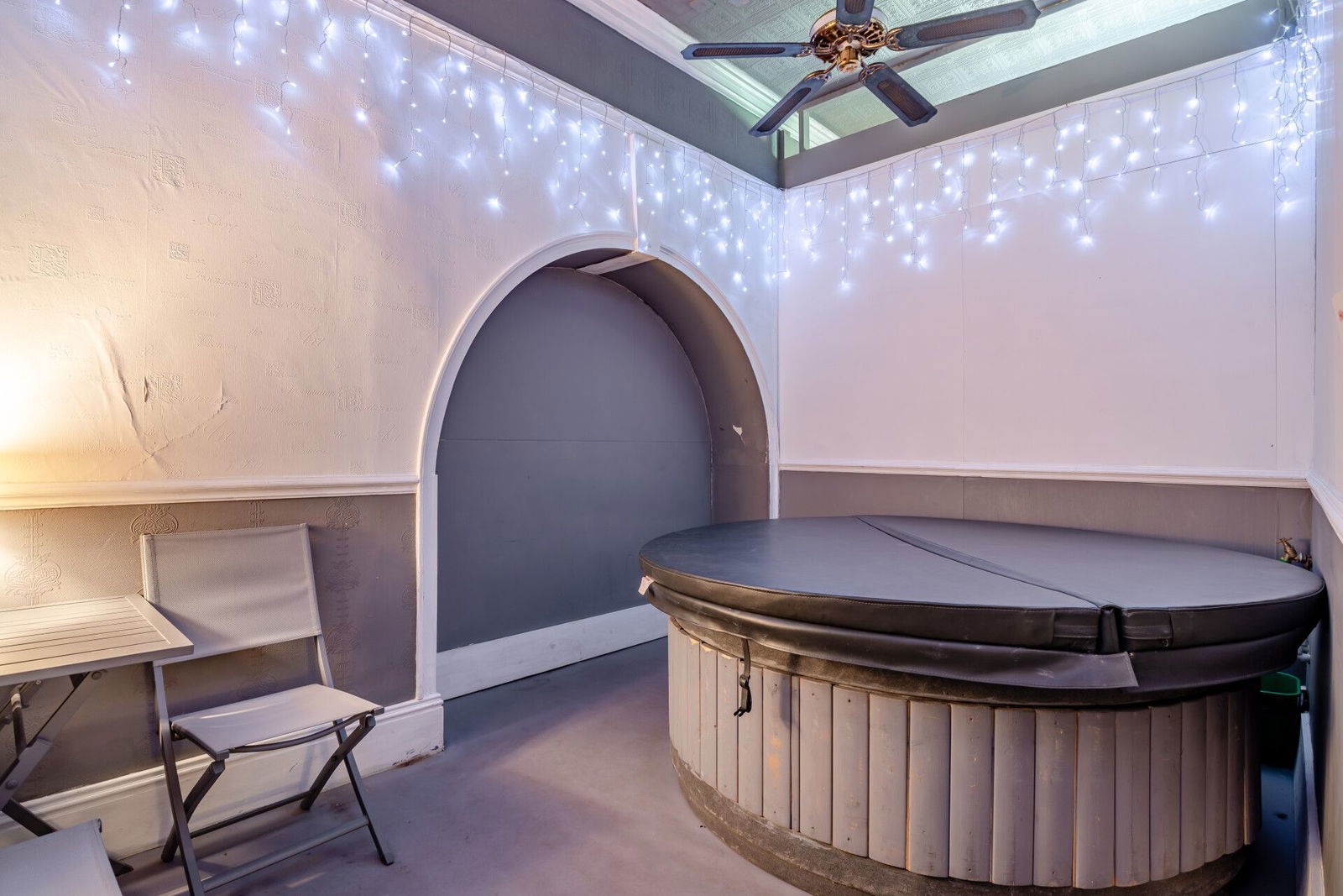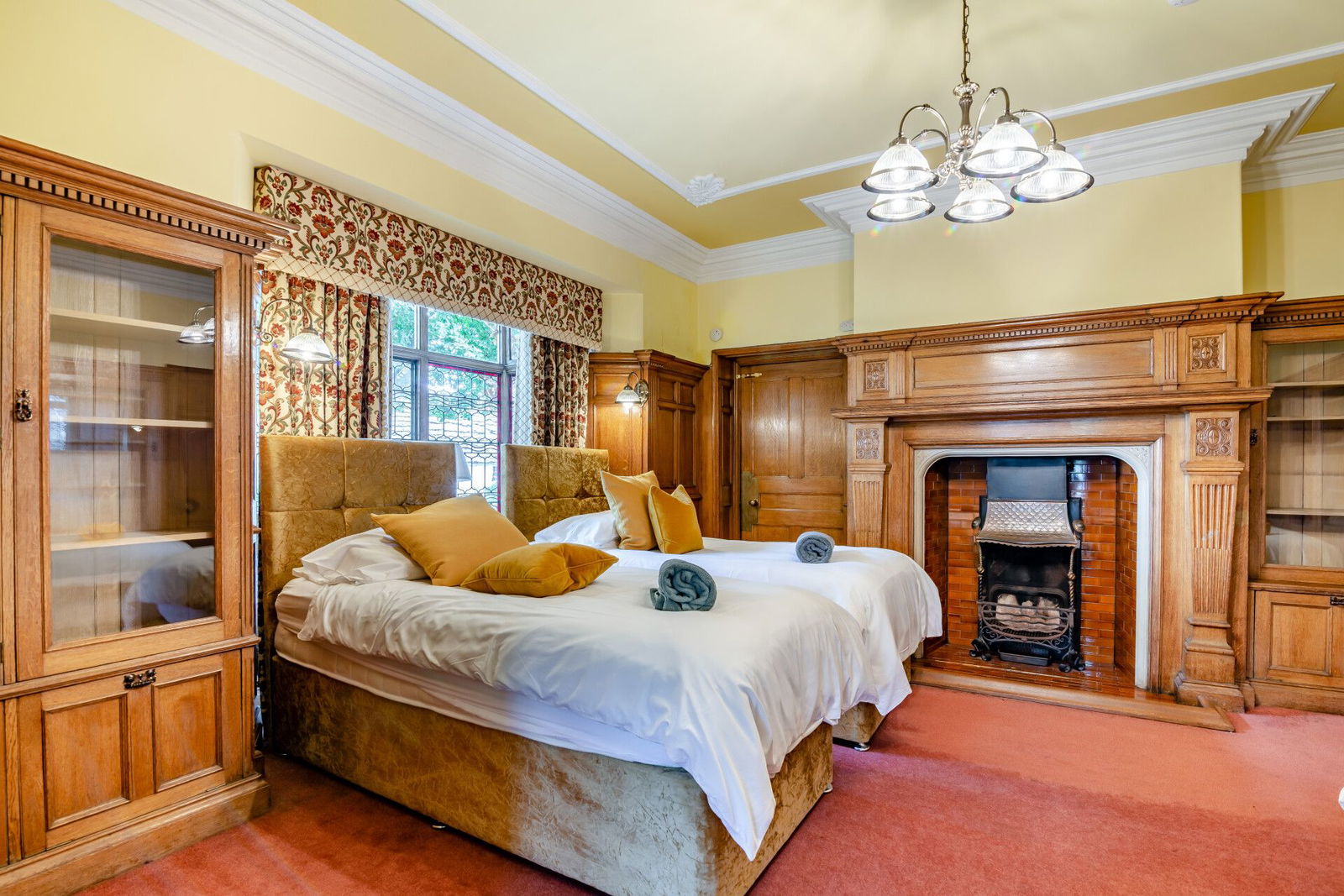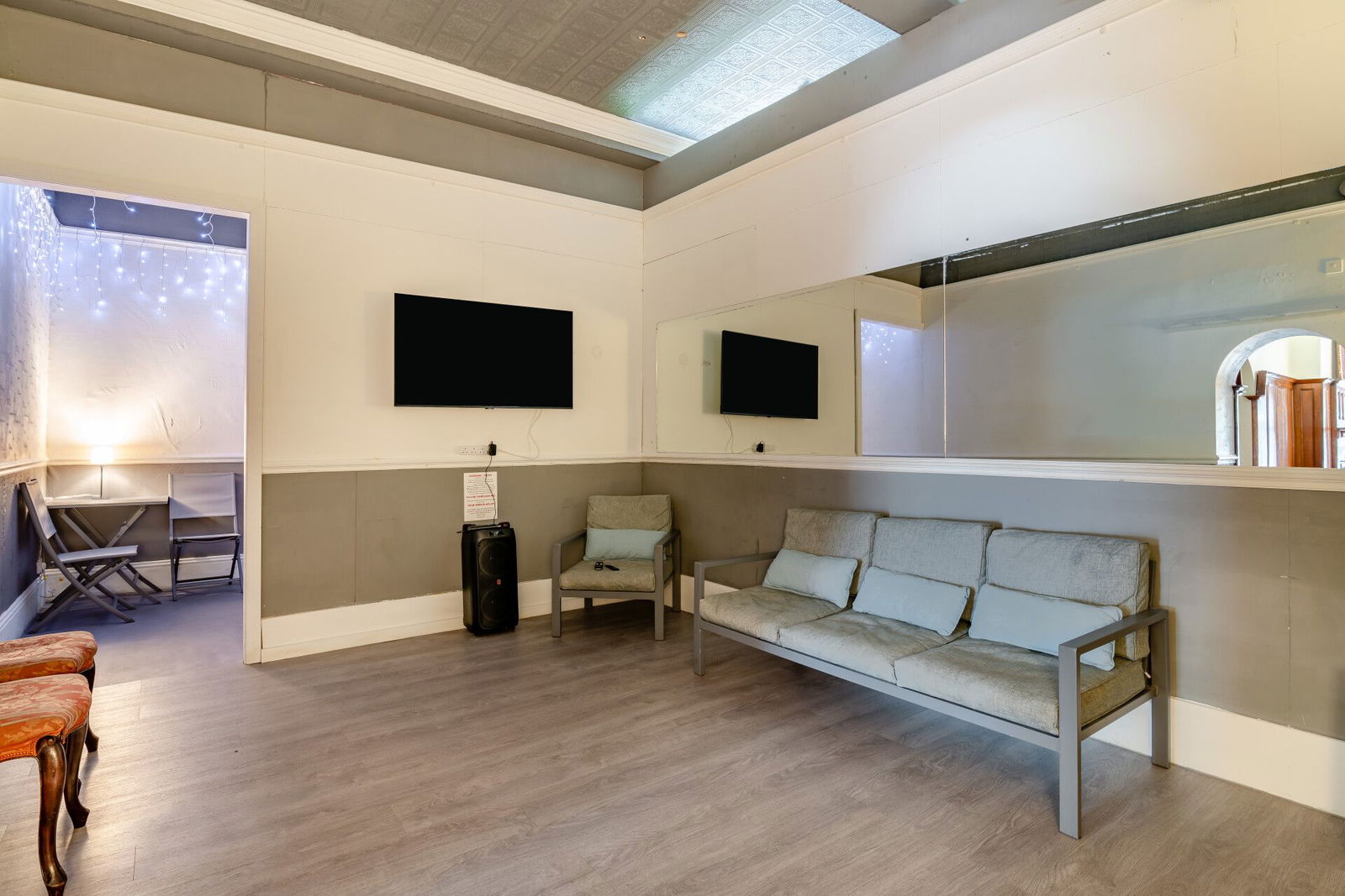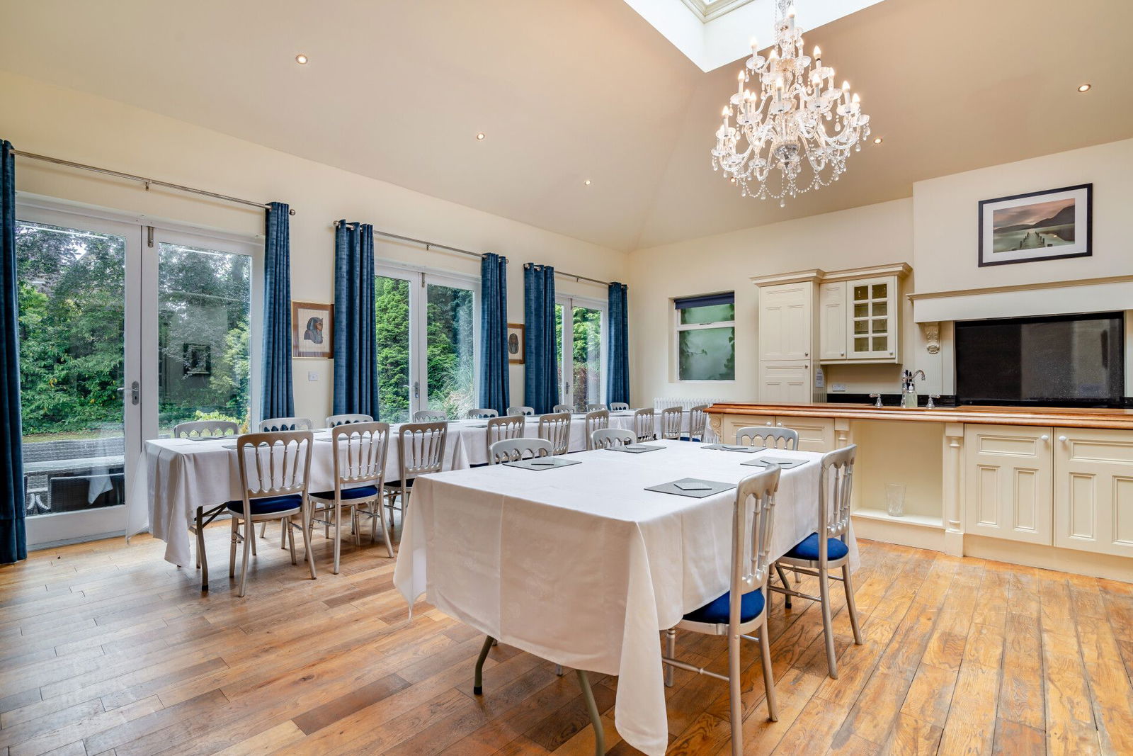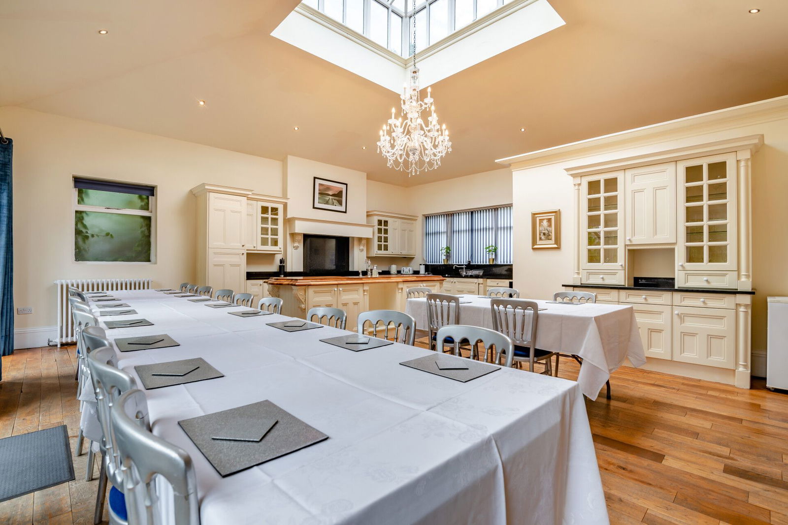 From the hallway there is open plan access to an impressive dining room which has sash windows overlooking the gardens, oak floorboards, traditional cast iron radiators with oak covers over, feature oak panelling to the walls and a stunning fireplace with ornate tiled detailing which is home to a real flame fire. There is a small storeroom and access to the cinema / leisure room which once again displays original period features and leads through to a versatile room currently used to house a hot tub.