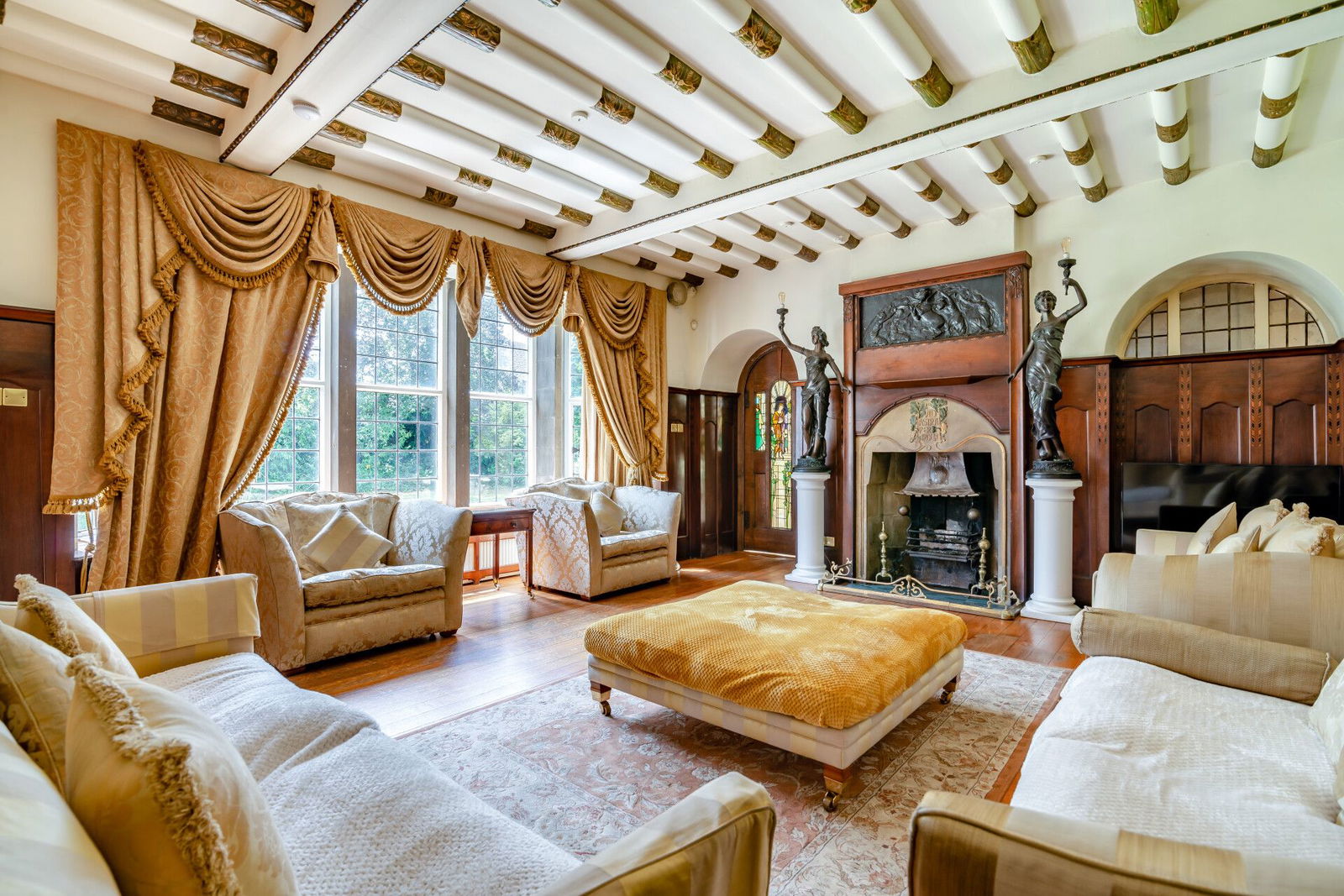 The lounge offers generous accommodation, displays ornate detailing to the ceiling, has beautiful wood panelling to the walls and a fantastic Bay window which overlooks the gardens; exposed oak floorboards are on display and a period correct fireplace with carved stone inset and backcloth has a dog great real flame fire that stands on a tiled hearth.