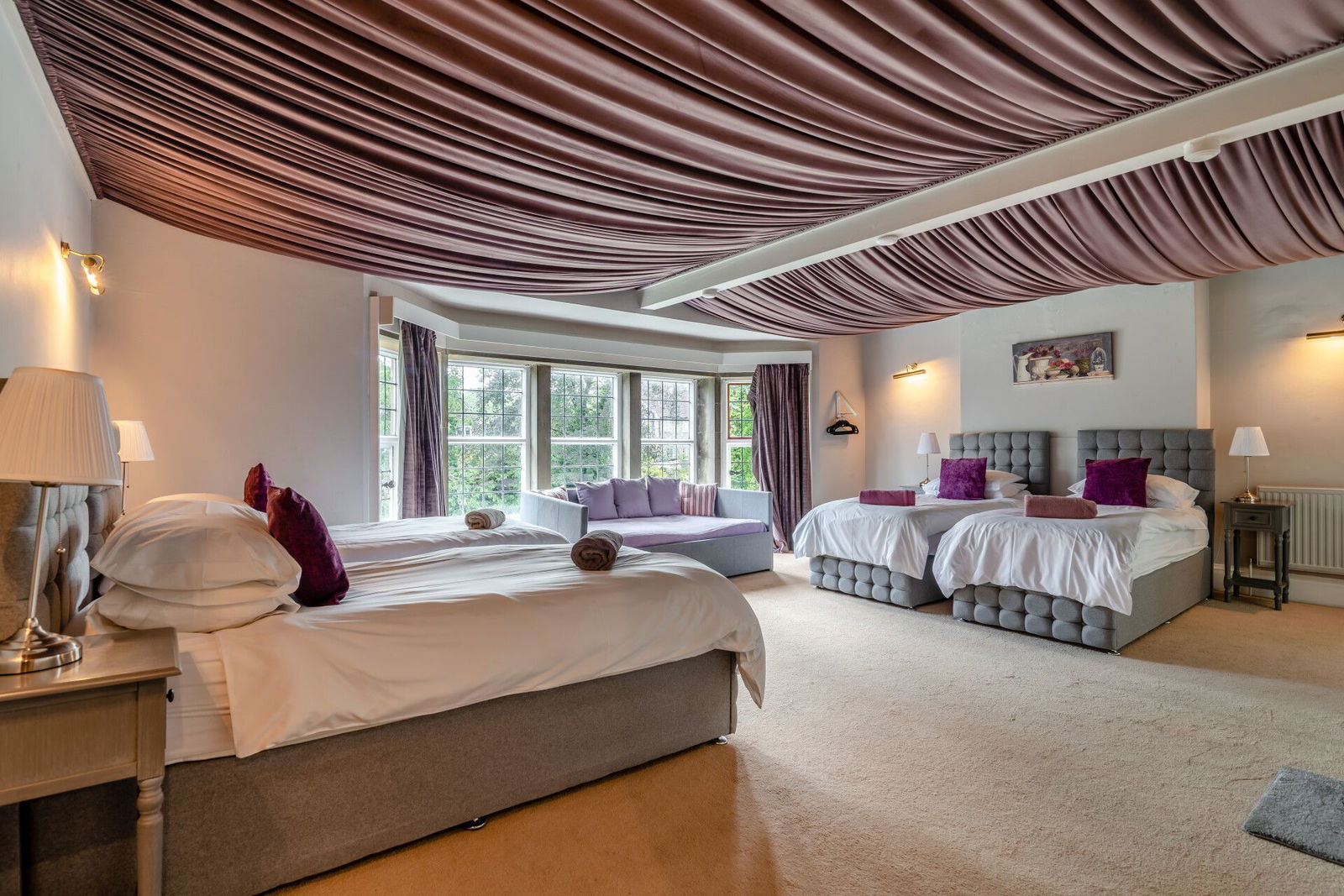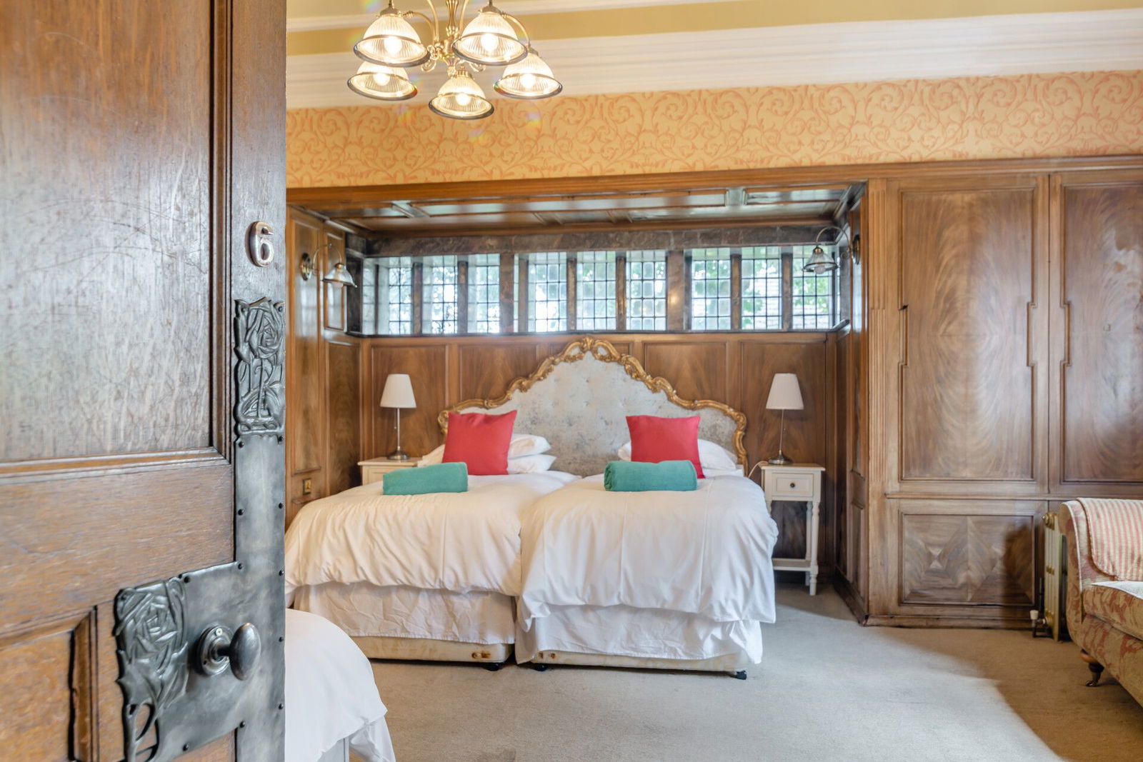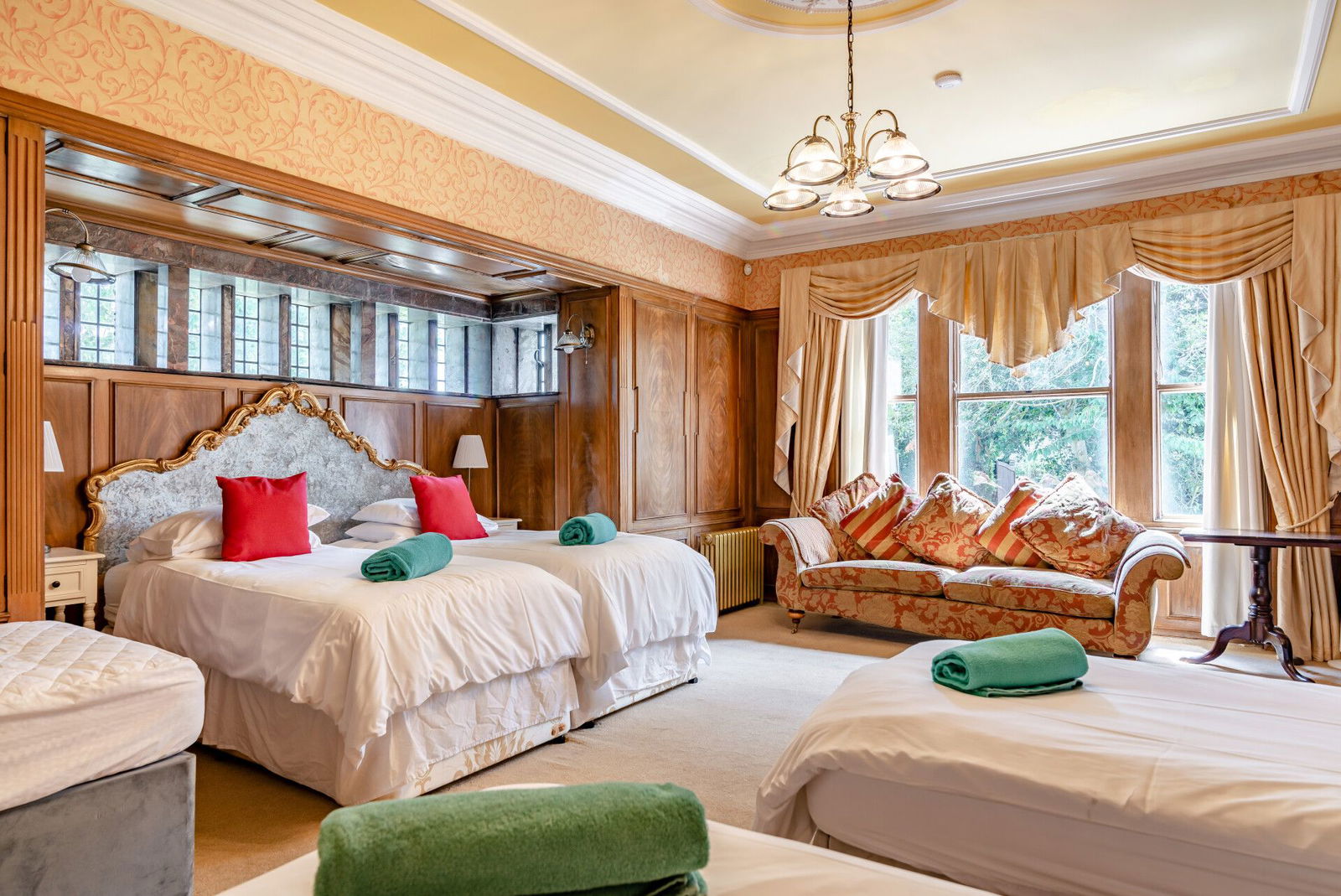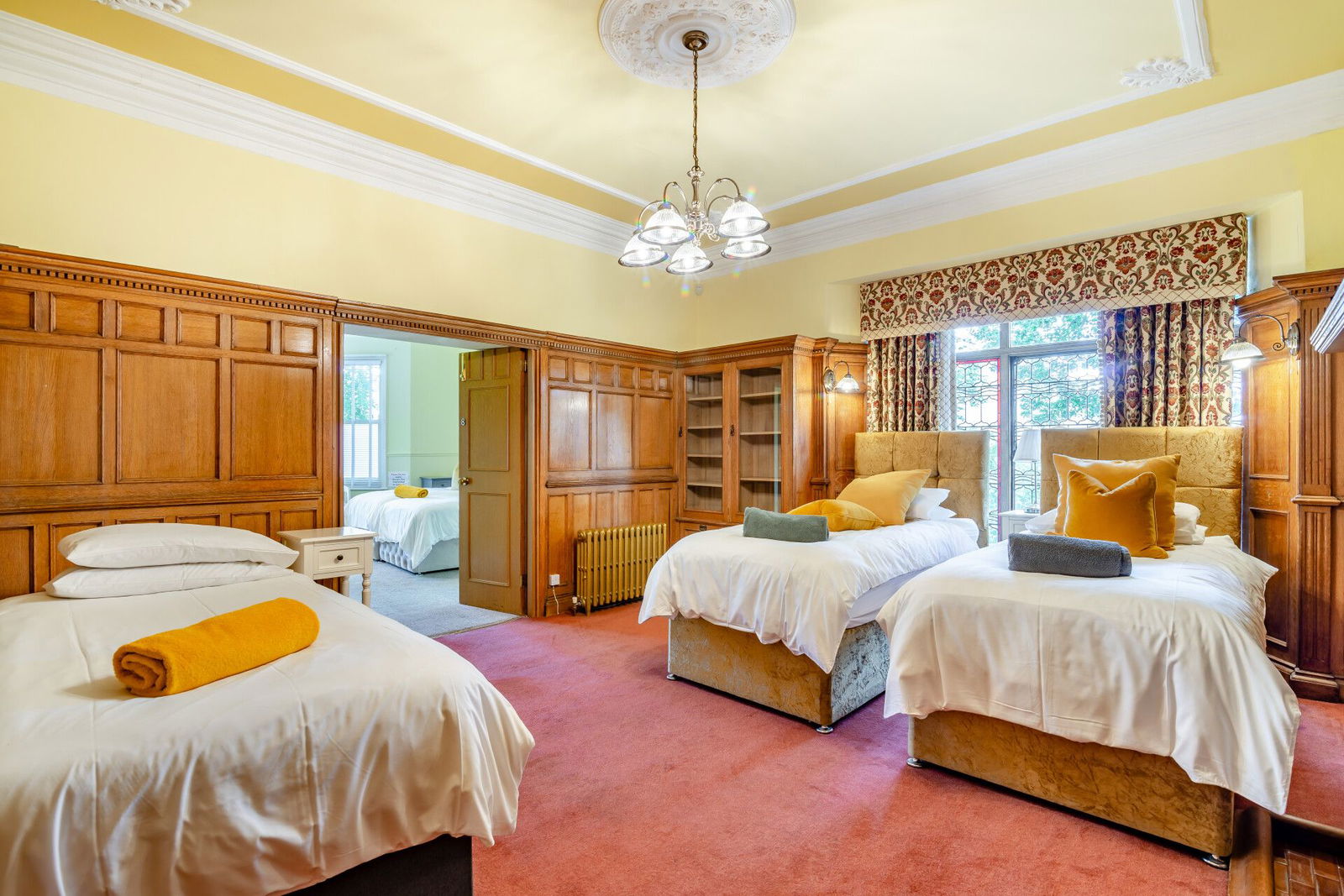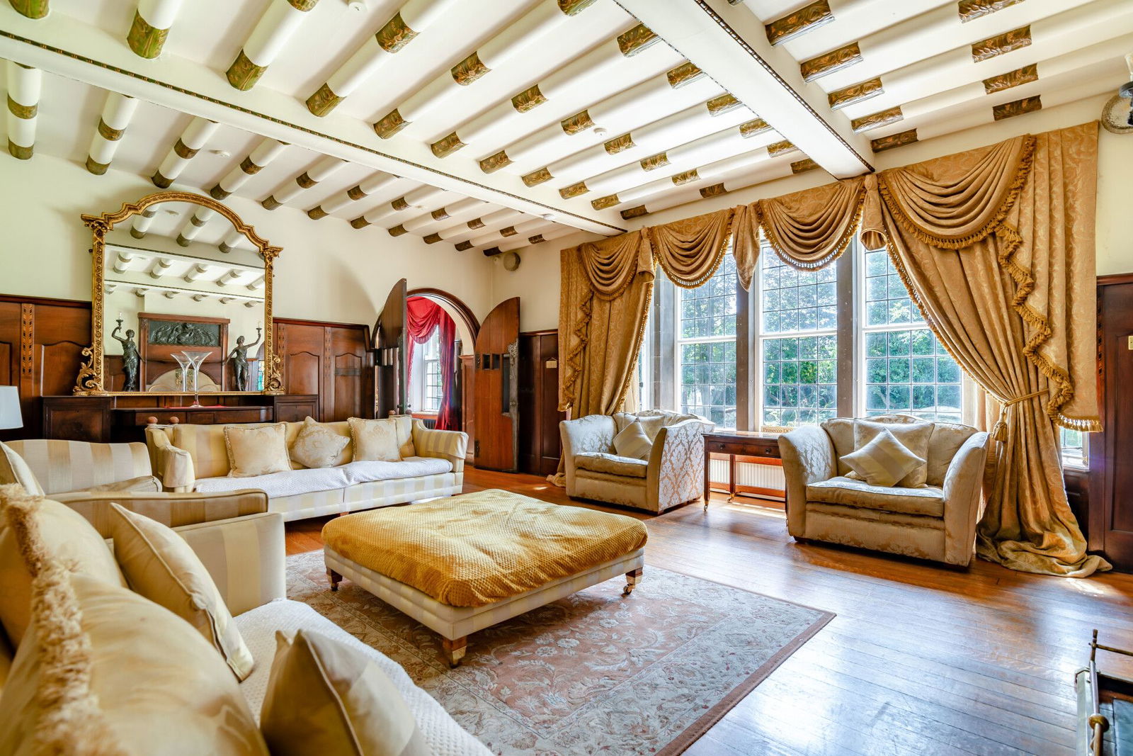 A generous landing gives access to five double bedrooms, all serviced by en-suite bathrooms; the principal bedroom offers exceptional proportions, positioned to the front of the home with a huge walk-in Bay window set to stone mullioned surrounds, commanding a stunning view over the gardens, has a walk-in dressing room, en-suite accommodation that incorporates a low flush W.C, a freestanding roll top bath, a shower and a pedestal wash hand basin, has window to the side, oak floorboards, wood panelling to the walls and a large mirror.